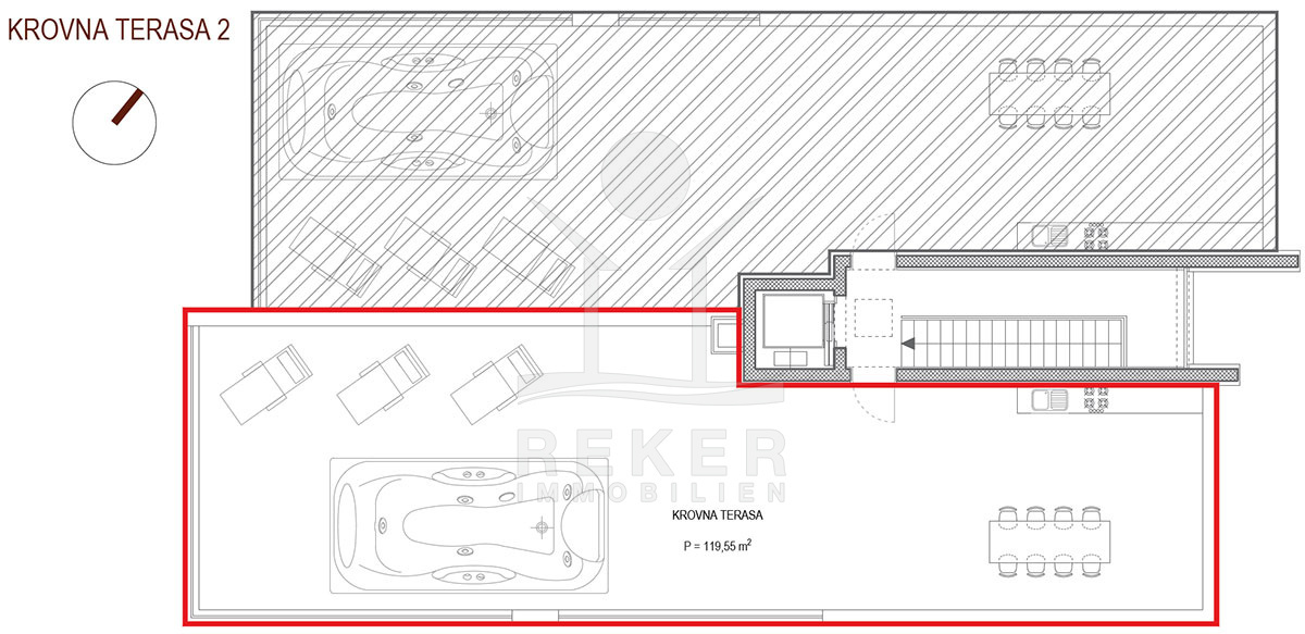 Die großzügige Dachterrasse erstreckt sich über 120 m² und verspricht einen unvergleichlichen Panoramablick, der Ihnen den Atem rauben wird. Genießen Sie hier erholsame Momente, gesellige Zusammenkünfte oder romantische Abende inmitten einer malerischen Umgebung. Diese Terrasse bietet den perfekten Ort, um die Schönheit des Meeres und die Umgebung zu bewundern und Ihr Leben in vollen Zügen zu genießen. Tauchen Sie ein in dieses mediterrane Paradies und lassen Sie Ihre Träume wahr werden!