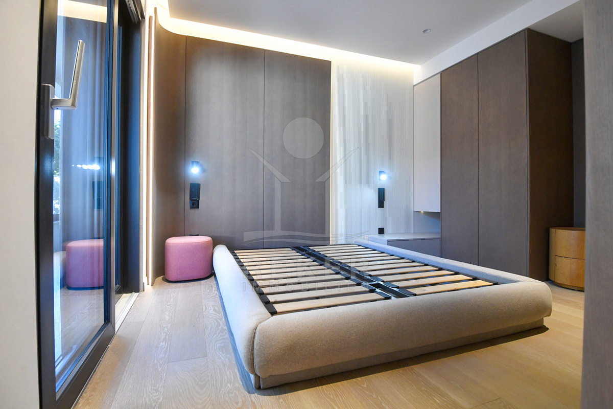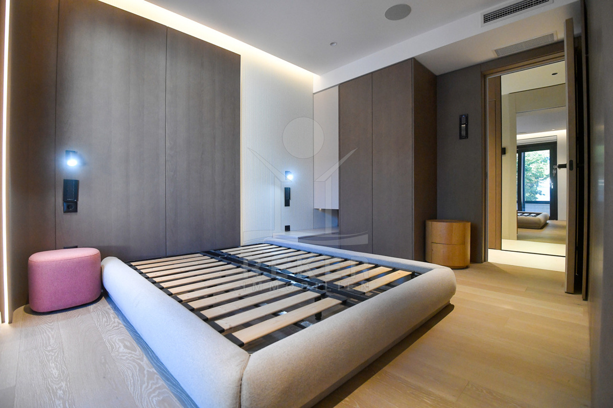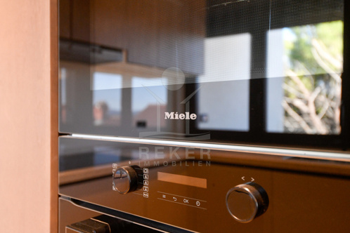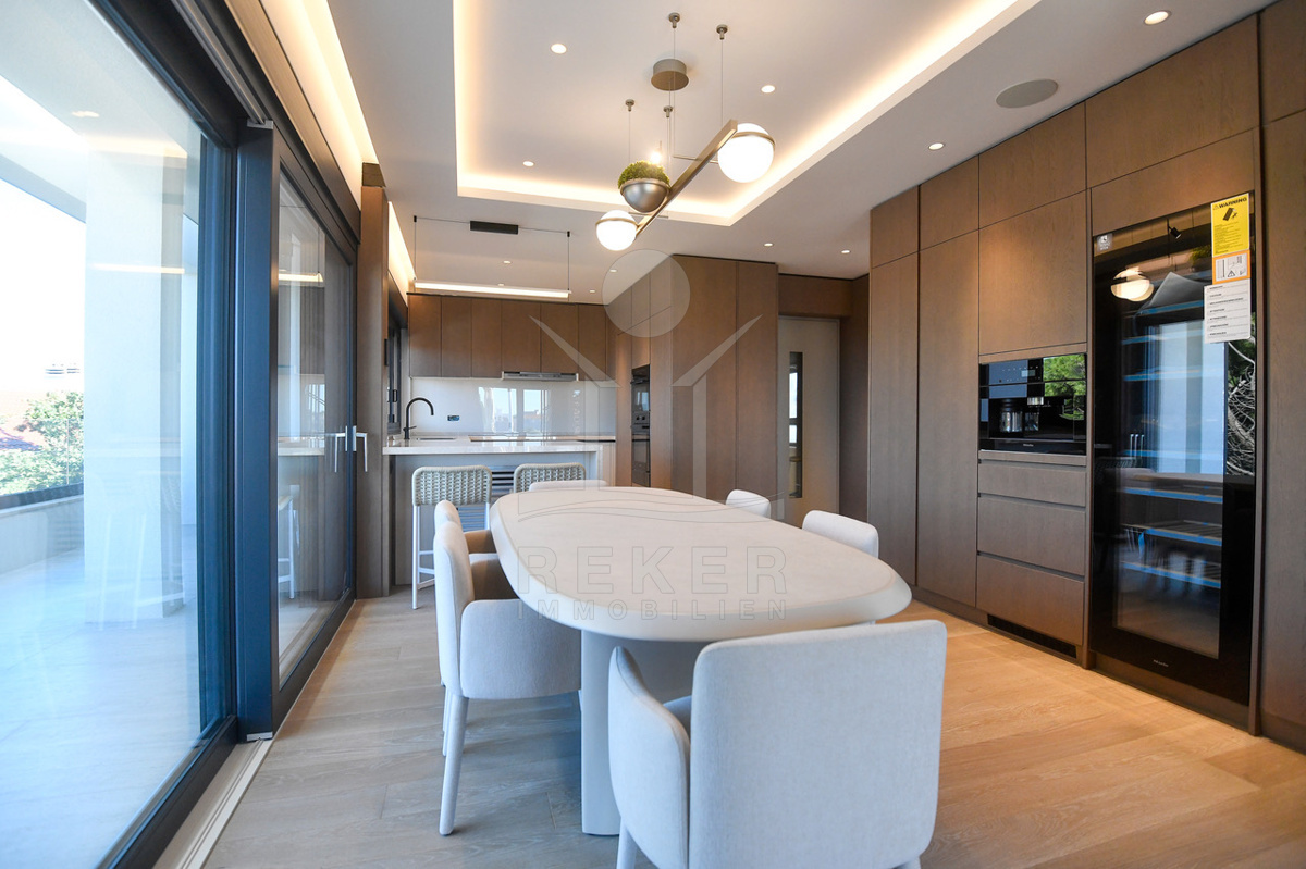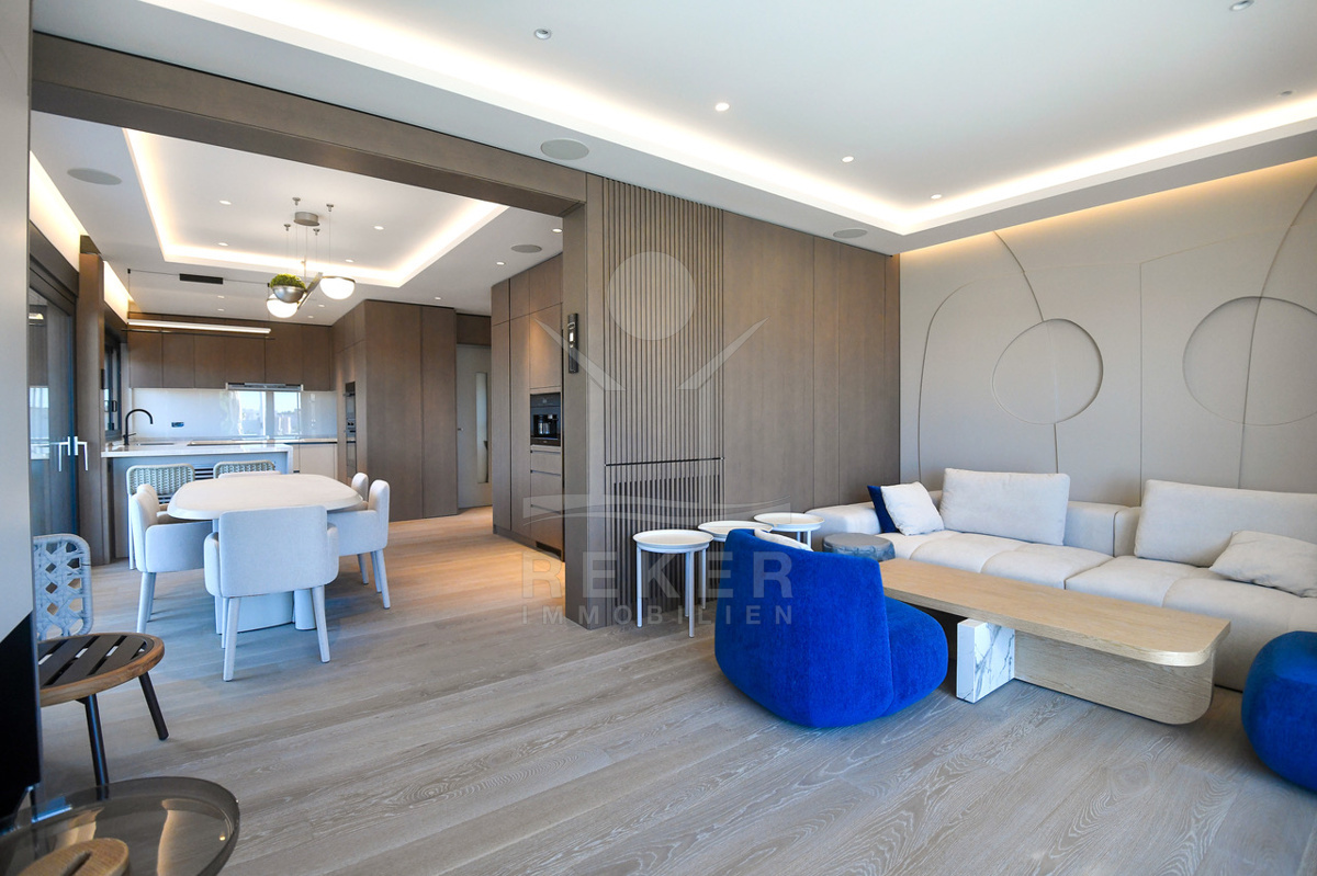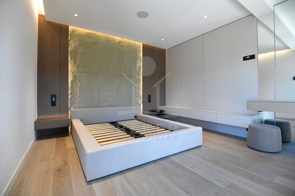 Das Herzstück liegt auf der mittleren Ebene: Wohnbereich, Essplatz und Küche verschmelzen zu einem offenen Raum mit fast 50 m². Die Küche? Miele-Geräte, Kücheninsel mit LED und Naturstein. Der Rest: maßgefertigte Möbel, Dampfkamin, Fußbodenheizung. Zwei große Terrassen, zwei Balkone, alles mit Glasfassaden und Blick nach draußen. Wer einmal drin ist, will nicht wieder raus.