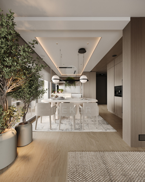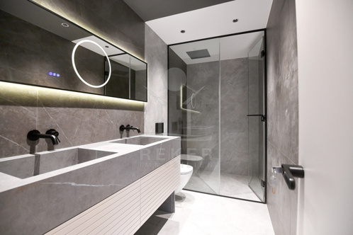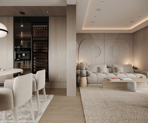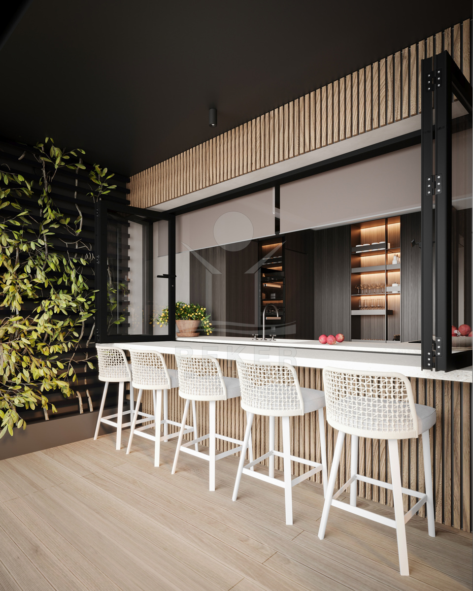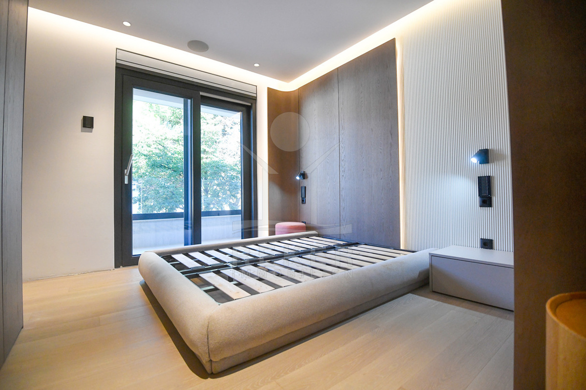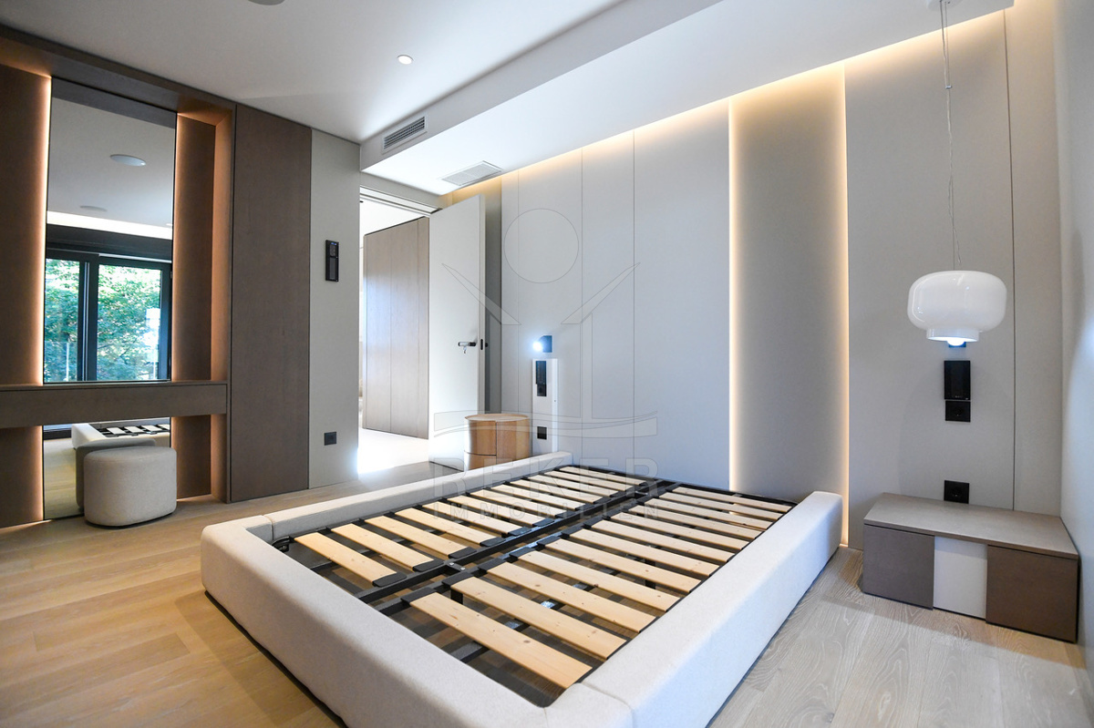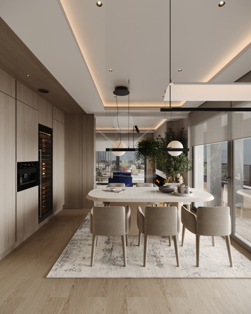 Das Herzstück liegt auf der mittleren Ebene: Wohnbereich, Essplatz und Küche verschmelzen zu einem offenen Raum mit fast 50 m². Die Küche? Miele-Geräte, Kücheninsel mit LED und Naturstein. Der Rest: maßgefertigte Möbel, Dampfkamin, Fußbodenheizung. Zwei große Terrassen, zwei Balkone, alles mit Glasfassaden und Blick nach draußen. Wer einmal drin ist, will nicht wieder raus.