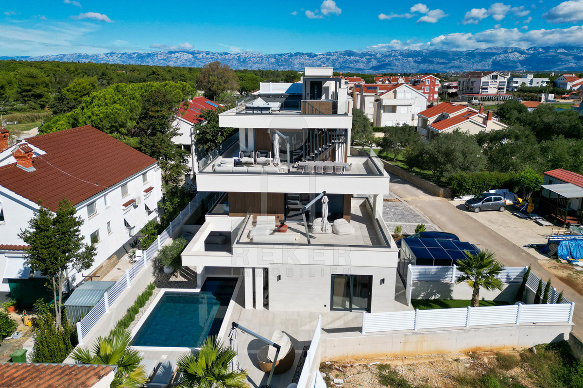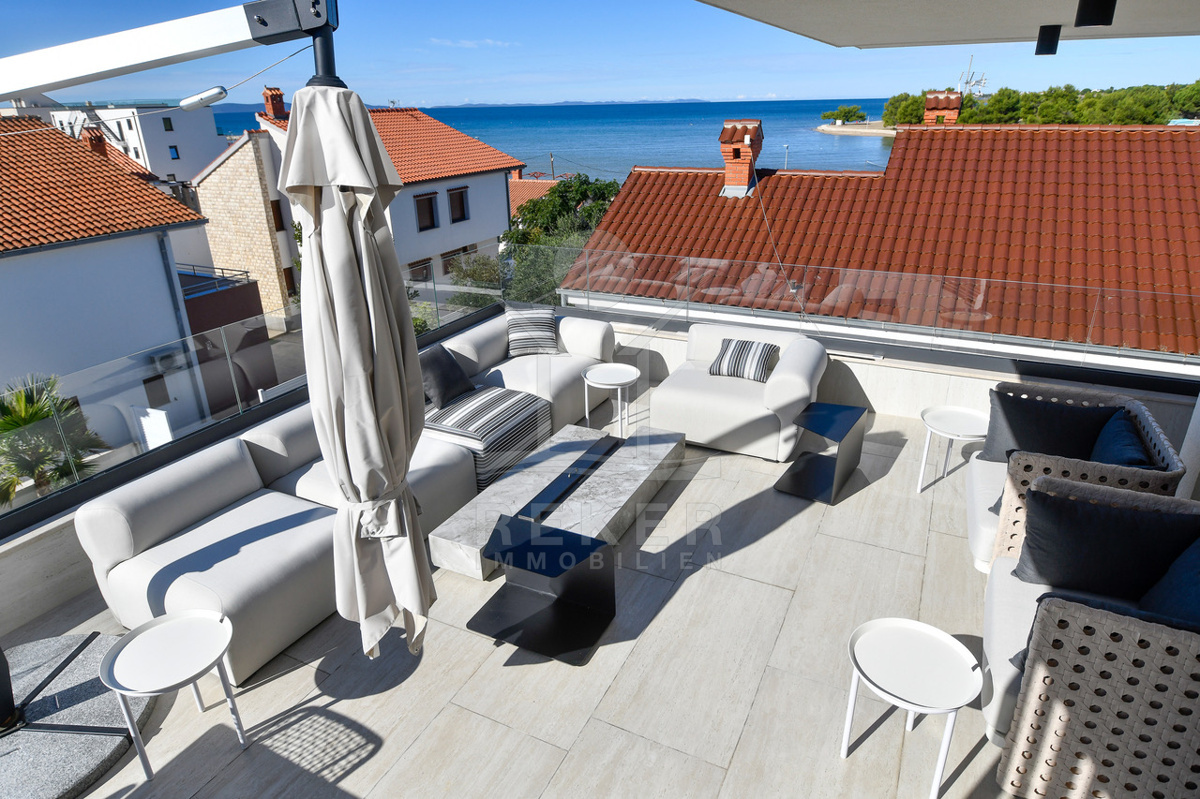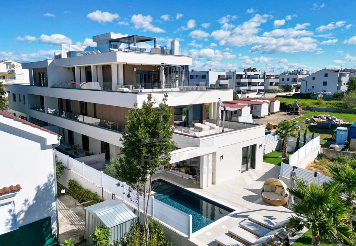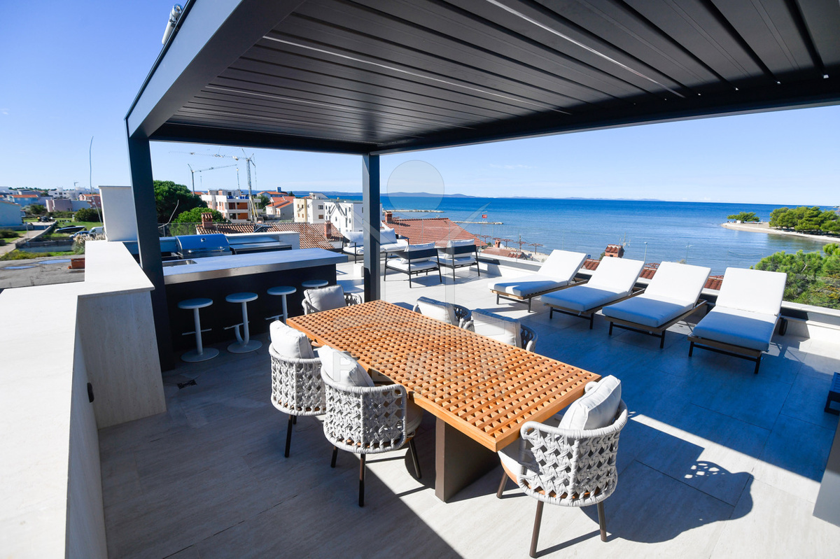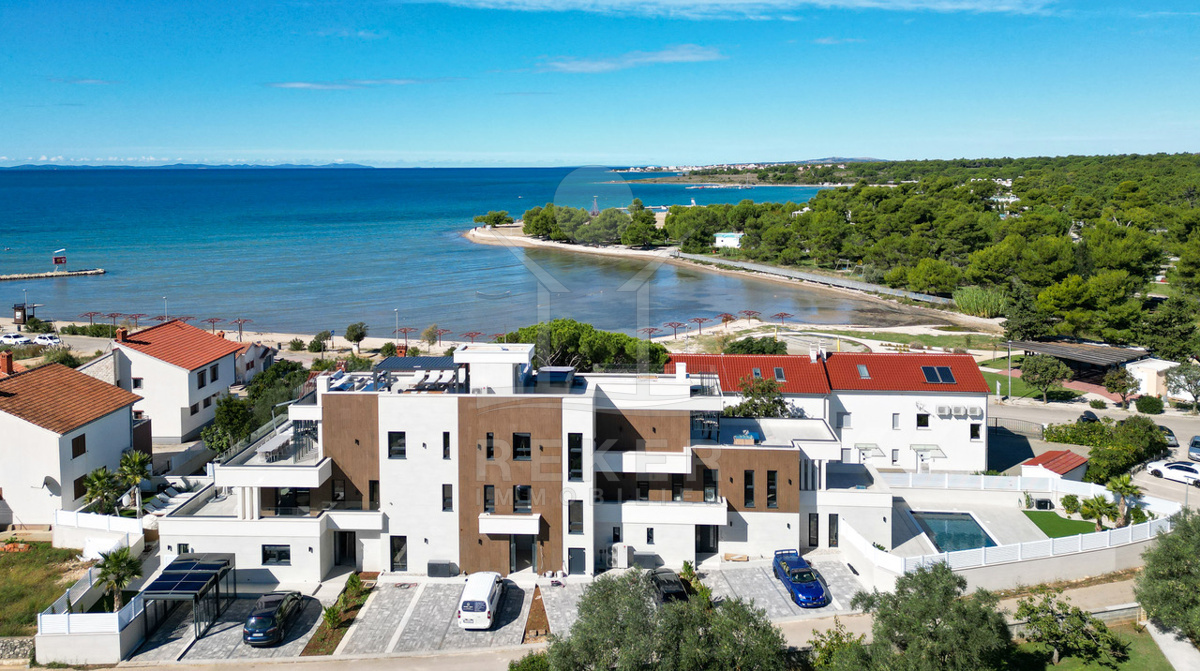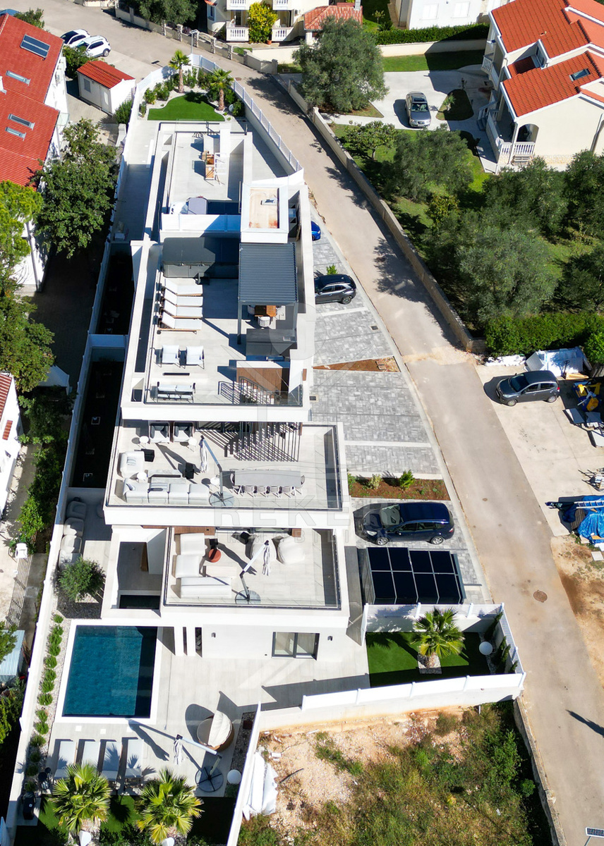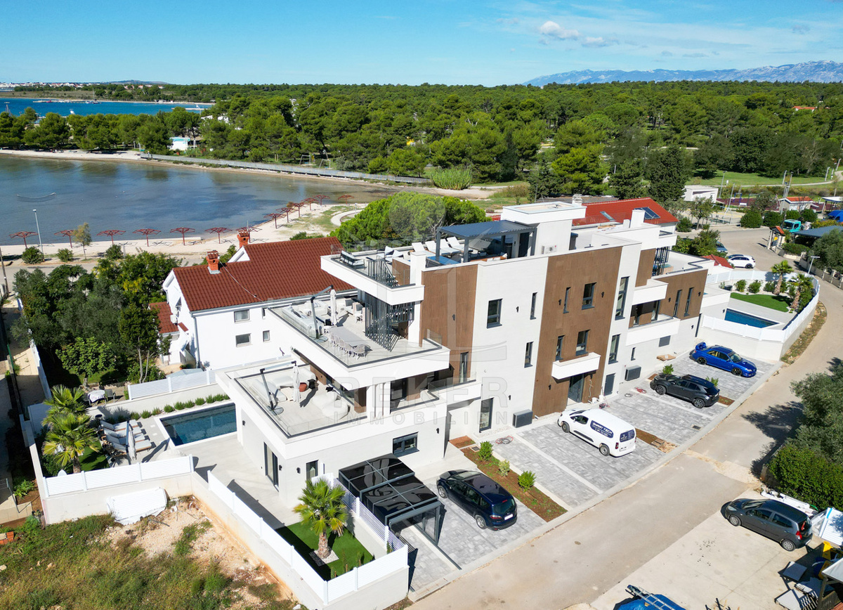 Nur 50 Meter zum Meer. Kristallklares Wasser direkt vor der Tür. Entlang der Promenade reiht sich eine Handvoll eleganter Anwesen – dazwischen: dieses Projekt. Ein Rückzugsort mit Stil, in einer ruhigen, sonnigen Küstenlage bei Zadar. Das Gebäude selbst ist ein Statement. Schlichte Form, edle Materialien, klare Geometrie. Naturstein trifft auf vertikale Holzlamellen, ergänzt durch Glas und dunkle Metallakzente. Tagsüber ruhig und hell – abends stilvoll beleuchtet. Vier exklusive Wohnungen, alle mit eigenem Außenbereich. Zwei mit Garten und Pool. Zwei mit Dachterrasse und Whirlpool. Dazu: Lift, Garage, Smart-Home, Premium-Ausstattung!