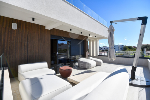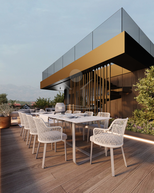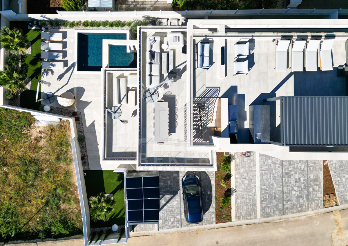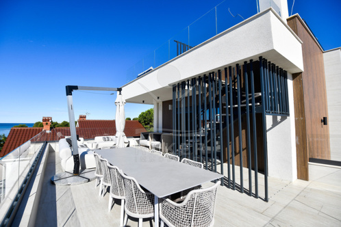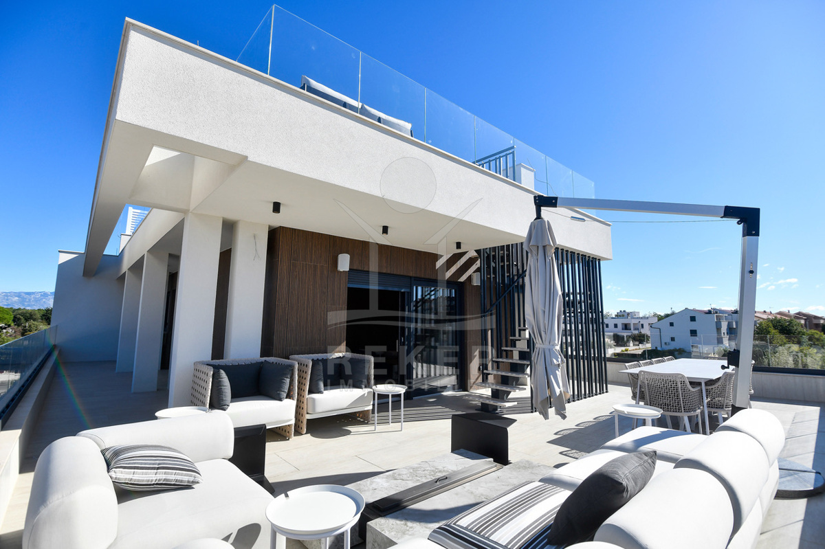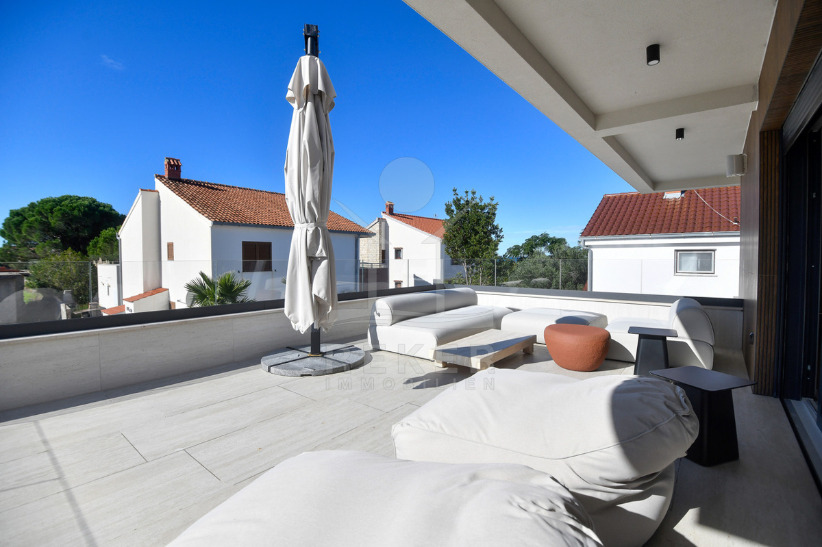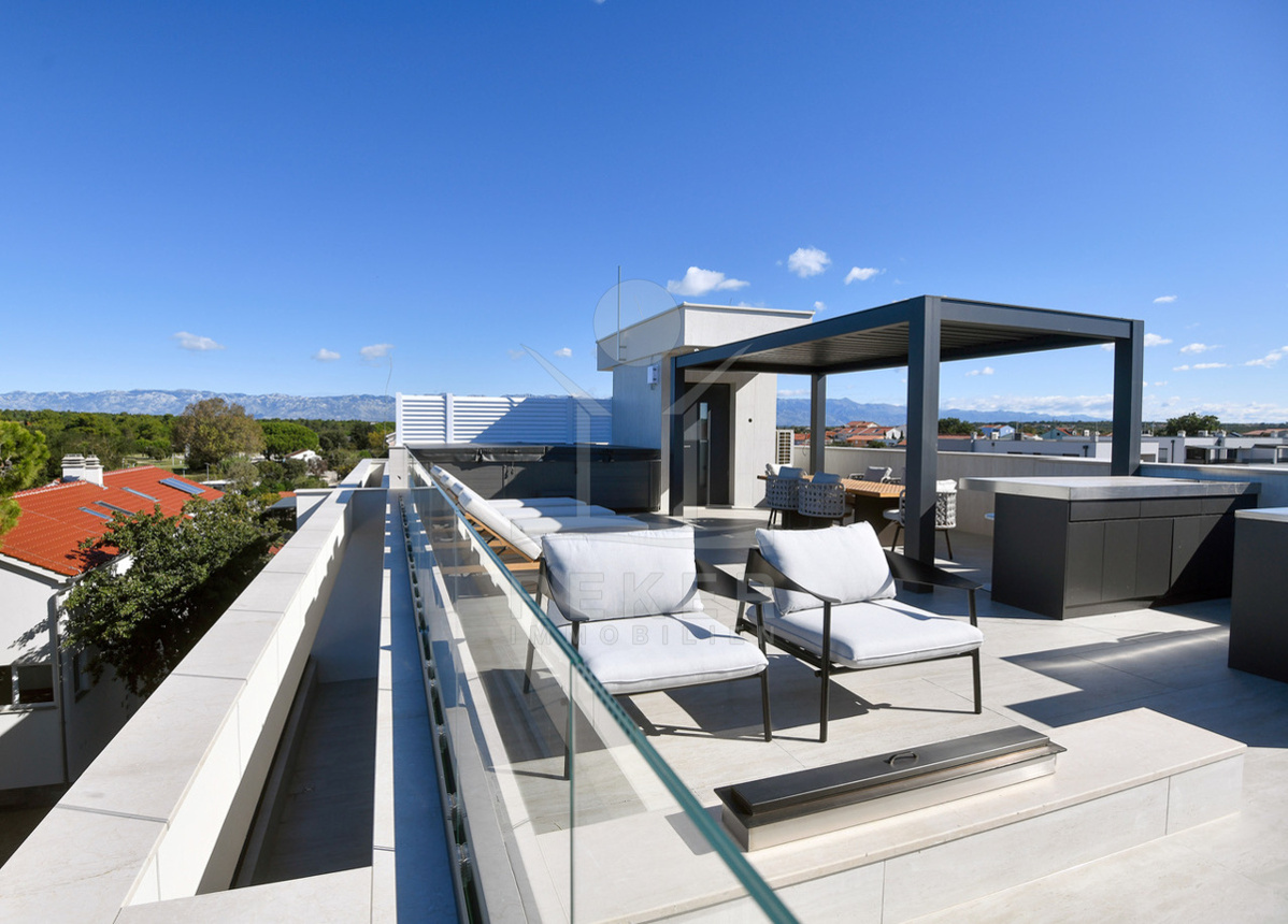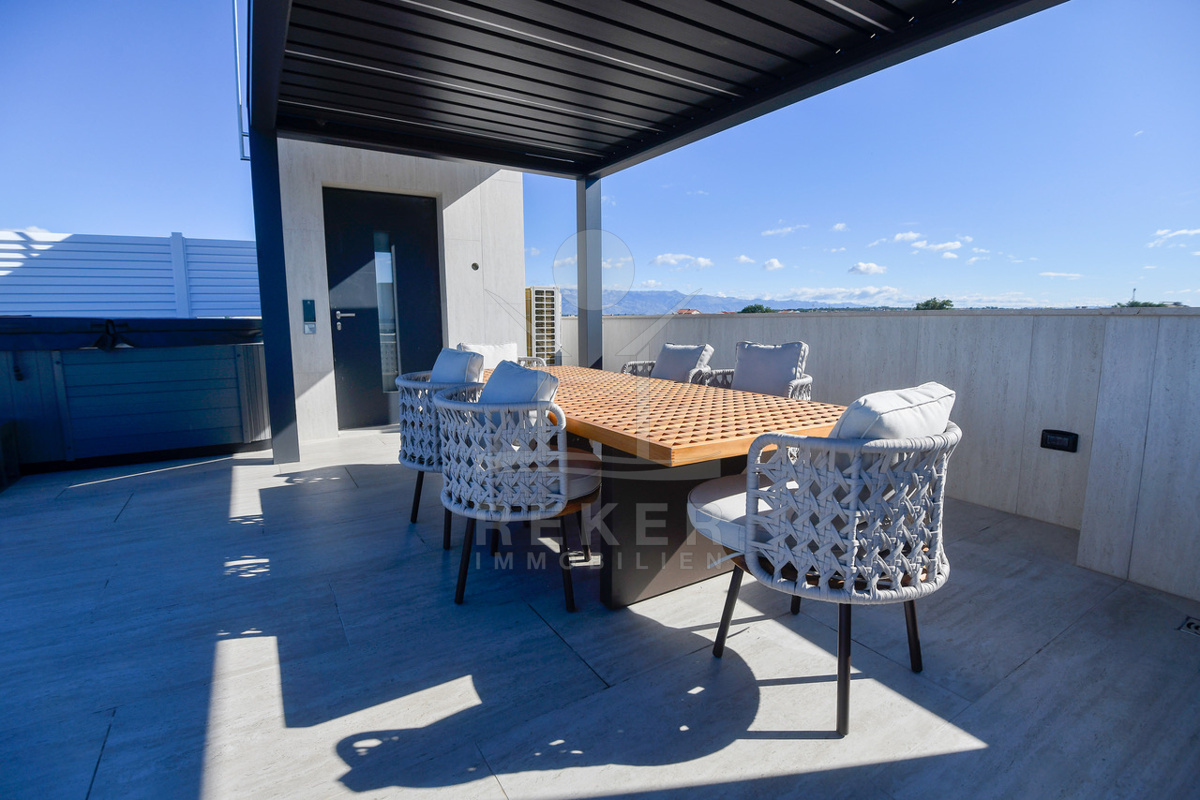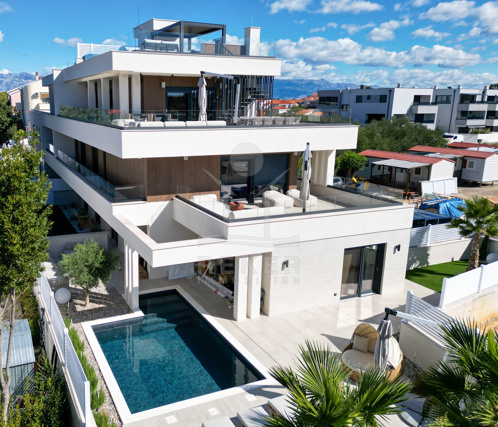 Nur 50 Meter zum Meer. Kristallklares Wasser direkt vor der Tür. Entlang der Promenade reiht sich eine Handvoll eleganter Anwesen – dazwischen: dieses Projekt. Ein Rückzugsort mit Stil, in einer ruhigen, sonnigen Küstenlage bei Zadar. Das Gebäude selbst ist ein Statement. Schlichte Form, edle Materialien, klare Geometrie. Naturstein trifft auf vertikale Holzlamellen, ergänzt durch Glas und dunkle Metallakzente. Tagsüber ruhig und hell – abends stilvoll beleuchtet. Vier exklusive Wohnungen, alle mit eigenem Außenbereich. Zwei mit Garten und Pool. Zwei mit Dachterrasse und Whirlpool. Dazu: Lift, Garage, Smart-Home, Premium-Ausstattung!