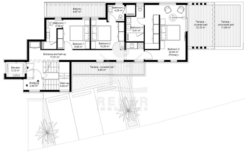 Der erste Eindruck zählt und hier beginnt er direkt im Aufzug, der Sie privat bis in Ihre Wohnung bringt. Gleich nach dem Eingang öffnet sich ein heller Flur mit elegantem Lichtkonzept. Drei Schlafzimmer liegen im unteren Bereich der Wohnung, jedes mit eigenem Bad. Das größte davon: ein echtes Master-Schlafzimmer mit begehbarem Schrank, viel Platz und Zugang zur Terrasse. Alle Bäder sind hochwertig ausgestattet, mit ebenerdigen Duschen, Hansgrohe-Armaturen und Fußbodenheizung. Ein eigenes Gäste-WC, ein Abstellraum sowie ein separater Waschraum mit Waschmaschine und Trockner machen den Alltag angenehm praktisch.