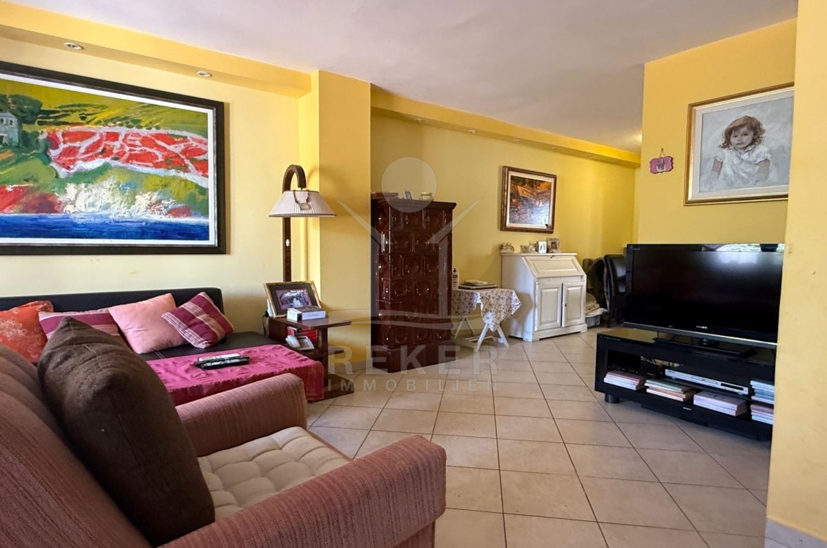 Im Erdgeschoss empfängt Sie ein gemütliches Wohnzimmer mit Essbereich, dazu die helle, funktional eingerichtete Küche mit direktem Zugang zum Garten. Es gibt auch einen kleinen Abstellraum und natürlich eine Klimaanlage. Eine Etage höher befinden sich zwei Schlafzimmer – eines davon mit Zugang zum Balkon – sowie das Badezimmer. Vom Balkon oben reicht der Blick bis zum Meer.