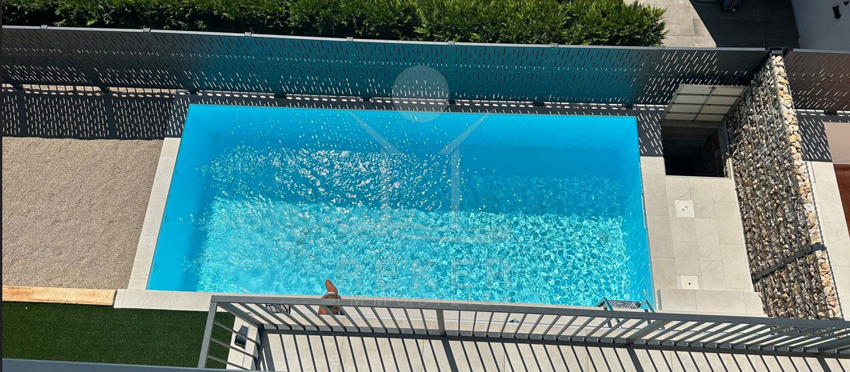 Die geräumige 33 m² große Terrasse im Außenbereich lädt zum Entspannen und Genießen der Sonne ein. Vom Wohnzimmer aus haben Sie direkten Zugang zu einem 24 m² großen Swimmingpool, der an heißen Tagen für Erfrischung sorgt. Diese luxuriöse Immobilie bietet nicht nur modernes Wohnen, sondern auch ein entspanntes Lebensgefühl im Freien. Hier können Sie die Vorzüge eines komfortablen Zuhauses voll und ganz genießen.