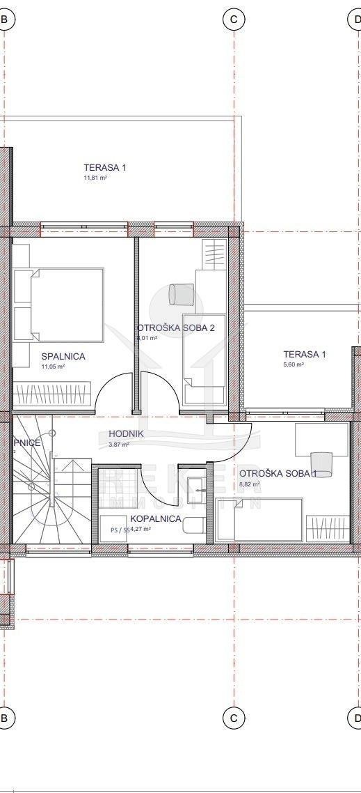 Das Haus ist mit einer Klimaanlage ausgestattet. Das Erdgeschoss verfügt über einen offenen Wohn-, Ess- und Küchenbereich mit einer Fläche von 29 m² und einen Zugang auf die Terrasse und den Pool. Die zweite Etage besteht aus drei Räumen, von denen einer mit einer Fläche von 11 m² größer ist und zwei kleinere Räume, die als Kinderzimmer gedacht sind, 9 m² und 8 m² groß sind, sowie einem Badezimmer von 4 m² und einem Balkon von 12 m². Im Dachgeschoss befindet sich ein großes Schlafzimmer von 11 m² und eine Dachterrasse die wunderschönen Blick auf das Meer bietet.