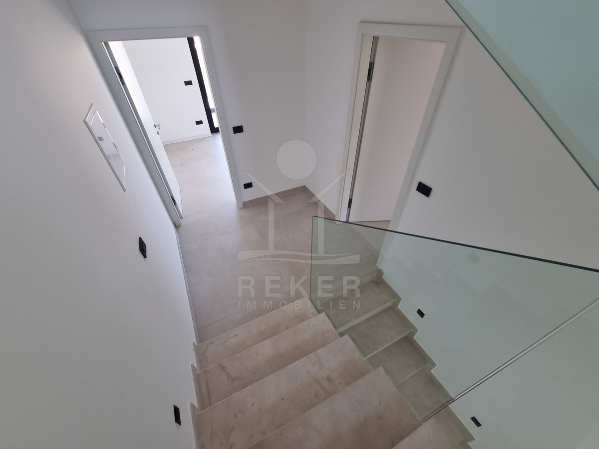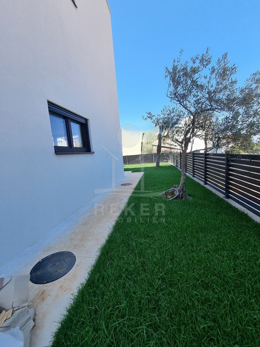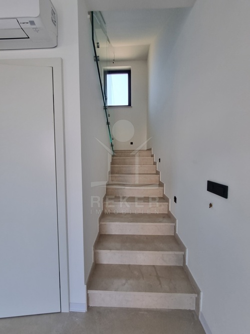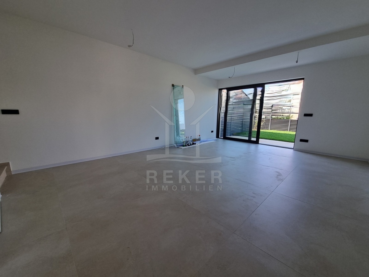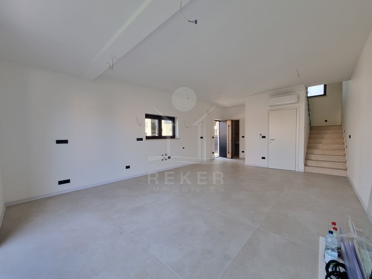 Nur einen Kilometer vom Meer entfernt, in einem ruhigen Teil von Poreč, steht dieses moderne Reihenhaus auf drei Etagen. Die Umgebung ist angenehm zurückgezogen, ohne Durchgangsverkehr. Zwei private Stellplätze gehören dazu – direkt am Haus, ganz ohne Parkplatzsuche.
