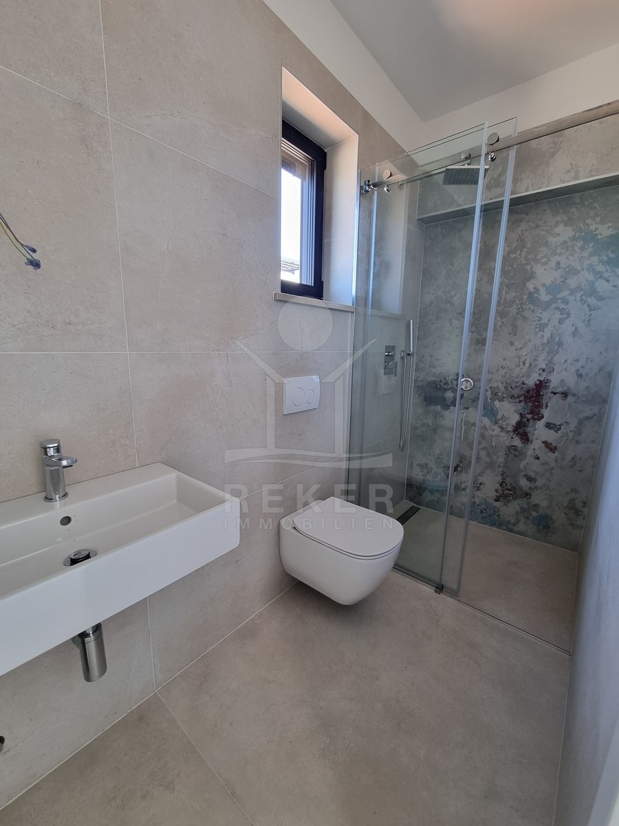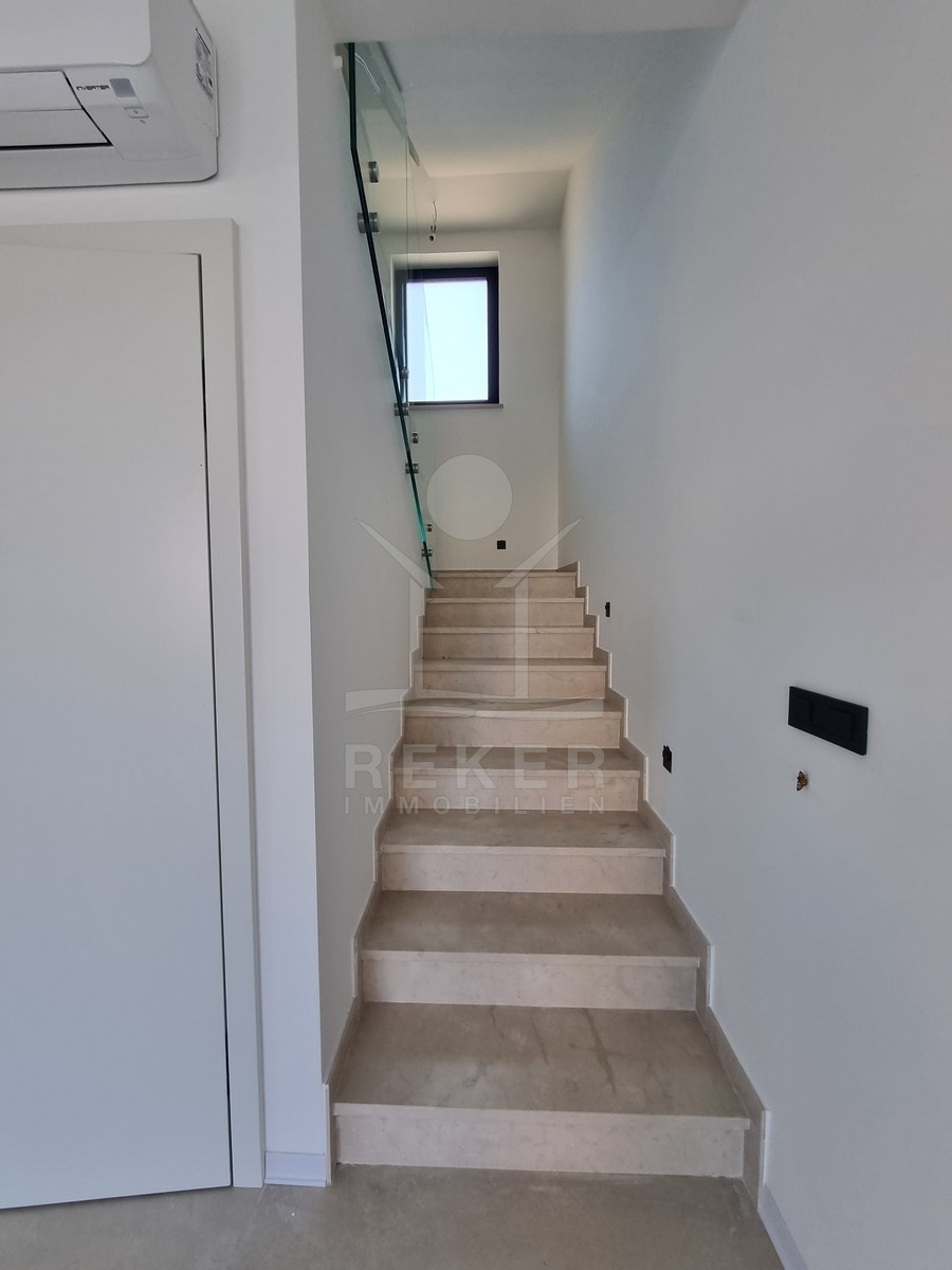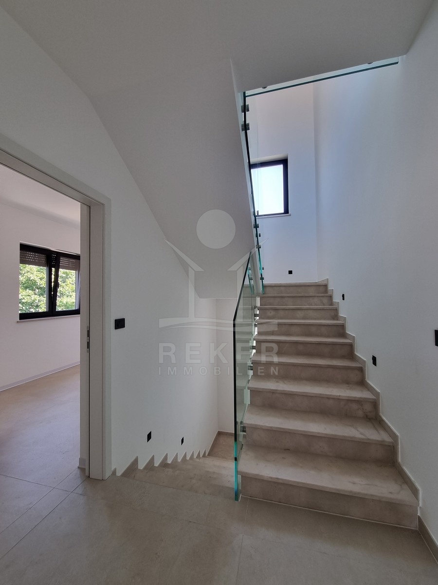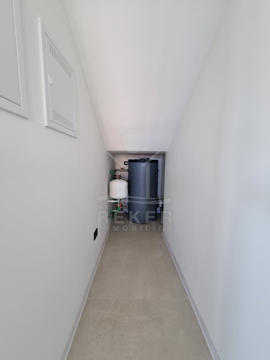 Nur einen Kilometer vom Meer entfernt, in einem ruhigen Teil von Poreč, steht dieses moderne Reihenhaus auf drei Etagen. Die Umgebung ist angenehm zurückgezogen, ohne Durchgangsverkehr. Zwei private Stellplätze gehören dazu – direkt am Haus, ganz ohne Parkplatzsuche.