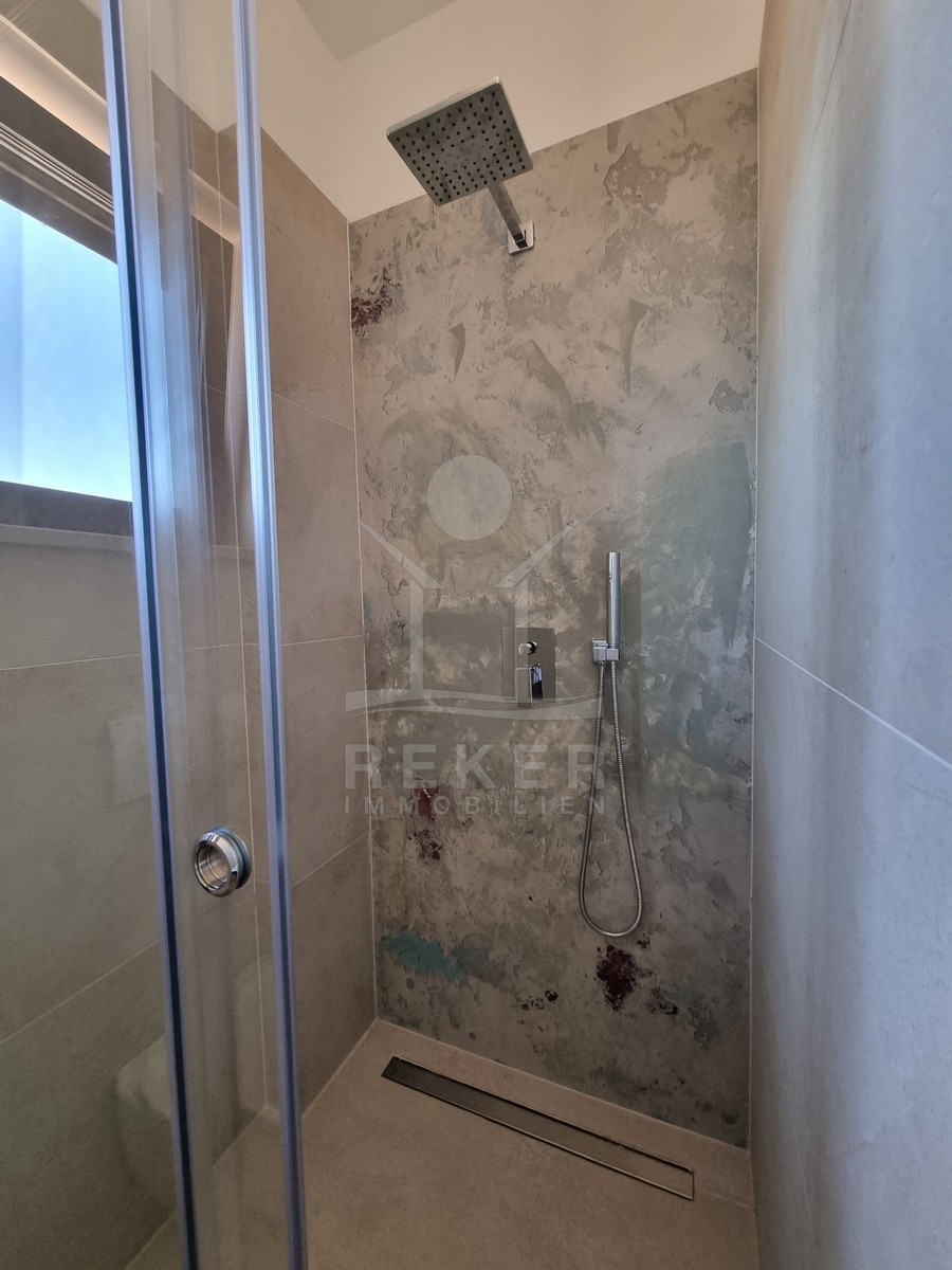 Im ersten Obergeschoss befinden sich zwei Schlafzimmer, jeweils mit eigenem Bad. Ein hat Zugang zum großzügigen Balkon – halb überdacht, halb offen. Ideal für die erste Tasse Kaffee am Morgen oder entspannte Abende draußen. Ganz oben liegt das dritte Schlafzimmer mit Bad. Auch hier ein Highlight: der große Balkon mit Jacuzzi und Meerblick. Mehr Privatsphäre geht kaum.