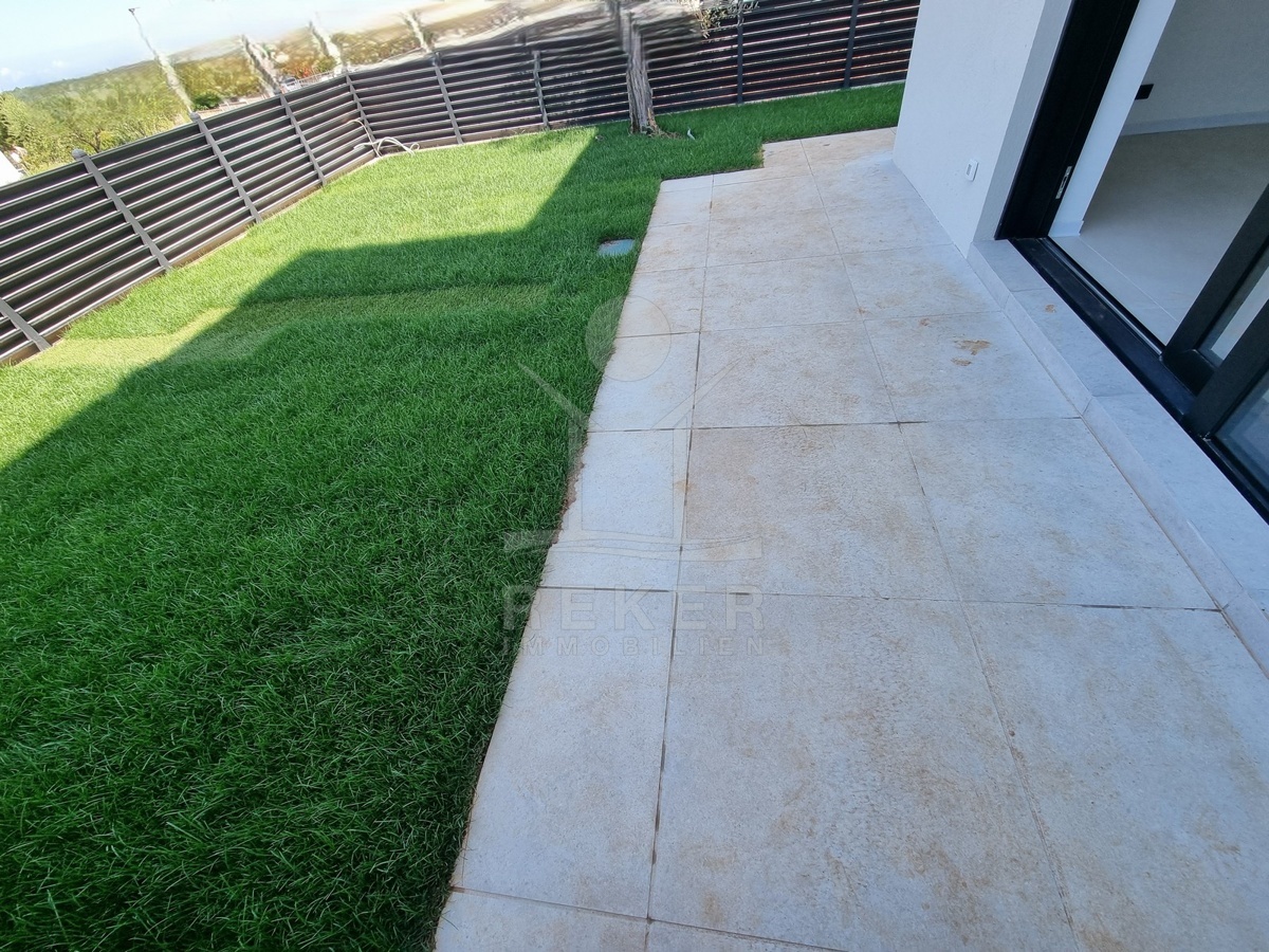 Der Garten misst rund 150 m². Er ist eingefriedet und pflegeleicht gestaltet – mit Kiesbeeten, einem Olivenbaum und sattem Rasen. Die Terrasse im Erdgeschoss geht nahtlos in den Wohnbereich über. Mit über zehn Quadratmetern bietet sie viel Platz für einen großen Tisch oder Liegen. Wer lieber in den oberen Etagen draußen ist: Es gibt gleich zwei weitere Balkone – einer davon mit freiem Meerblick und Jacuzzi.