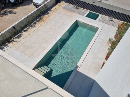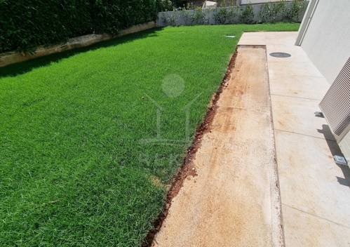 Die 150 m² große Gartenfläche bietet viel Platz für Bewegung, Spiel oder einfach zum Entspannen. Im Zentrum steht ein 24 m² großer Pool mit hell gefliestem Rand, eingerahmt von Olivenbäumen und gepflegtem Rasen. Die Terrasse im Erdgeschoss schließt direkt an den Wohnbereich an. Hier verschmelzen Innen und Außen. Ideal für Frühstück an der Sonne oder lange Abende mit Freunden.