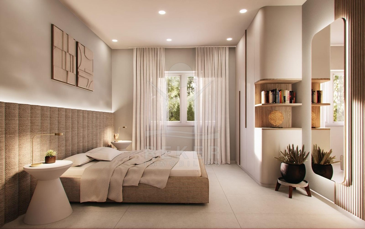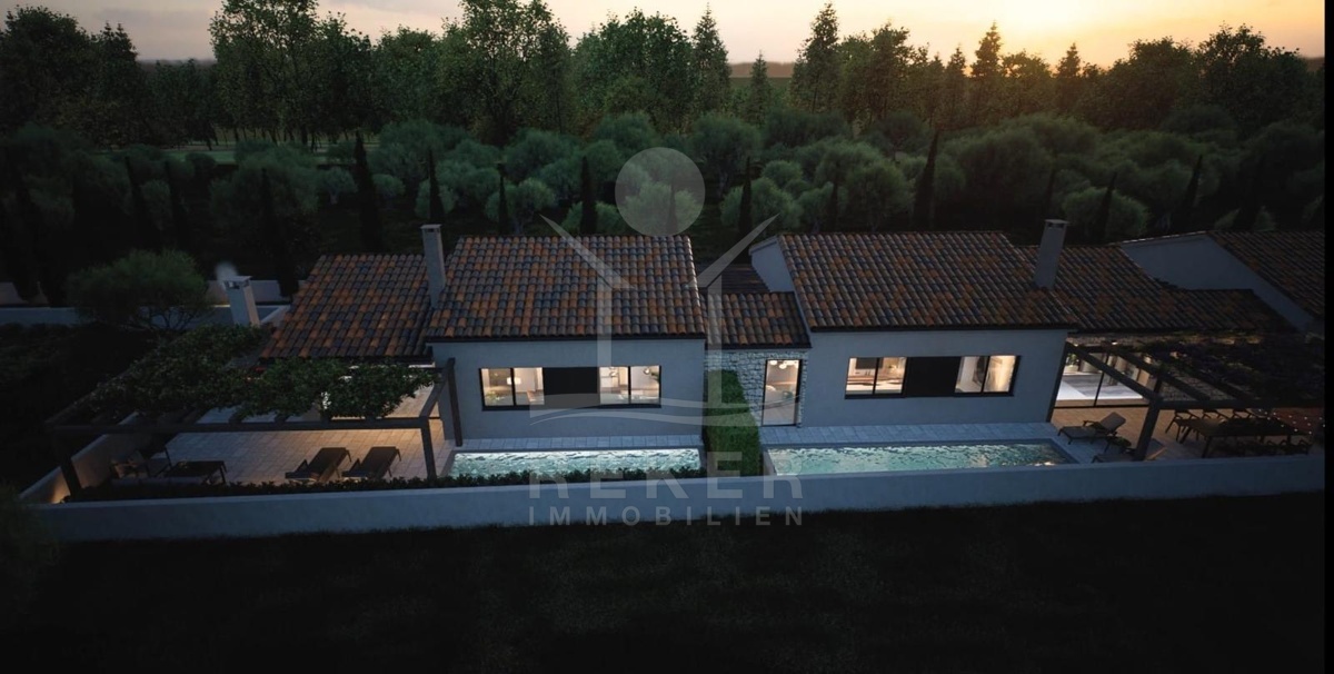 In einer ruhigen, grünen Gegend Istriens, rund 12 Kilometer von Poreč und etwa 6 Kilometer vom Meer entfernt, entsteht ein moderner Reihenhauskomplex mit drei Wohneinheiten. Hier erleben Sie das Beste aus zwei Welten: die Nähe zur Küste und die Stille des istrischen Hinterlands. Vor jedem Haus steht ein eigener Parkplatz, bequem und praktisch zugleich.