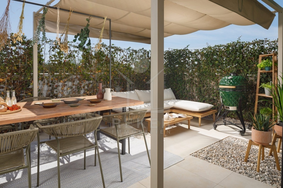 Das schöne Reihenhaus aus dem Jahr 2024 erstreckt sich über zwei Etagen und bietet eine Wohnfläche von 83 m². Mit einem großzügigen, umzäunten Garten von 137 m² ist Privatsphäre garantiert. Highlights sind die Klimaanlage, Fußbodenheizung und der einladende Kellerraum und eine Speisekammer, ideal für gesellige Zusammenkünfte. Perfekt für Familien mit eigenen Parkplätzen für zwei Autos!