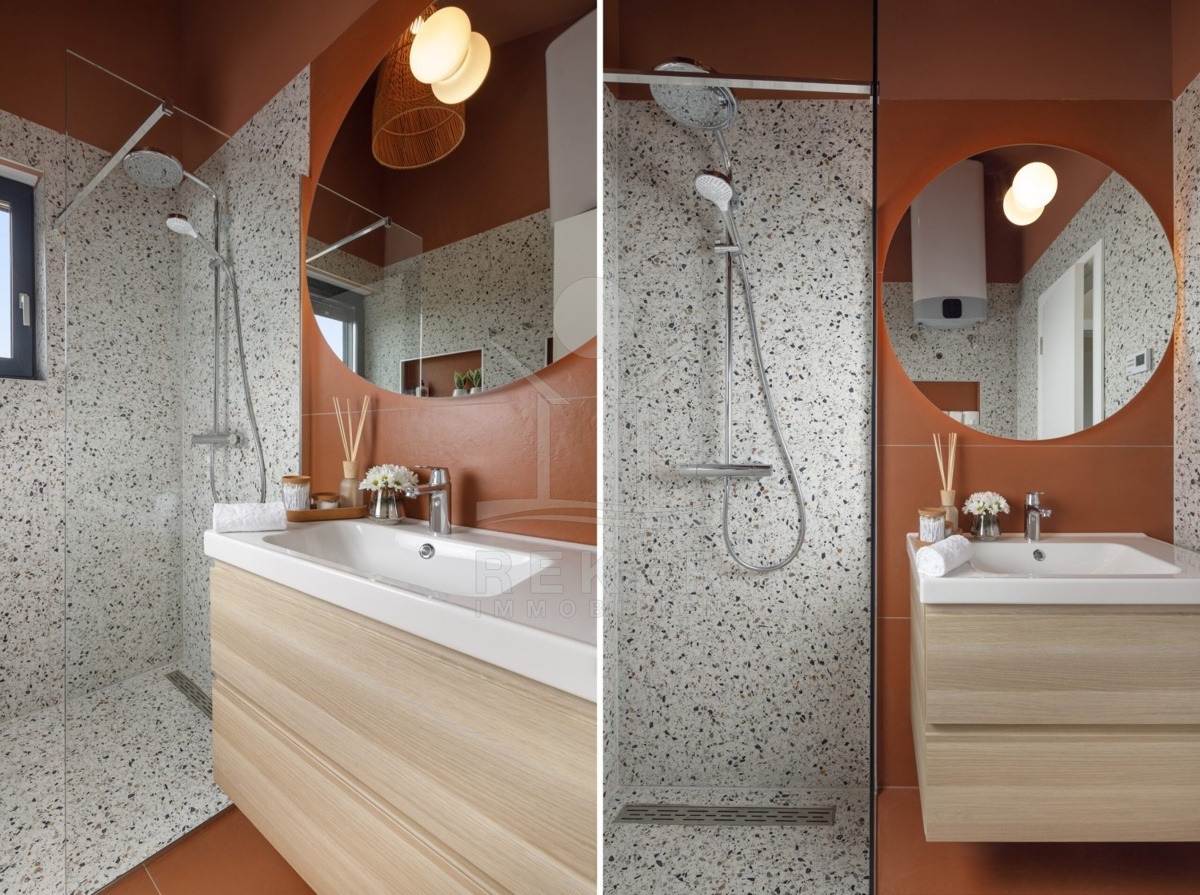Das Haus in Poreč besticht durch seine ruhige Lage am Ende einer Reihe, das perfekte Gleichgewicht zwischen Ruhe und Nähe zu urbanen Annehmlichkeiten. Die hübsche Umgebung in der Region Istrien sorgt für eine angenehme Lebensqualität, während Sie sich in der Natur entspannen können. Der nächstgelegene organisierte Strand ist nur 900 Meter entfernt und lädt zu erholsamen Stunden am Meer ein. Zudem erreichen Sie das Stadtzentrum von Poreč in wenige Minuten, wo Sie eine Vielzahl von Restaurants, Geschäften und kulturellen Angeboten erwarten.