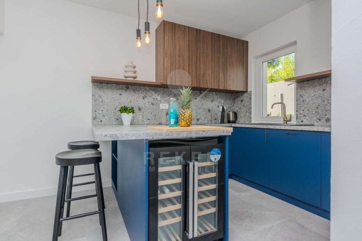 Beim Betreten der Immobilie werden Sie im Zentrum der Immobilie willkommen geheißen - das offene Wohnzimmer mit Panorama auf das Meer, welches Ihnen täglich zu Füßen liegt, bildet das Herz des Reihenhauses. Angrenzend befindet sich die offene Küche mit angrenzendem Essbereich und einer nützlichen Speisekammer.