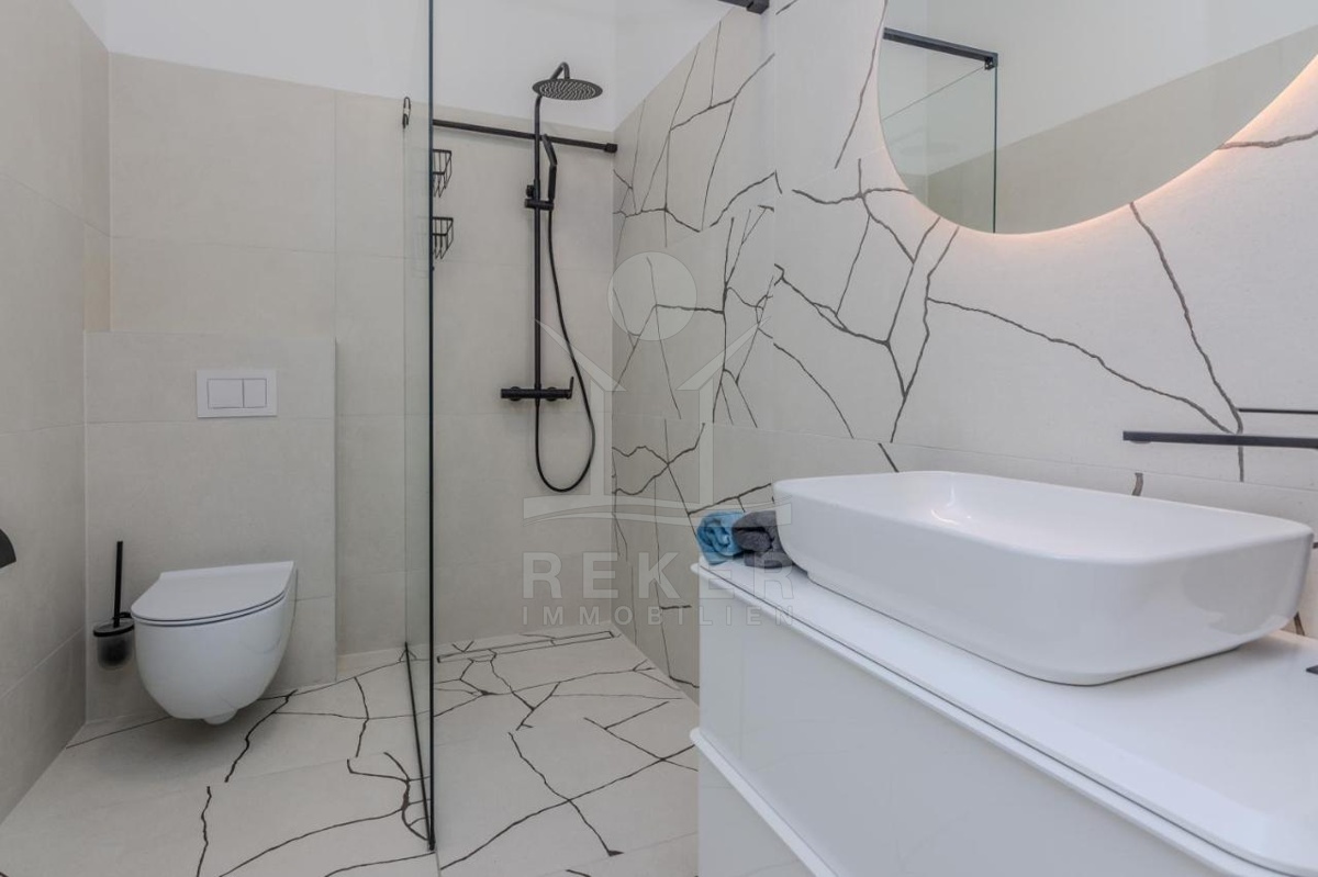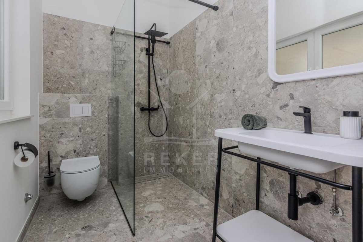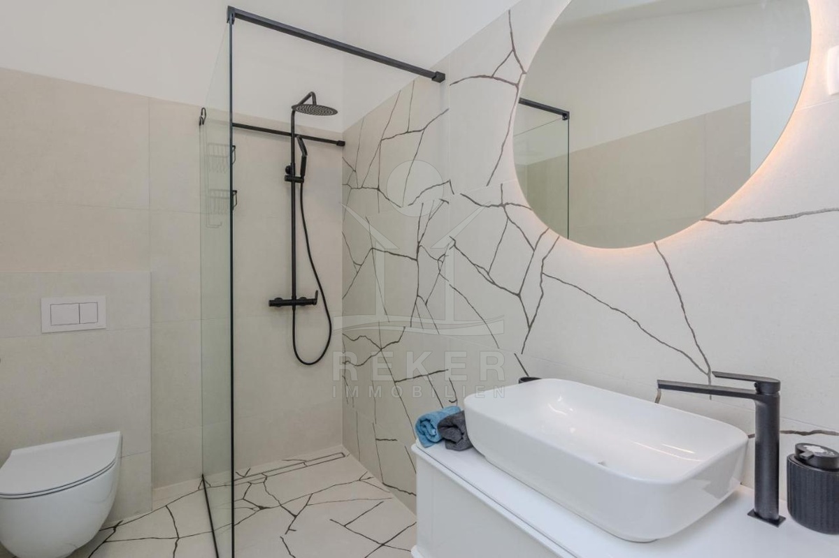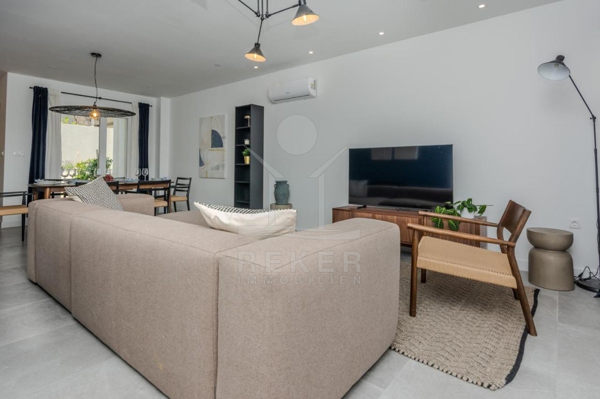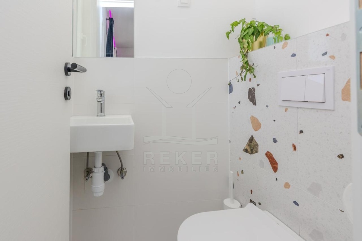 Vom Wohnzimmer gelangen Sie direkt auf die sonnige Terrasse mit Meeresrauschen … ein einmaliger Ort für gemeinsame Momente! Im Obergeschoss verfügen Sie über drei große Schlafzimmer mit einem modernen Familienbad. Das Hauptschlafzimmer verfügt über einige nette Extras, wie ein eigenes Bad und einen direkten Zugang auf die Loggia. Die beiden Bäder und das Gäste-WC im Erdgeschoss erscheinen im hellen Design und hochwertigen Sanitäranlagen, sowie einer gelungenen Kombination aus Holz und geraden Linien.