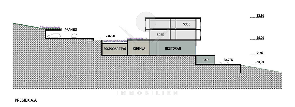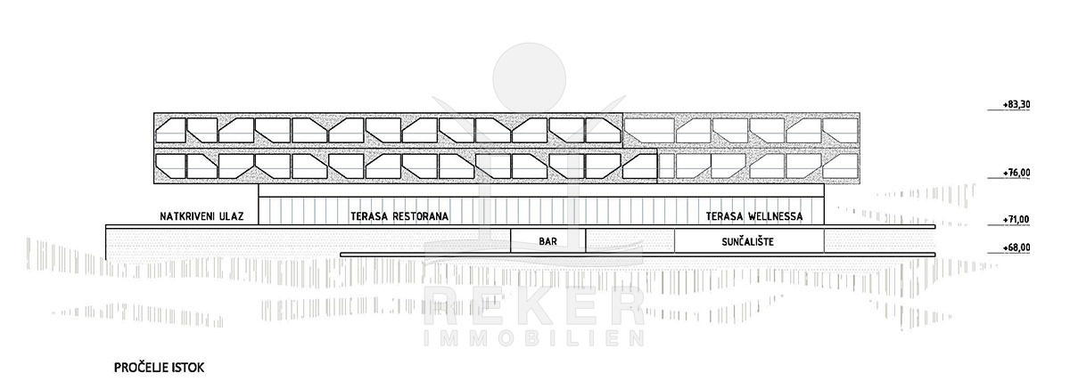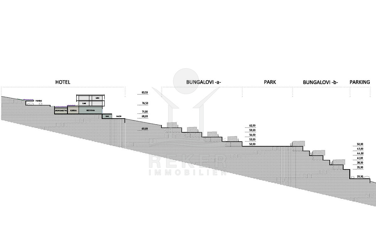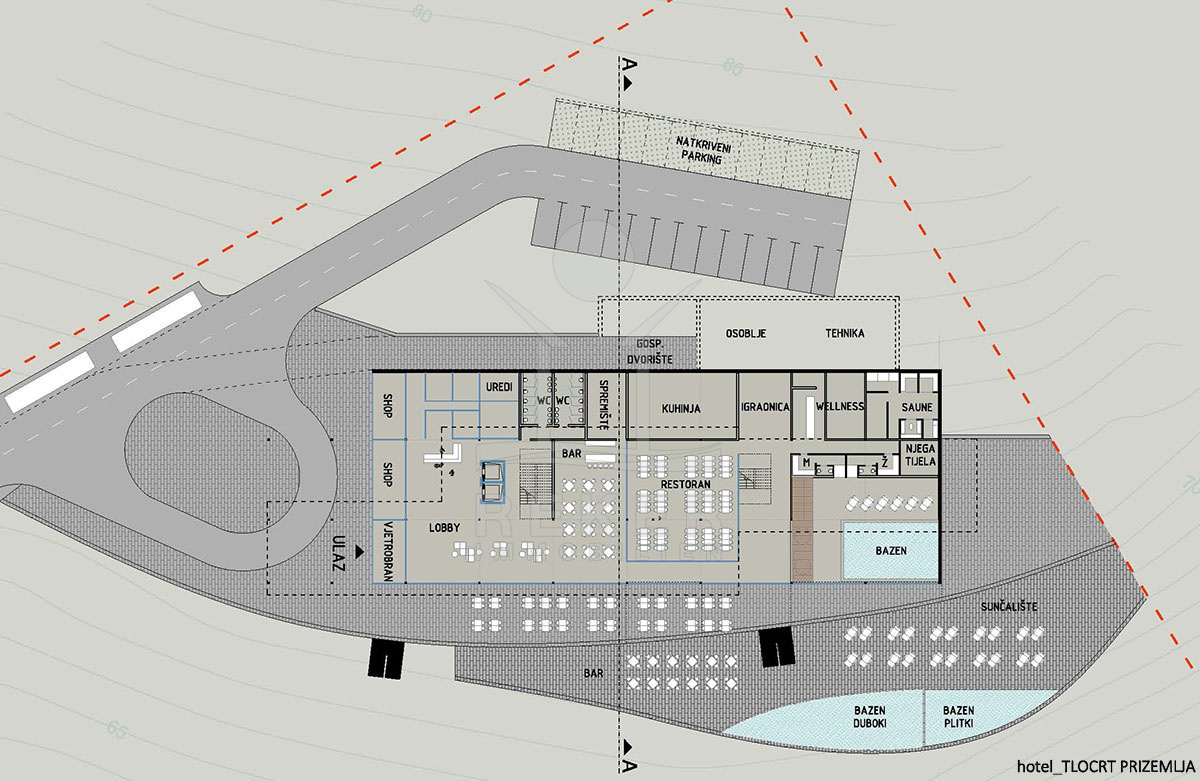 Die Konzeption sieht zudem ein Hotel mit rund 70 Zimmern vor. Das gesamte Grundstück in der Zone T2 ist für eine maximale Kapazität von 450 Betten ausgelegt, was es zum idealen Standort für ein umfassendes Touristenerlebnis macht.