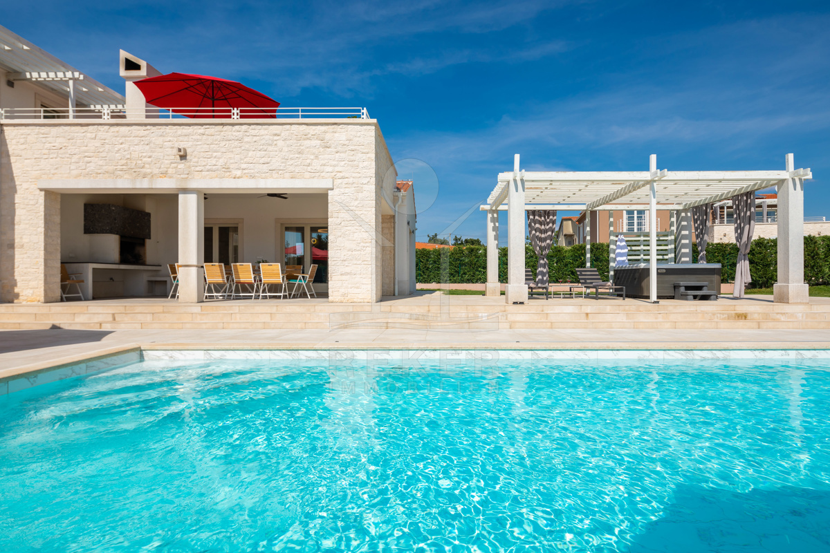 Die Außenanlage der Designer-Villa ist eine wahre Wohlfühloase, die Ihnen pure Entspannung und Vergnügen bietet. Ein privater beheizter Pool mit 48 m² kann überdacht werden und wird von einer überdachten Terrasse mit Sonnenliegen umgeben. Eine Außendusche, eine Pergola mit Whirlpool und ein Unterhaltungsbereich machen dieses Anwesen ideal für Familien, Freunde und Gäste. Der überdachte Parkplatz bietet Raum für mehrere Autos und ergänzt das Gesamtbild dieses luxuriösen Anwesens perfekt. Willkommen in Ihrem persönlichen Paradies!