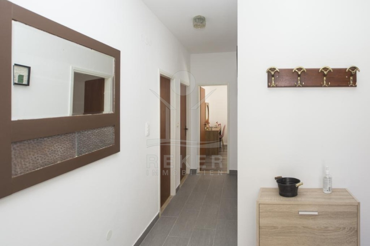 Oben befindet sich die Hauptwohnung: drei Schlafzimmer, ein Bad mit Toilette, eine zusätzliche Toilette, Küche mit Essbereich und ein gemütliches Wohnzimmer. Alles klimatisiert, alles funktional. Vom Wohnbereich aus geht’s direkt auf die Terrasse. Unten ist noch Luft nach oben: eine Einzimmerwohnung mit Bad, ein zusätzliches Zimmer und eine Garage – alle drei Räume sind noch im Rohzustand. Perfekt für Investoren, die aufwerten wollen. Oder für alle, die sich gerne nach und nach mehr Raum schaffen.