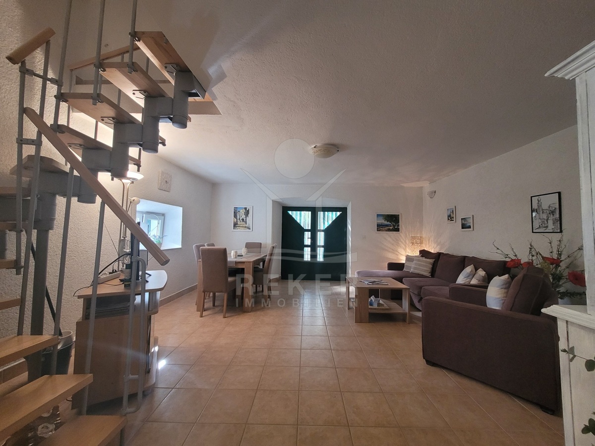 Das Haus erstreckt sich über 2 Etagen und bietet eine Wohnfläche von 104 m². Das Grundstück umfasst 180 m² und ist teilweise von einer niedrigen Steinmauer und einem Zaun umgeben. Der Garten ist mit Olivenbäumen, Feigenbäumen und Granatapfelbäumen bepflanzt und verleiht dem Anwesen ein authentisches mediterranes Flair. Das Haus wurde kürzlich renoviert, wodurch es modernen Komfort mit traditionellem Charme verbindet.