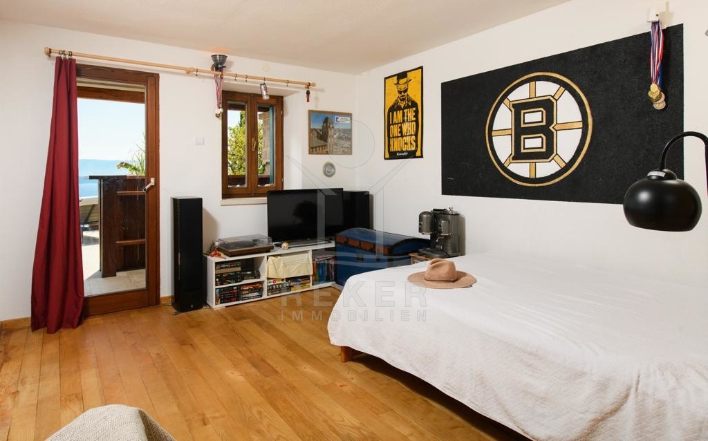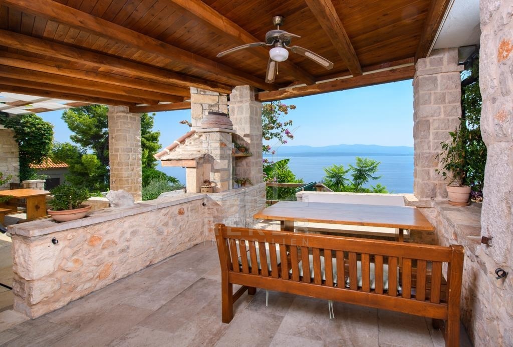 Der Außenbereich der Villa bietet verschiedene Aufenthaltsmöglichkeiten, darunter eine überdachte Terrasse, eine Loggia und einen schattigen Platz unter den Olivenbäumen. Hier können Sie den fantastischen Blick auf das Meer und die Insel Brač genießen. Es gibt sogar einen gemauerten Steingrill, der perfekt für gesellige Grillabende ist. Die Parkmöglichkeiten befinden sich auf einem öffentlichen Parkplatz in unmittelbarer Nähe, nur 30 m entfernt. Diese Steinvilla bietet eine perfekte Investmentgelegenheit und lässt Wohnträume in traumhafter Kulisse wahr werden.