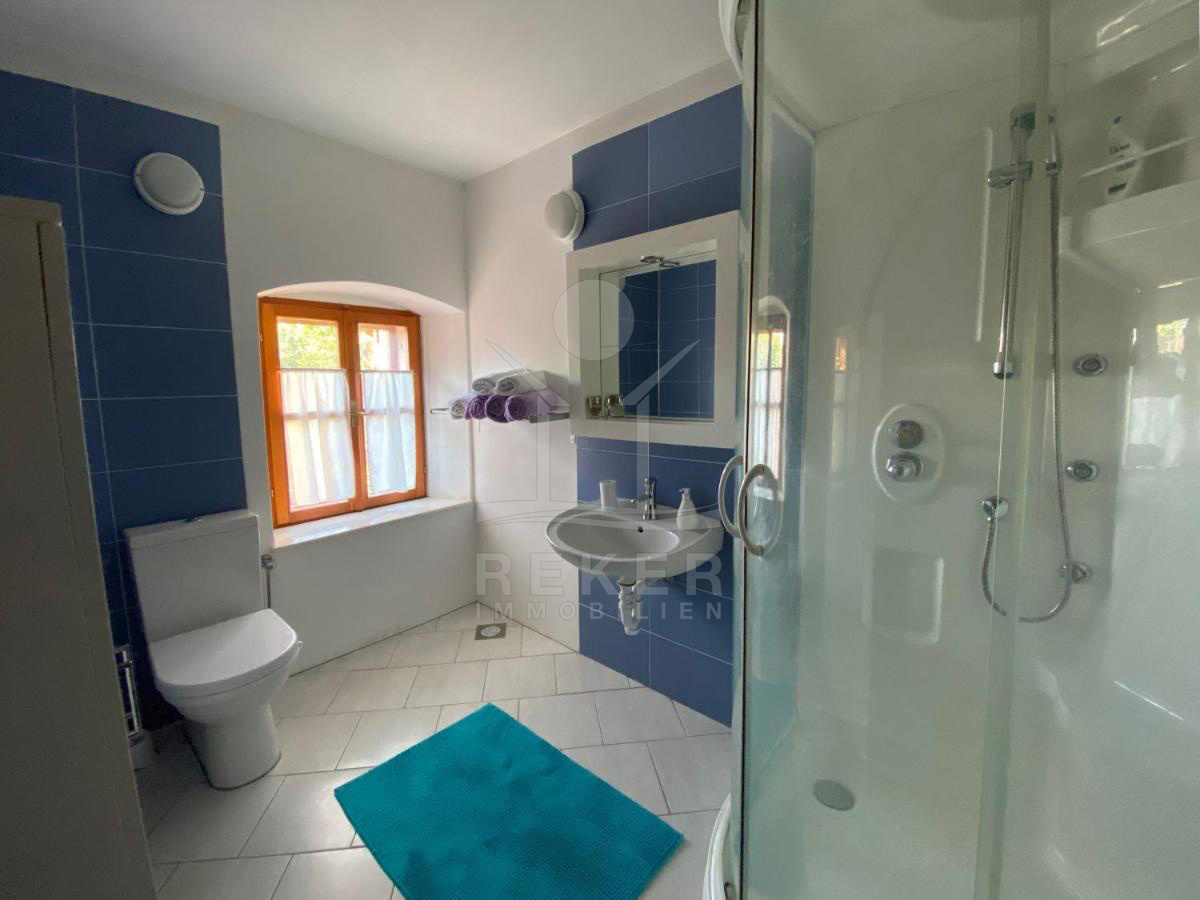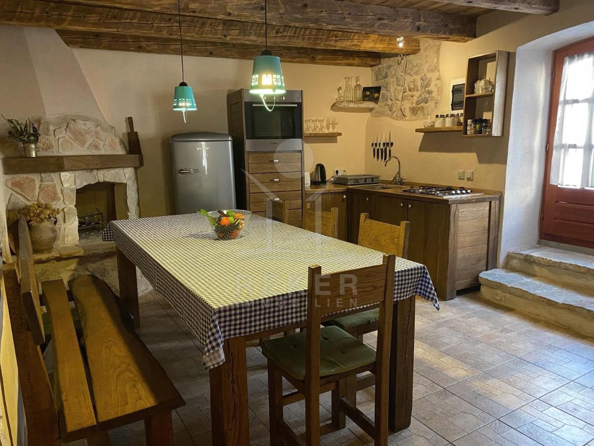 Im Erdgeschoss führt eine massive Holztür direkt in die gemütliche Küche. Der große Holztisch, die alte Steinmauer mit eingebautem Kamin und die offene Holzdecke – das ist echte Atmosphäre. Daneben: ein Wohnzimmer mit Sofaecke und warmen Holztönen. Rustikale Fässer als Couchtische, dicke Mauern und viel Licht sorgen für Gemütlichkeit. Ein Hauswirtschaftsraum ergänzt den unteren Bereich. Oben geht’s weiter mit drei Schlafzimmern, einem Badezimmer und einer Terrasse mit Blick über die Dächer bis zu den Hügeln. Alles ist möbliert – stilvoll, schlicht und voll im Einklang mit der Umgebung.