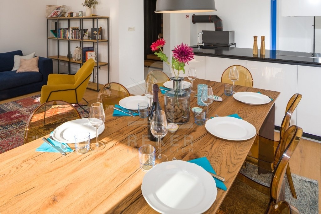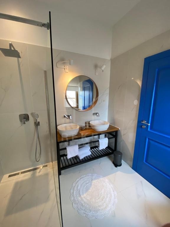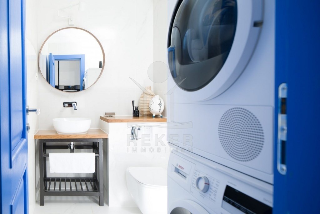 Eine Innentreppe führt in das erste Stockwerk, in dem es ein weiteres Badezimmer und ein 2. Wohnzimmer mit offener Küche und Essplatz gibt. Von hier aus gelangen Sie direkt auf eine 20 m² große Terrasse mit märchenhaftem Ausblick auf die Hügel und das Meer.