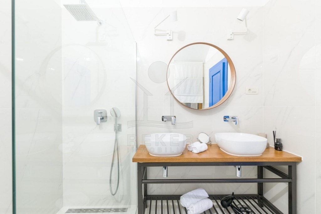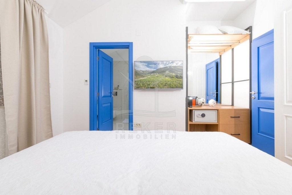 Im 2. Obergeschoss befinden sich 2 weitere Schlafzimmer mit jeweils eigenem Bad. Die Luxus-Villa ist mit Designer-Möbeln stilvoll ausgestattet und mit 5 Sternen kategorisiert.