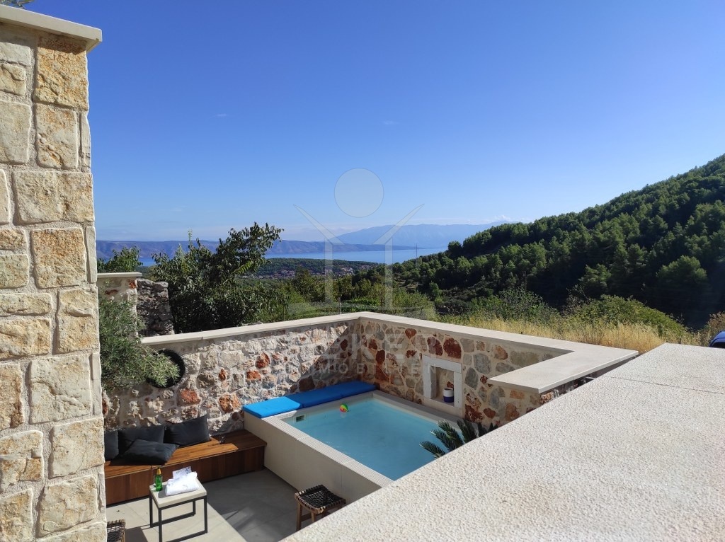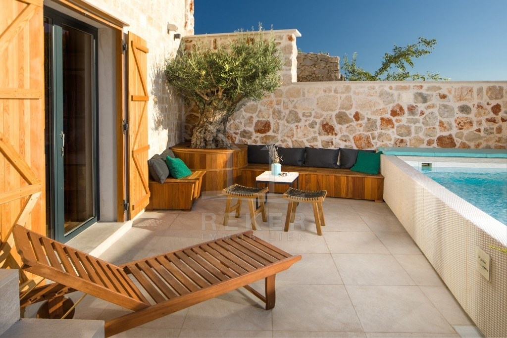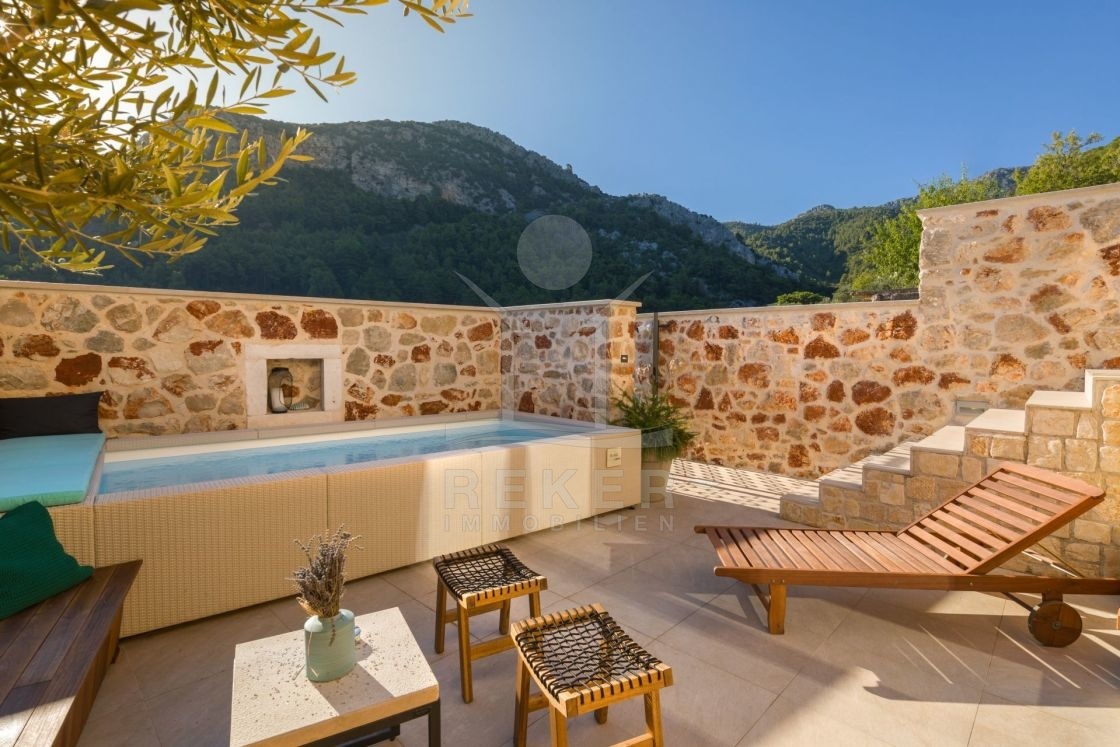 Der erst 2018 erbaute Wohntraum ist durch von einer charmanten Steinmauer umgebene Terrassen bereichert, auf denen Sie vollkommene Glückseligkeit erleben können. Eine von ihnen begeistert mit einem herrlichen Pool, der Ihnen erfrischende Harmonie bietet.