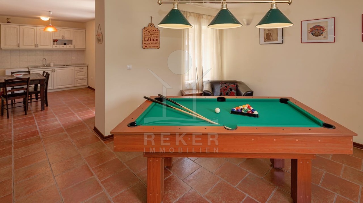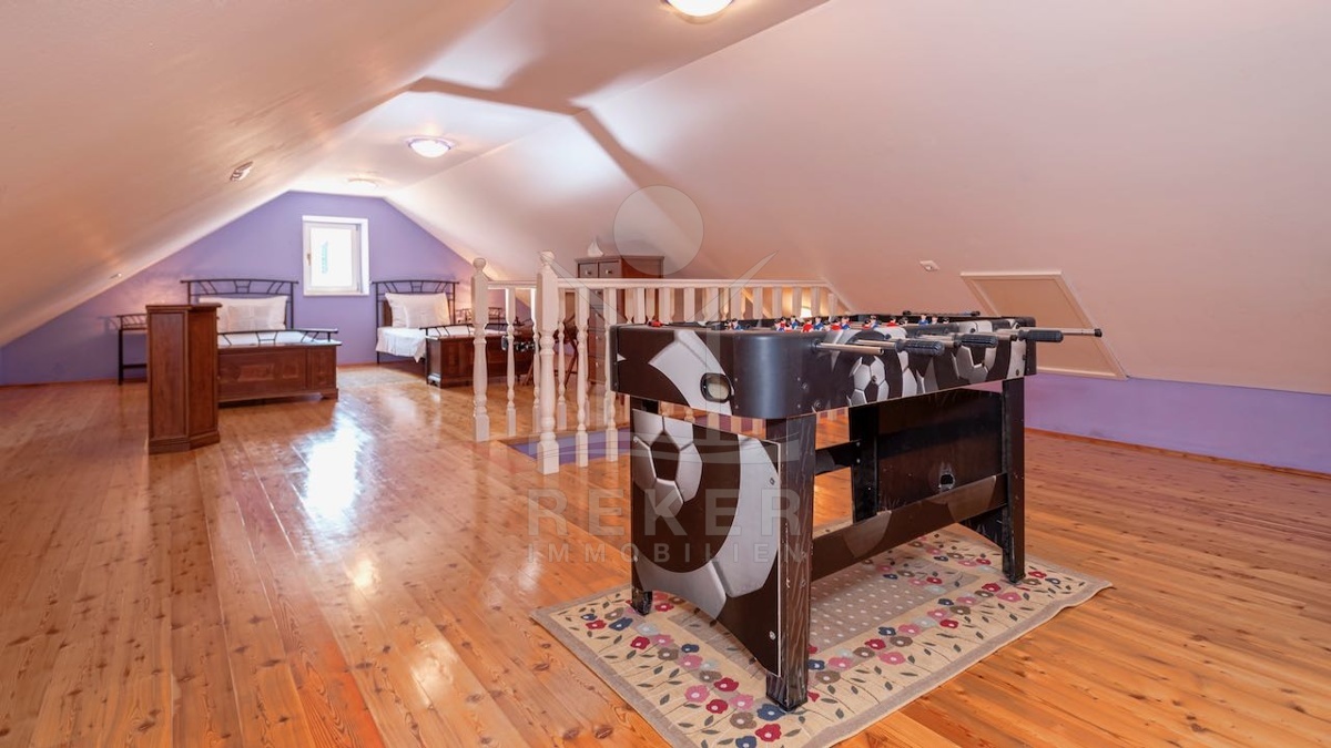 Der zweite Eingang befindet sich hinter dem Haus und führt in das 1. Stockwerk, wo sich zwei Schlafzimmer mit jeweils eigenem Badezimmer befinden. Außerdem gibt es eine Küche und einen Hobbyraum.