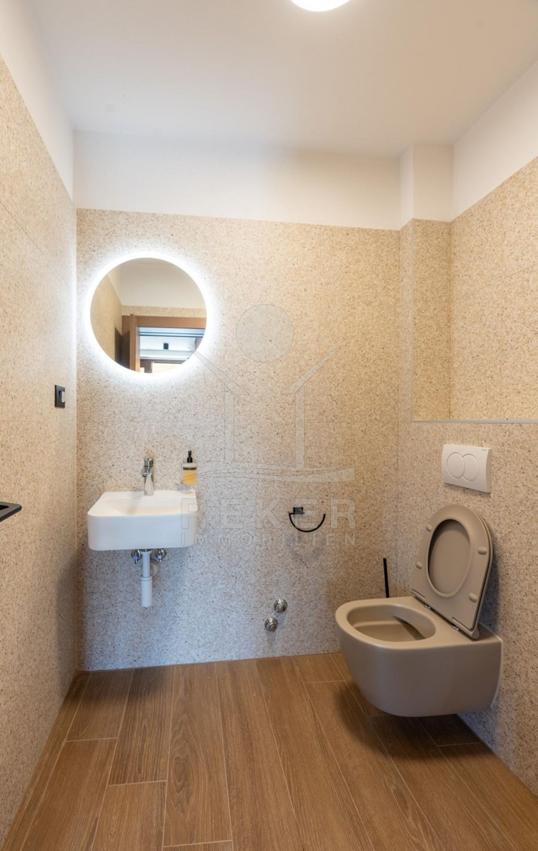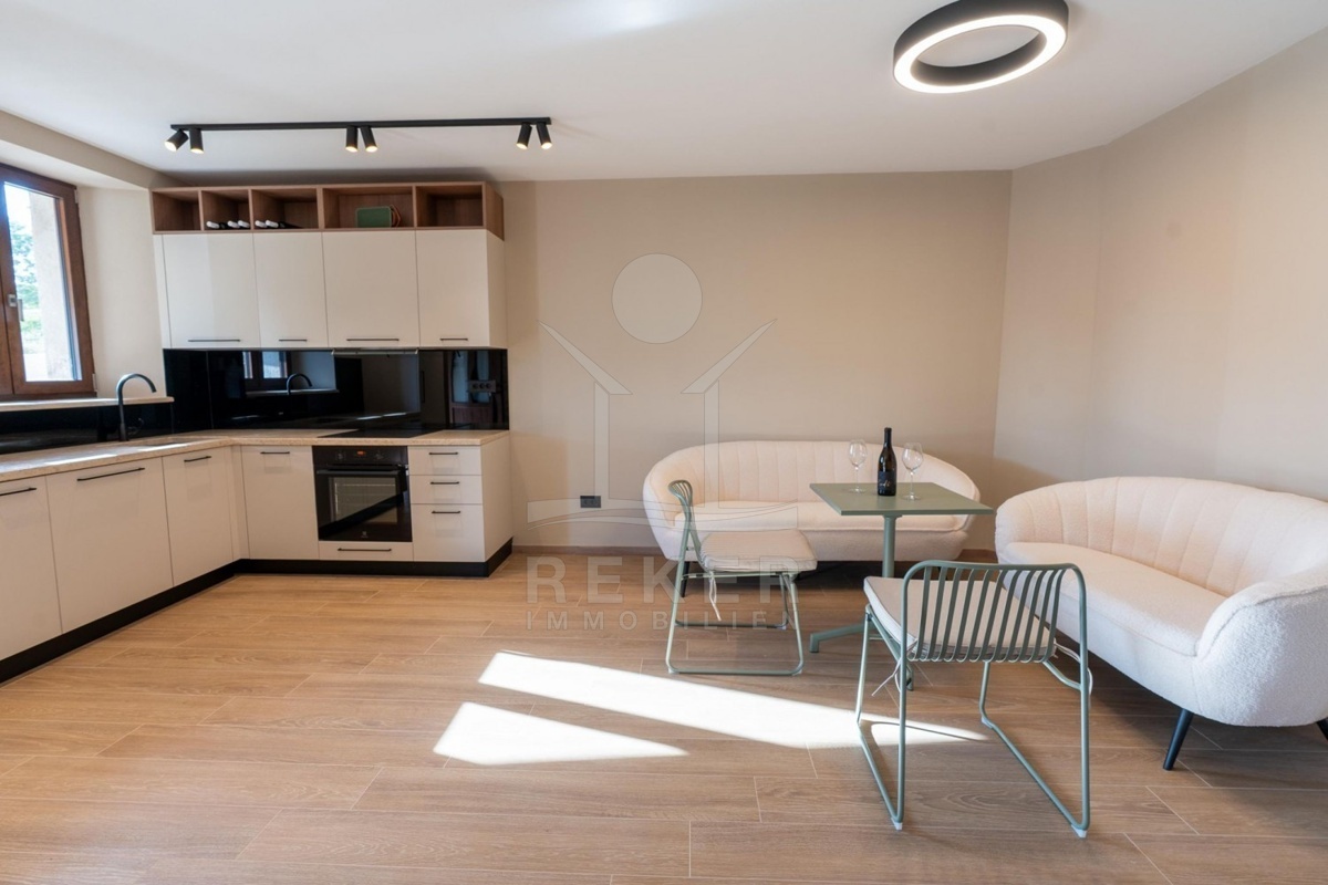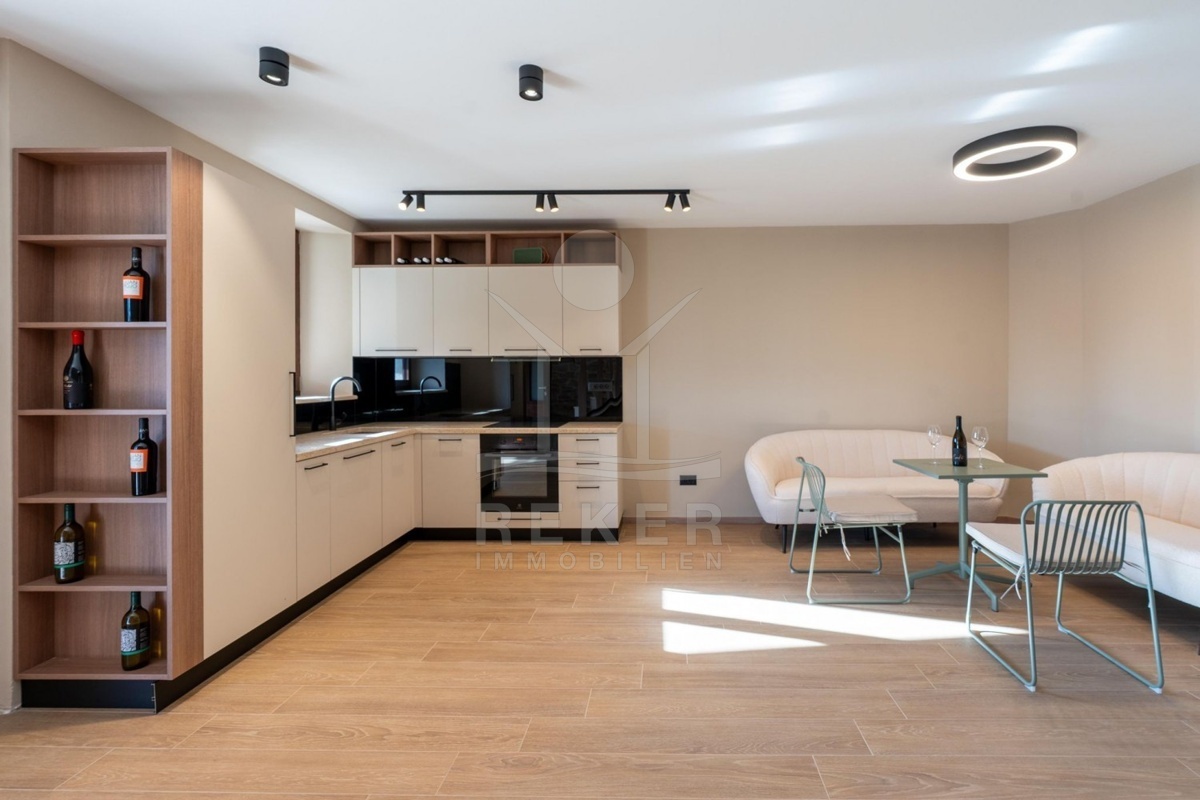 Sie wohnen hier in Kaštelir-Labinci, einem ruhigen Ort oberhalb von Poreč. Zum Meer fahren Sie rund acht Kilometer, in die Stadt sind es zwölf. Vor der Haustür finden Sie alles, was Sie im Alltag brauchen: Einkauf, Post, kleine Cafés, ein Restaurant ums Eck. Zwei Stellplätze direkt am Haus machen den Alltag einfach.