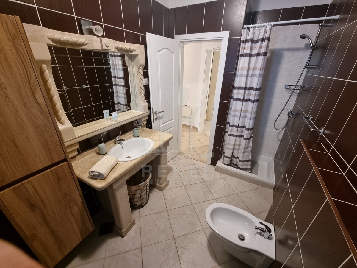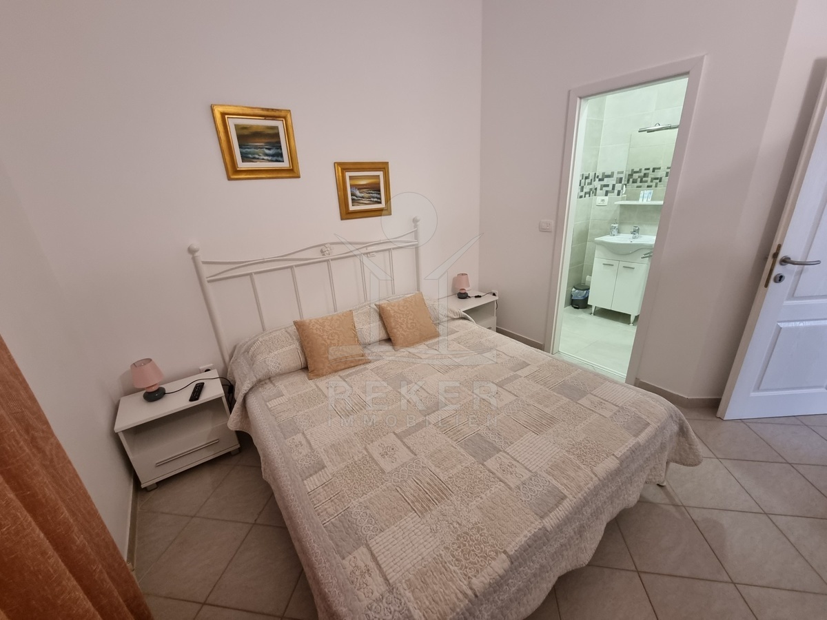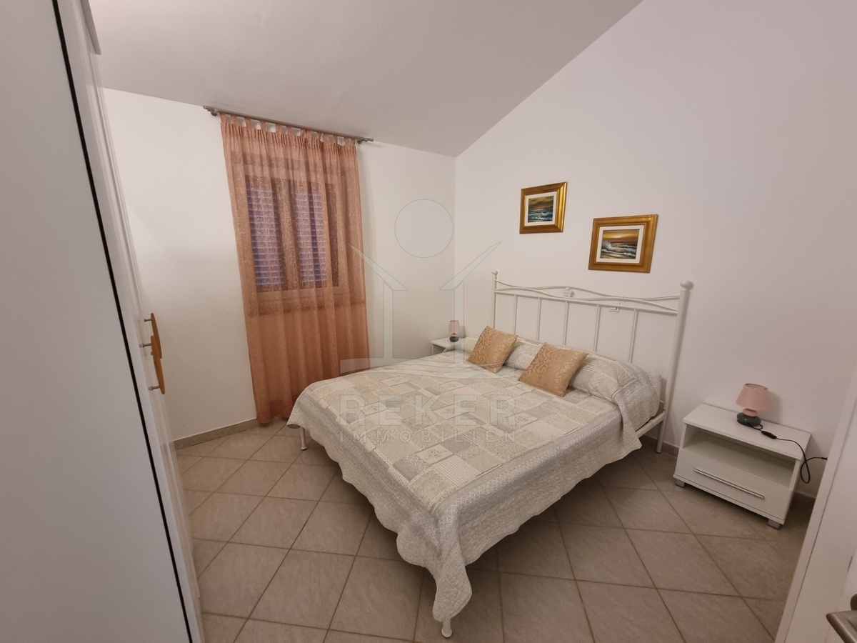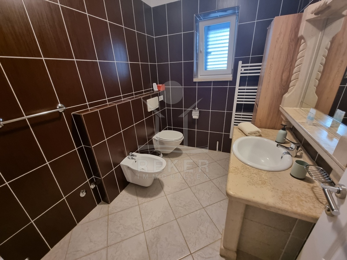 Drinnen verteilen sich 145 m² auf zwei Etagen. Im Erdgeschoss befinden sich Wohnzimmer, Küche, Essbereich, ein Schlafzimmer, Bad, Abstellraum und Zugang zur Terrasse. Oben: zwei weitere Schlafzimmer, zwei Bäder (eins direkt am Zimmer) und der Balkon. Alles ist möbliert und bereit zum Einziehen – oder zur Ferienvermietung. Die Ausstattung ist modern, die Räume gepflegt. Gekühlt und beheizt wird mit Klimageräten und Elektro. Und ja – TV und Internet sind in jedem Zimmer schon da.