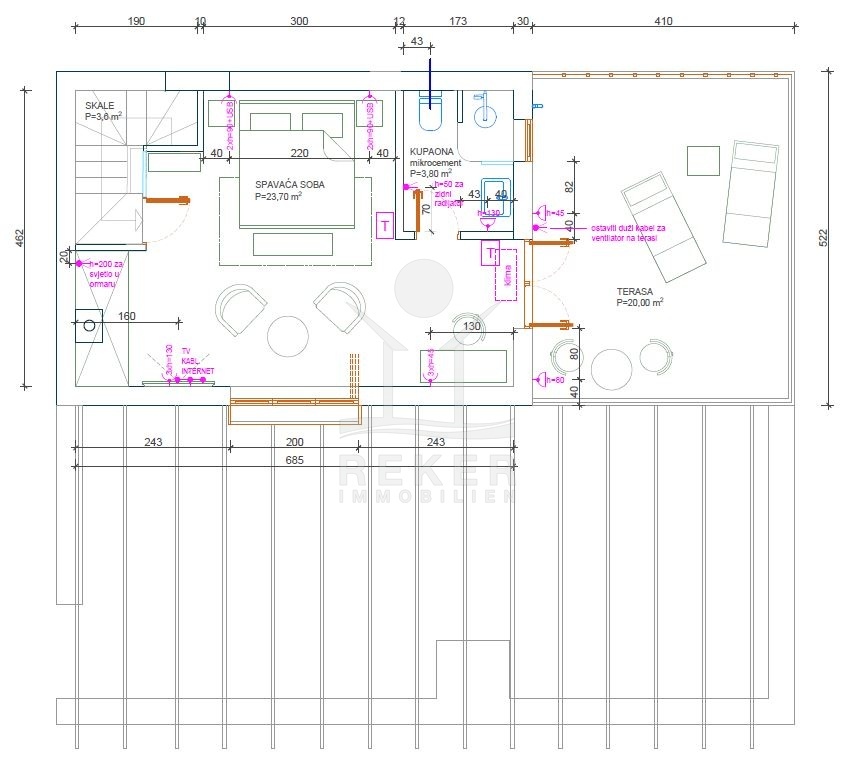 Das Anwesen besticht durch gleich zwei Terrassen: Eine großzügige im Untergeschoss mit 50 m² und eine weitere im ersten Stock mit 20 m², die einen atemberaubenden Blick auf das Meer bietet. Diese perfekten Außenbereiche laden dazu ein, die frische Meeresluft zu genießen, entspannende Stunden oder gesellige Abende mit Freunden und Familie zu verbringen.