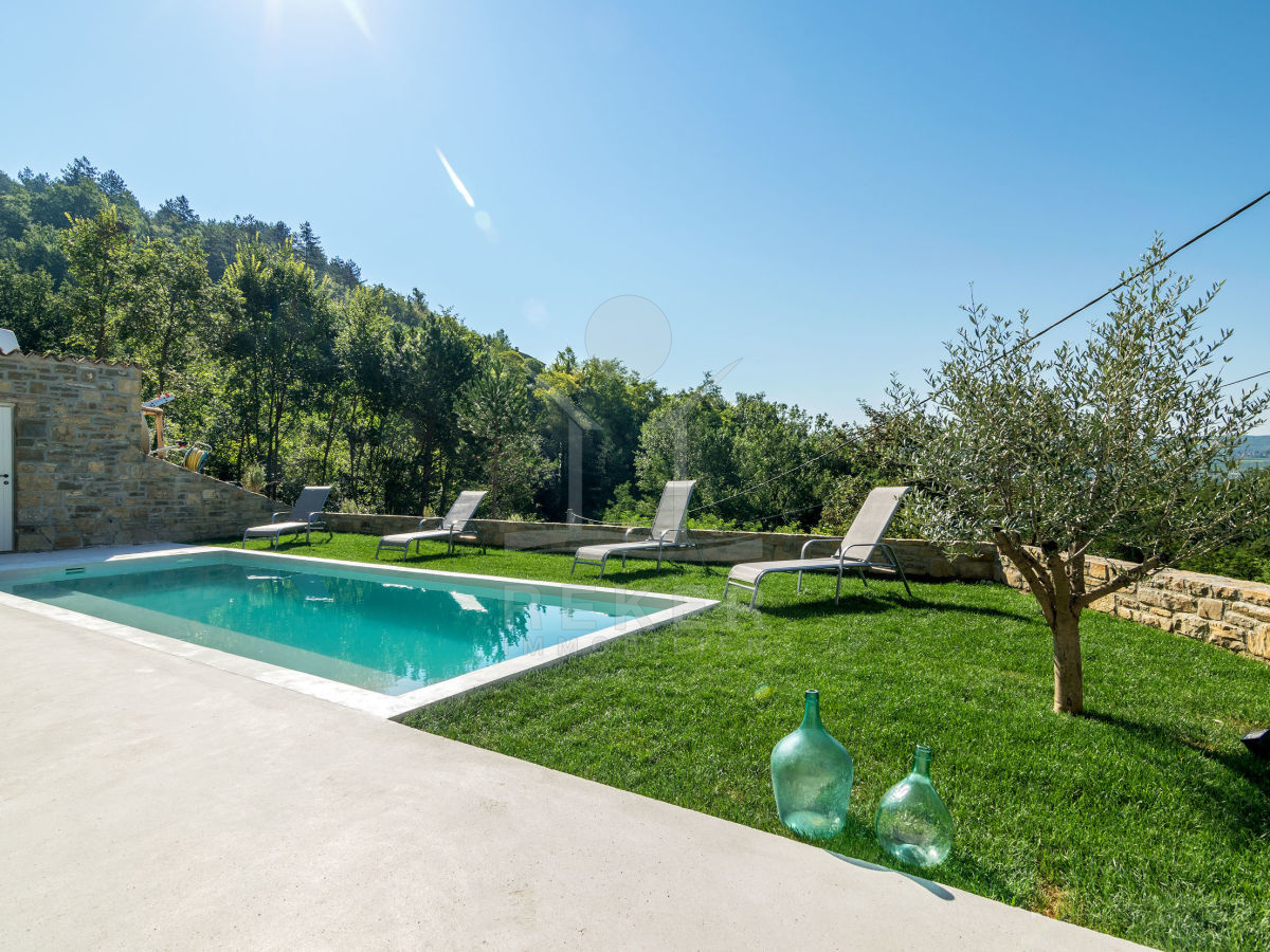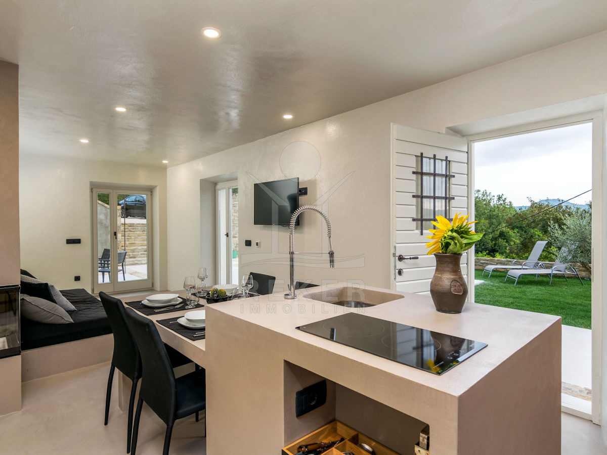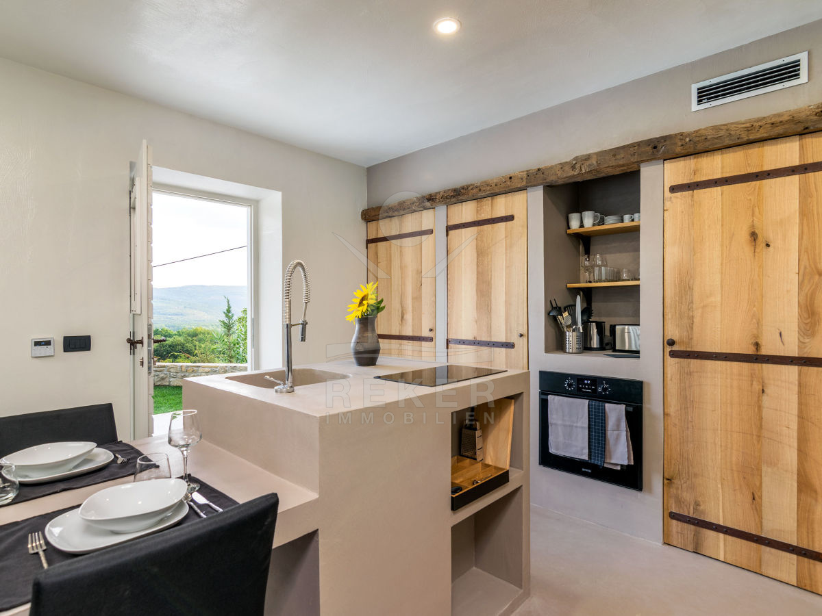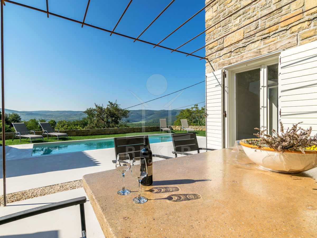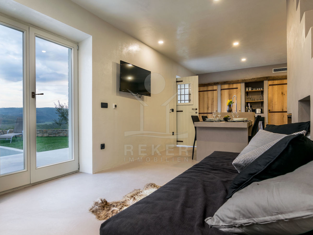 Die istrische Steinhausvilla liegt in einem ruhigen Ort, umgeben von nur wenigen Häusern. Jede Ecke des 1000 m² großen Grundstücks bietet einen atemberaubenden Blick auf die umliegenden Hügel. Hier können Sie die Ruhe genießen und die Schönheit der Natur erleben.