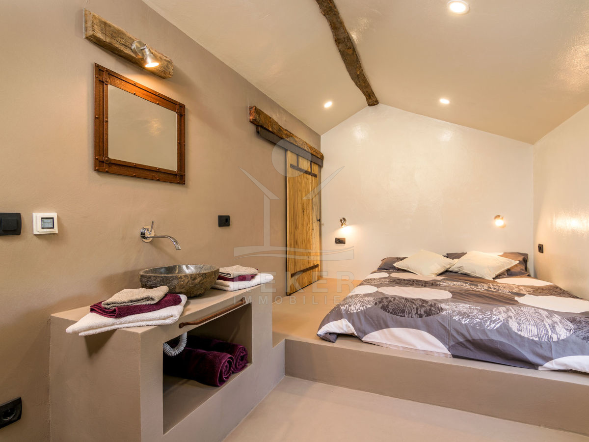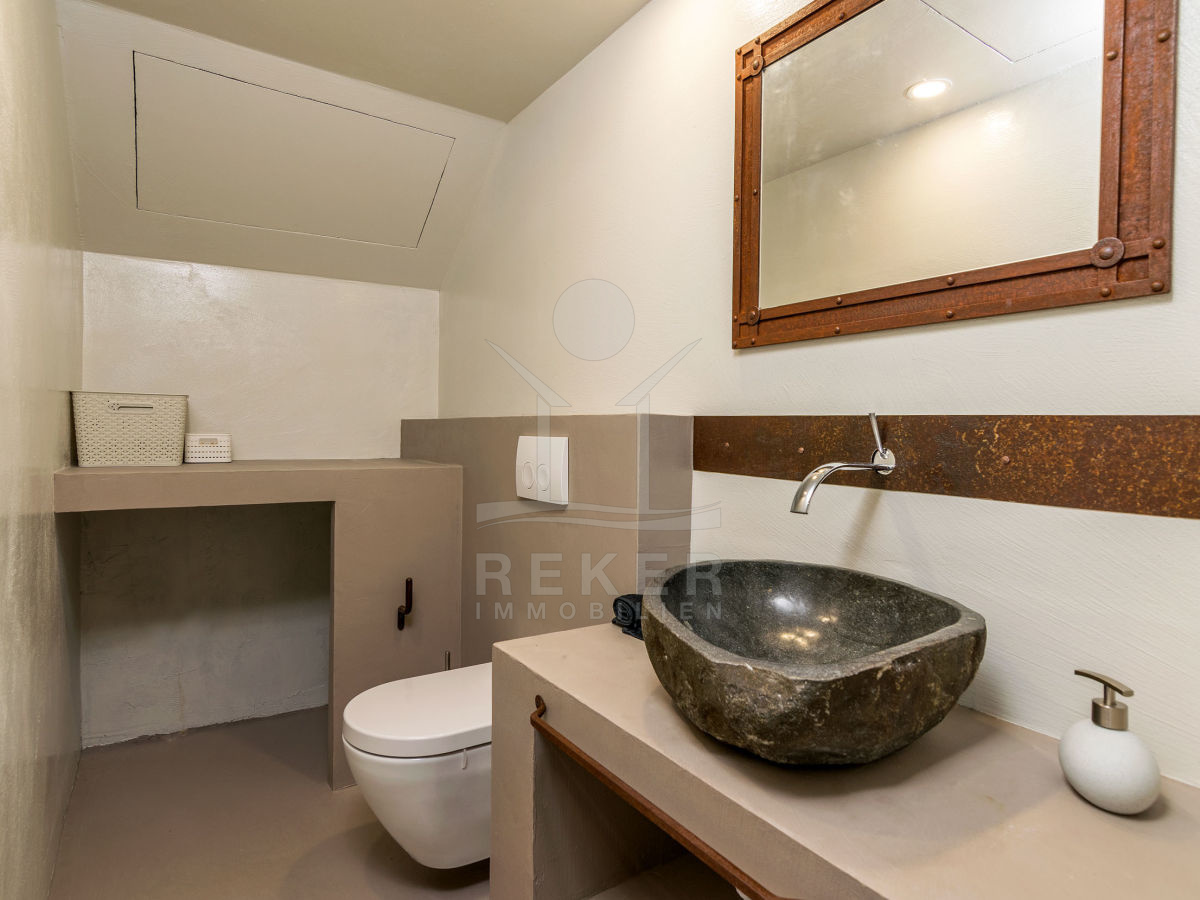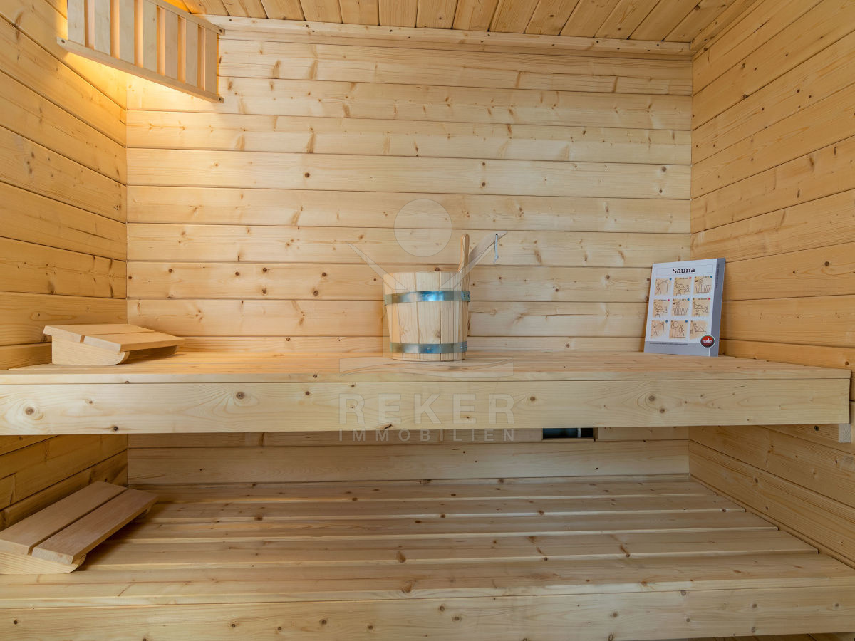 Die Inneneinrichtung der Villa wurde sorgfältig gestaltet, um eine harmonische und einladende Atmosphäre zu schaffen. Im Erdgeschoss befinden sich eine moderne Küche mit Kochinsel, ein geräumiges Esszimmer und ein gemütliches Wohnzimmer. Ein besonderes Highlight ist die Sauna, in der Sie sich nach einem langen Tag entspannen können. Eine separate Toilette ist ebenfalls vorhanden.