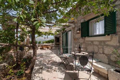 Romantische Steinterrasse mit Grill und Sitzmöglichkeiten zum Zusammenkommen