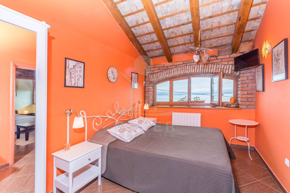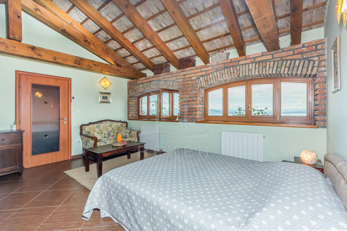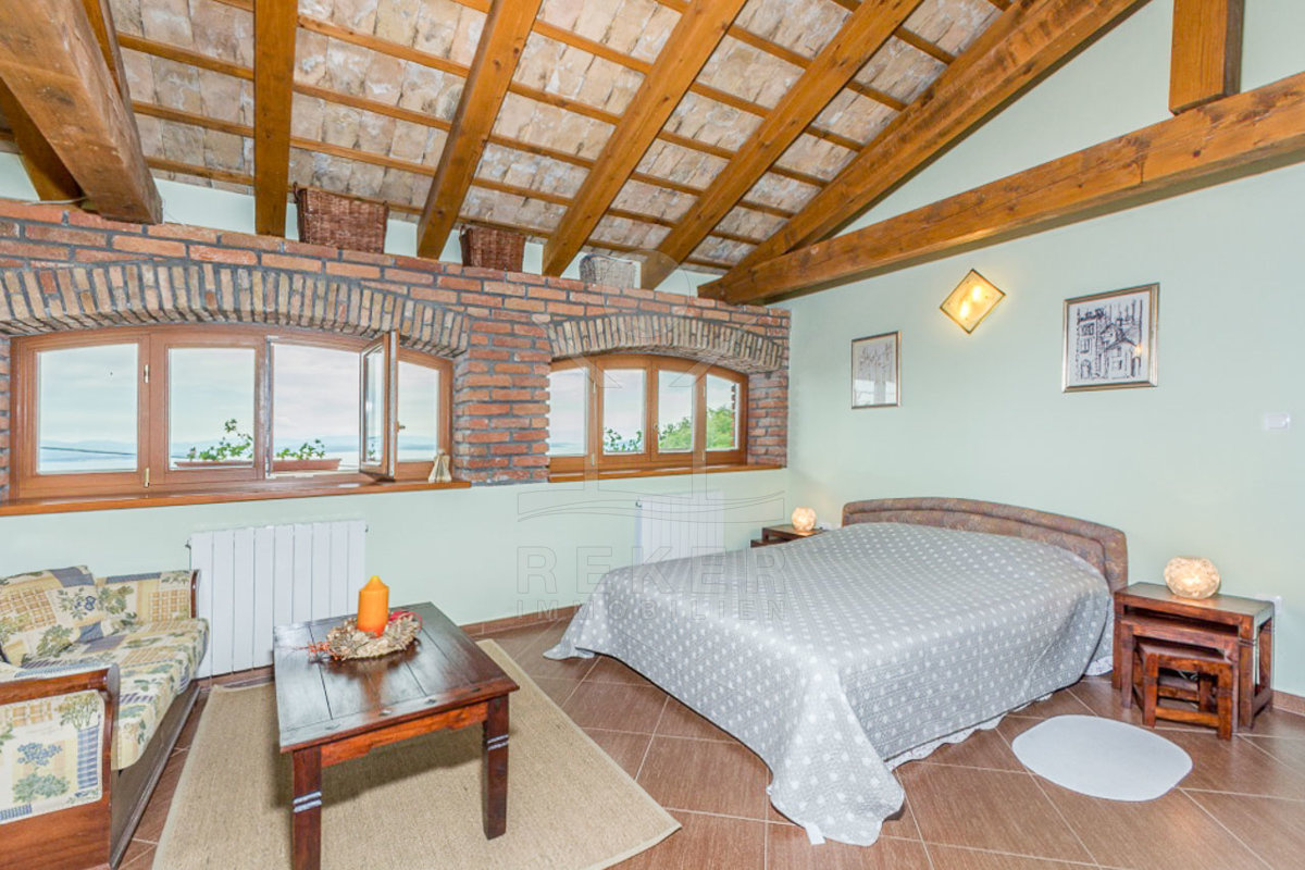 Die interne Treppe führt Sie in den ersten Stock, wo sich auf 42 m² ein geräumiges Badezimmer, ein Flur und zwei charmante Schlafzimmer befinden. Jedes Zimmer in dieser Etage bietet einen unglaublichen Blick auf das Meer, sodass Sie die Schönheit der Kvarner-Bucht jederzeit genießen können. Der mediterrane und rustikale Stil schafft eine harmonische Atmosphäre, die zum Entspannen einlädt.