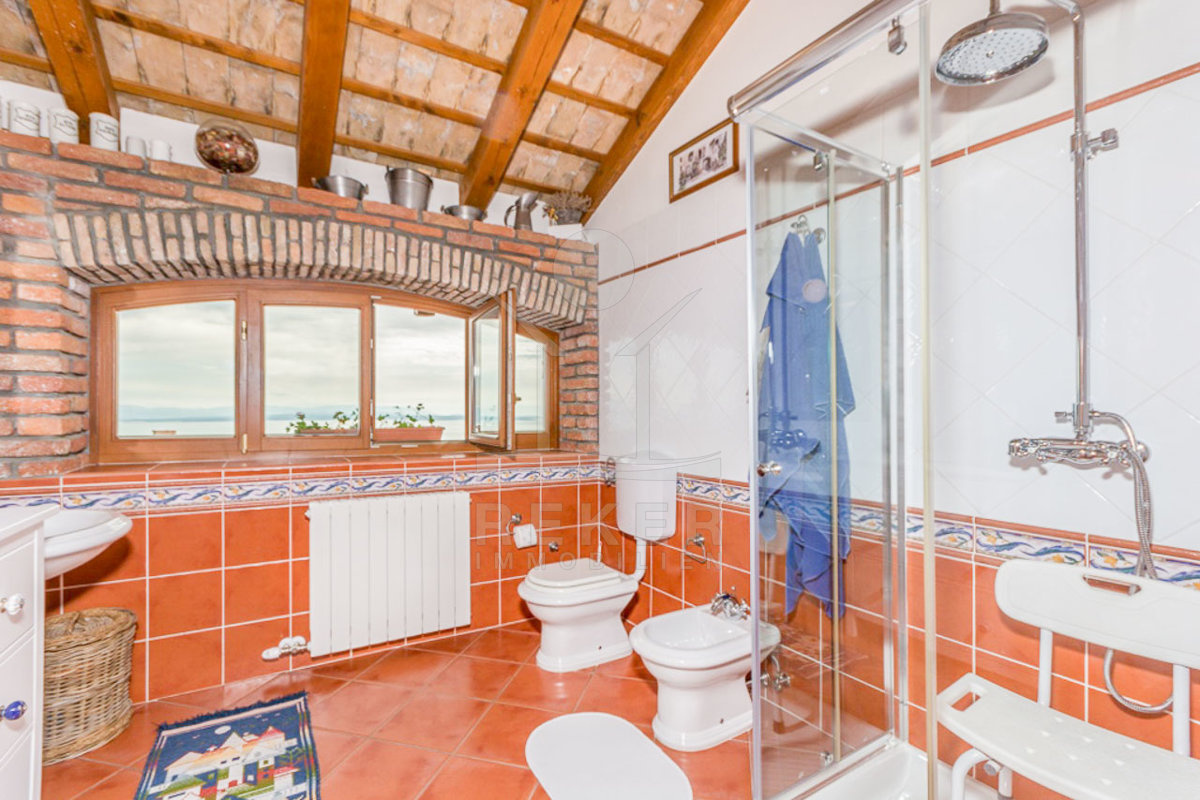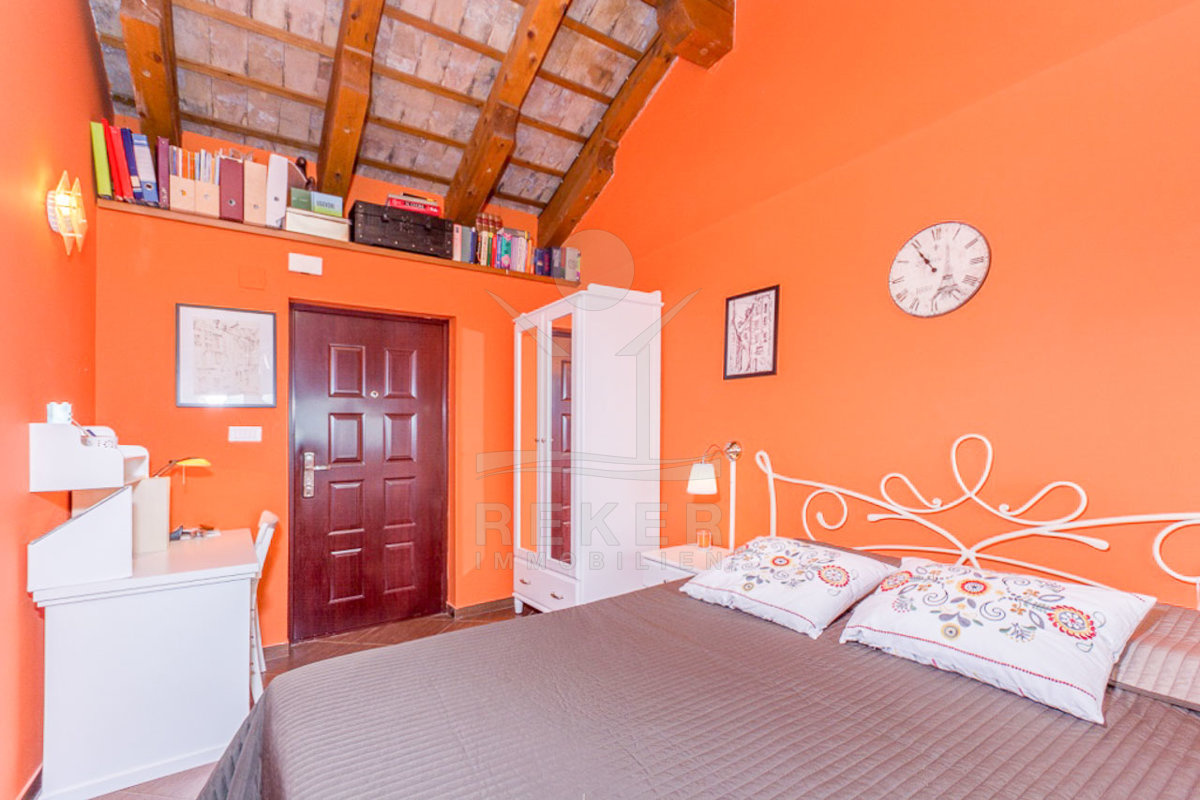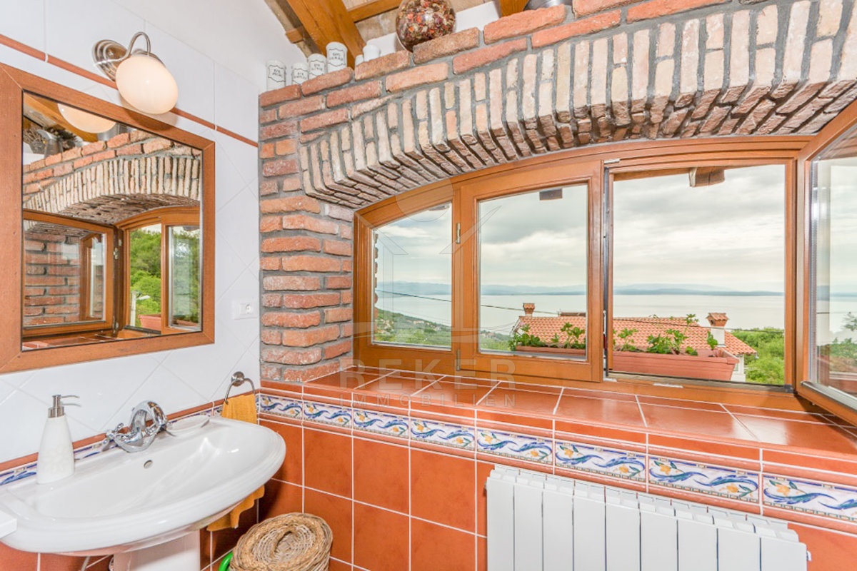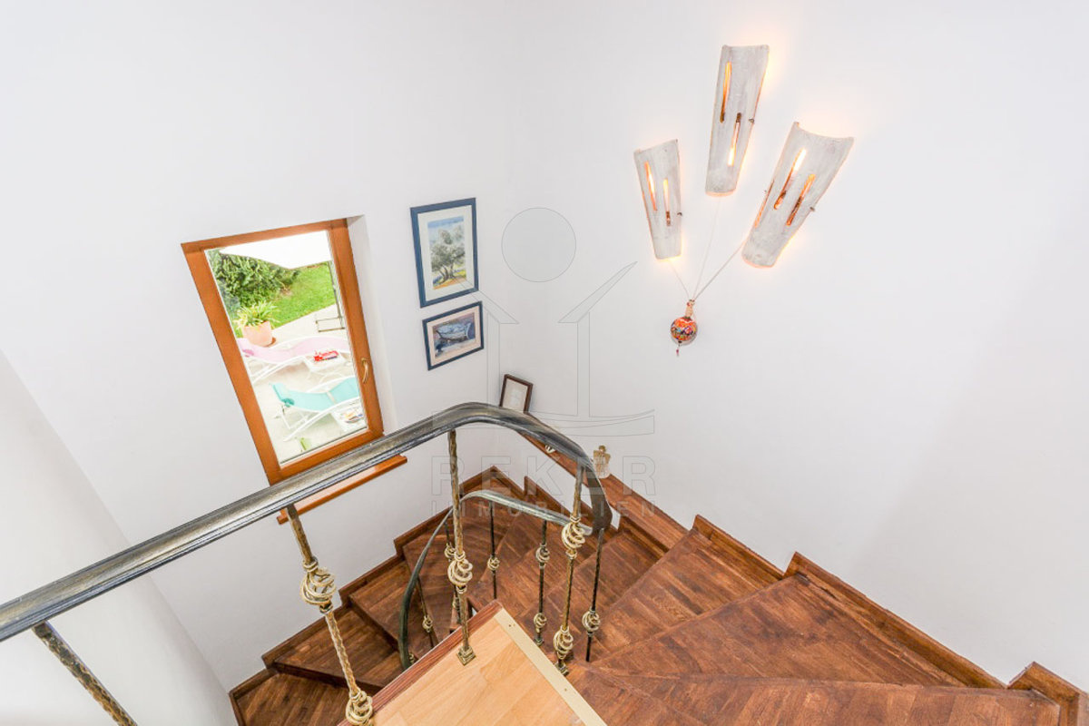 Die interne Treppe führt Sie in den ersten Stock, wo sich auf 42 m² ein geräumiges Badezimmer, ein Flur und zwei charmante Schlafzimmer befinden. Jedes Zimmer in dieser Etage bietet einen unglaublichen Blick auf das Meer, sodass Sie die Schönheit der Kvarner-Bucht jederzeit genießen können. Der mediterrane und rustikale Stil schafft eine harmonische Atmosphäre, die zum Entspannen einlädt.