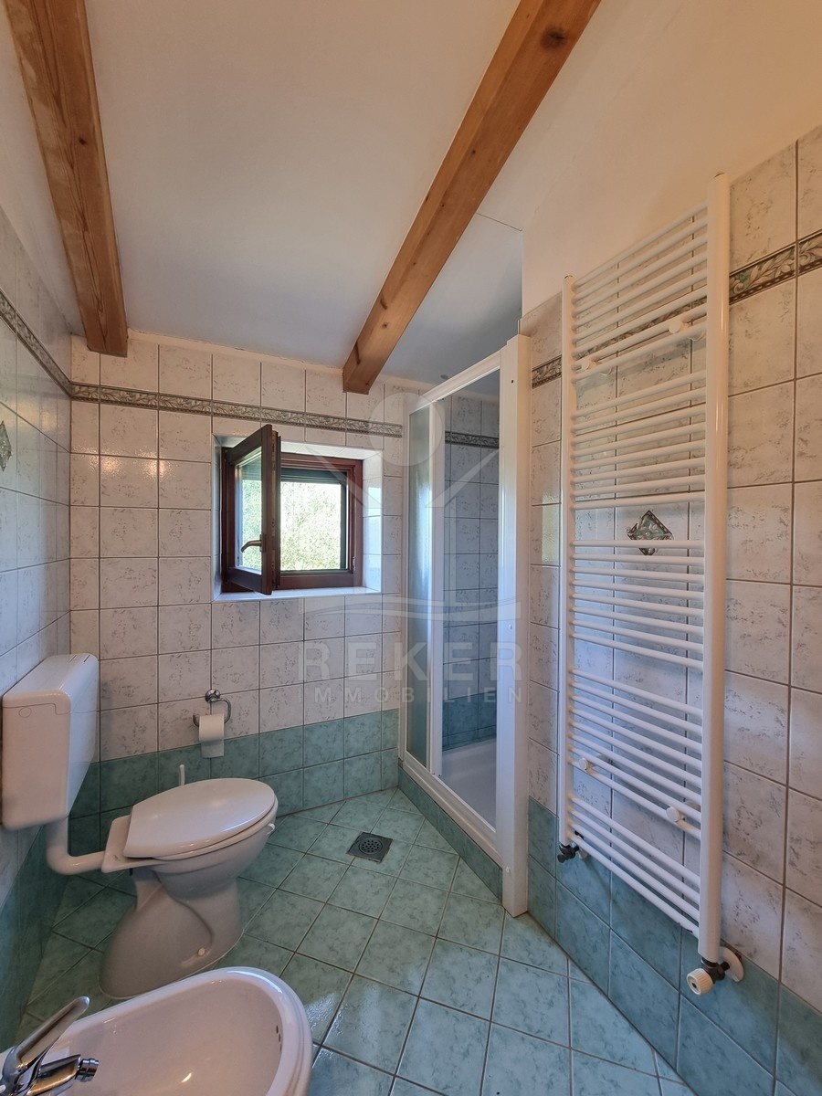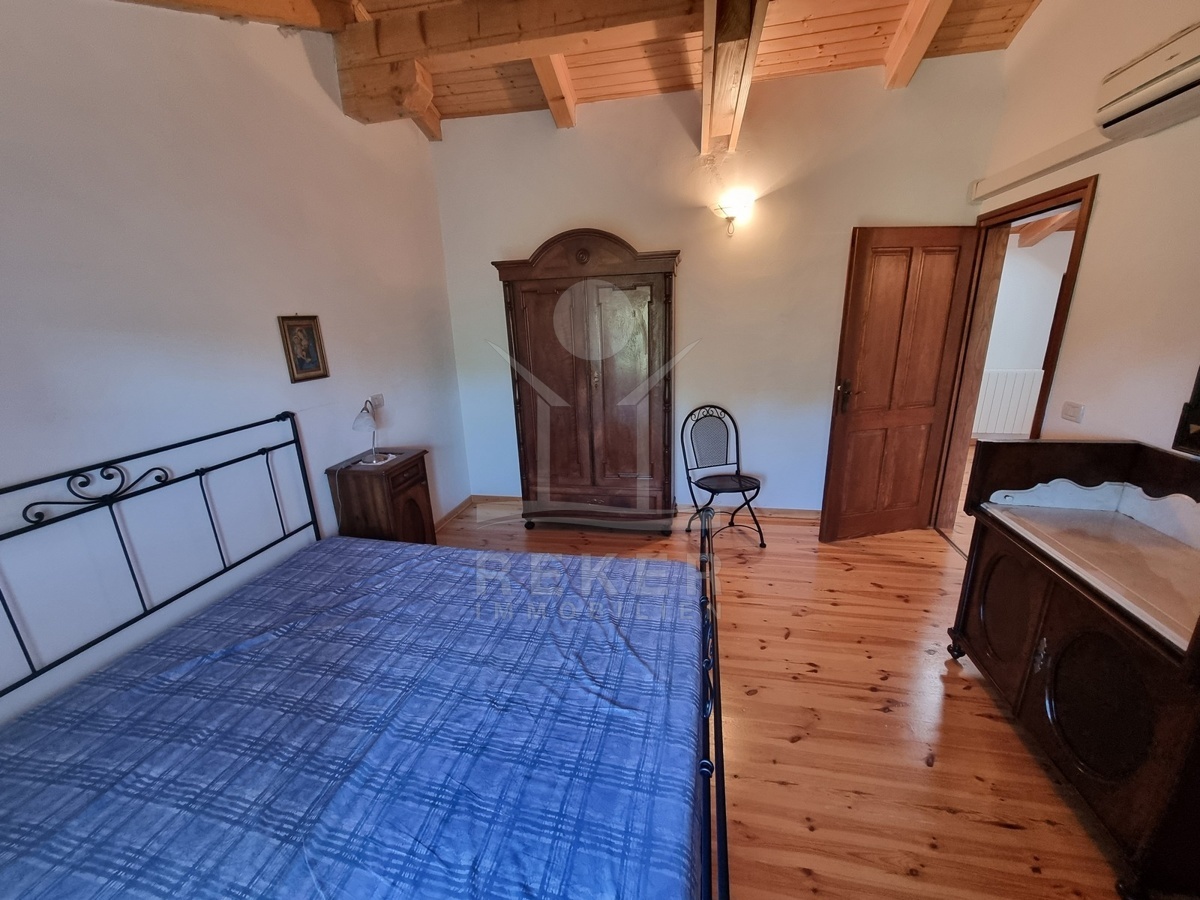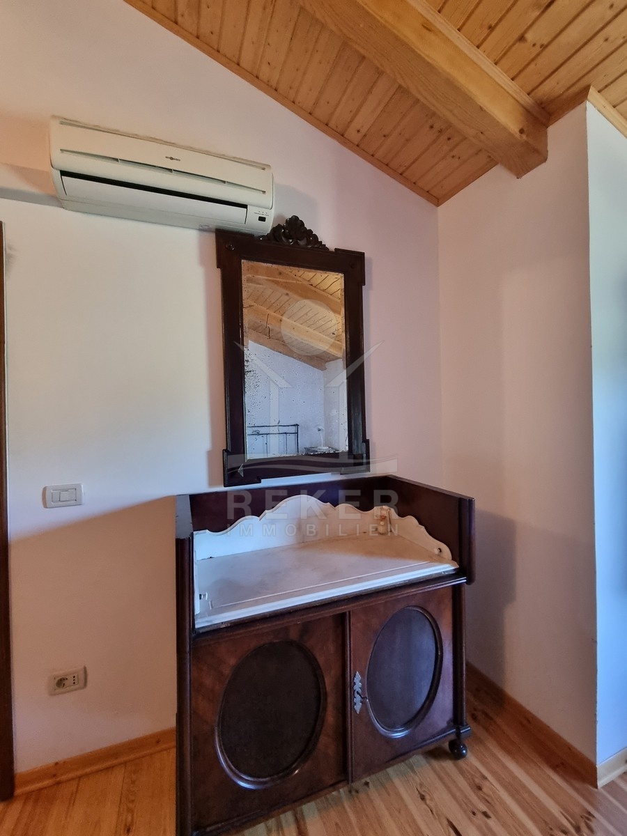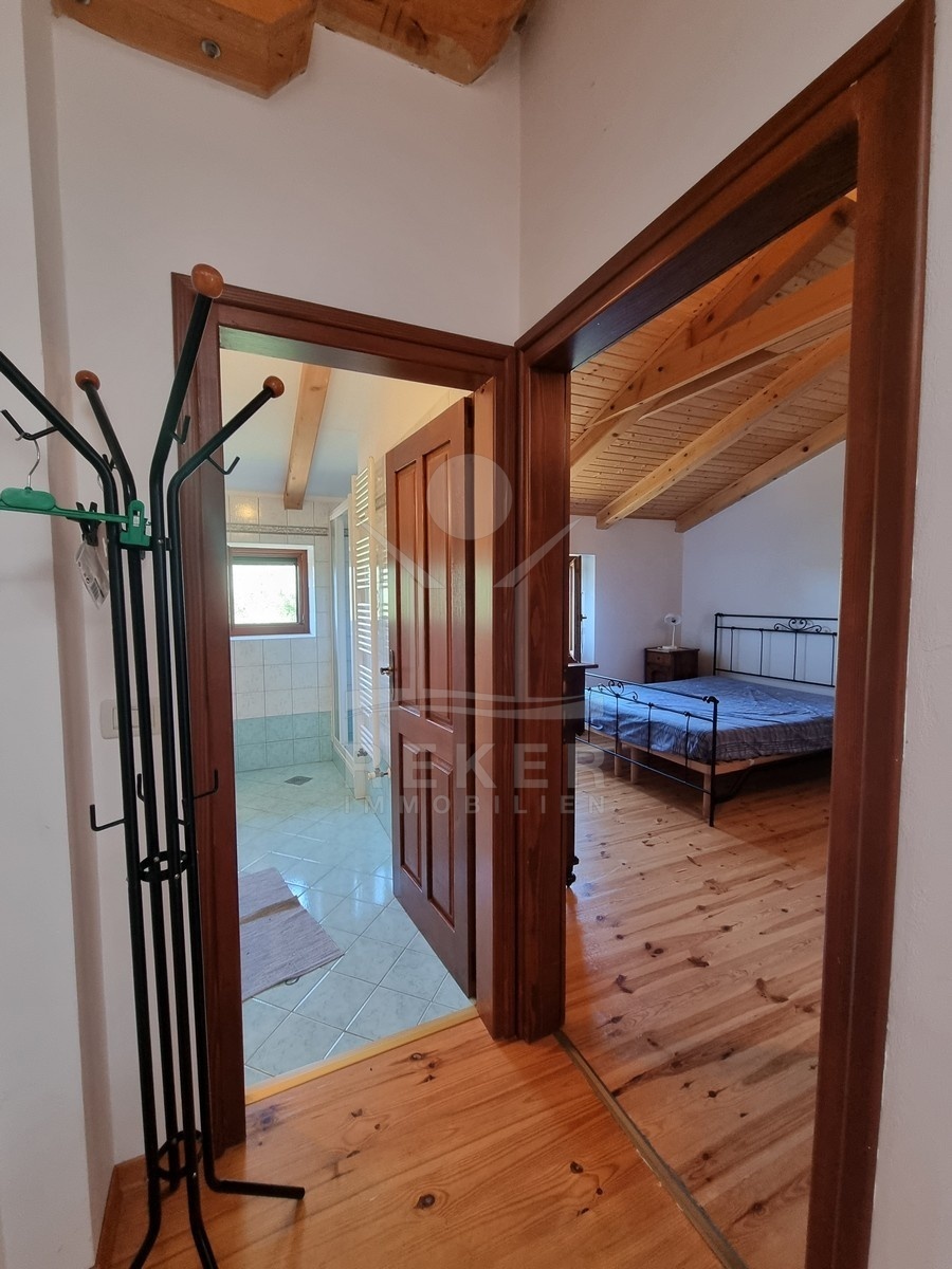 Innen wird es gemütlich. Sichtbare Holzdecken, Terrakottafliesen, offener Kamin und viel warmes Holz prägen das Bild. Im Erdgeschoss liegt der große Wohnraum mit offener Küche, Esstisch, Sofaecke und Kamin. Dazu ein Badezimmer, ein Schlafzimmer und praktische Abstellflächen. Über die Massivholztreppe geht es hinauf in den oberen Bereich: Zwei weitere Schlafzimmer, ein Balkon und das zweite Bad. Die Küche ist komplett ausgestattet, alles ist möbliert. Gaszentralheizung und Klimaanlage sorgen für Komfort – auch außerhalb der Sommermonate.