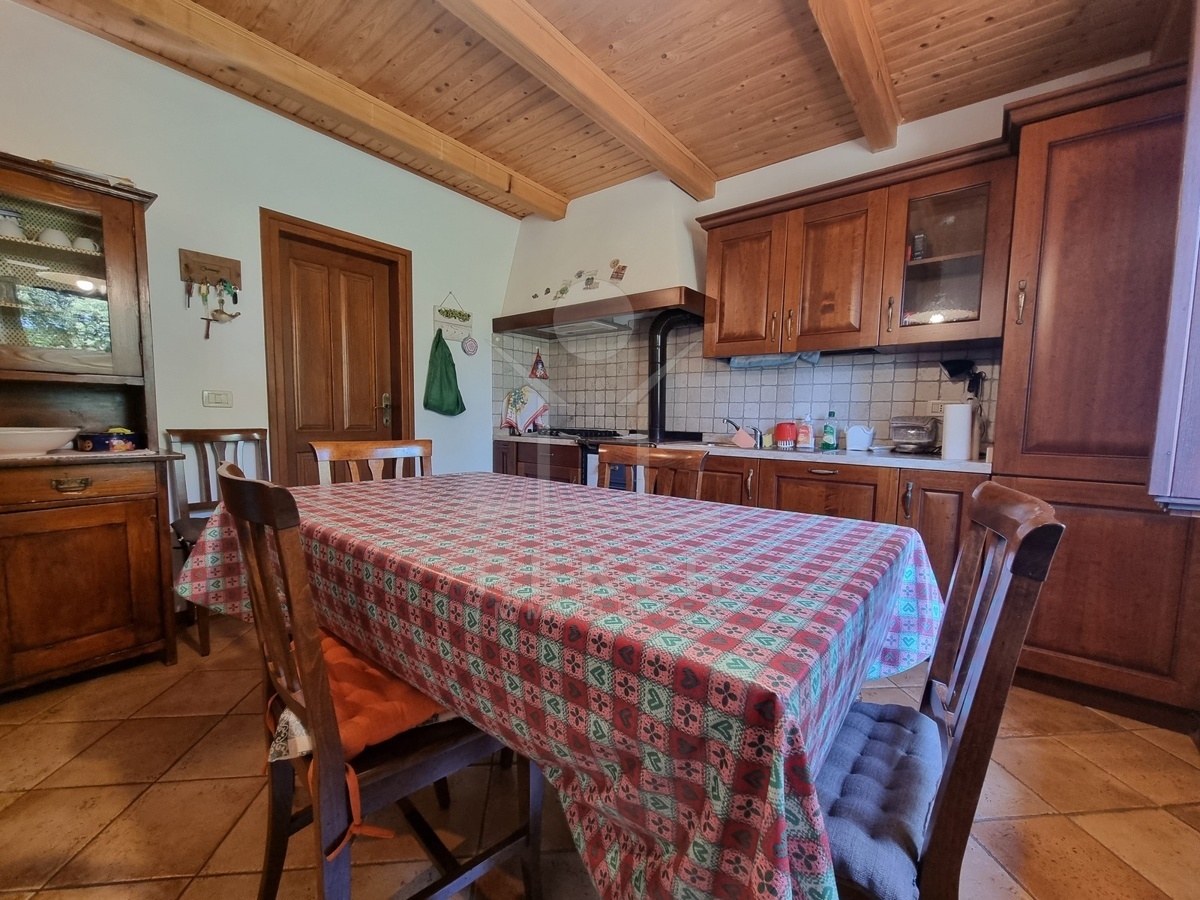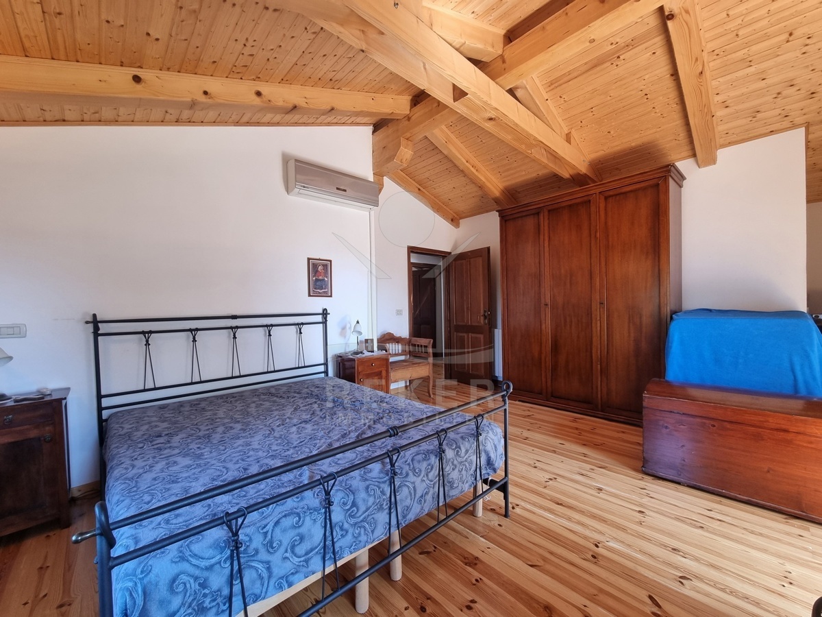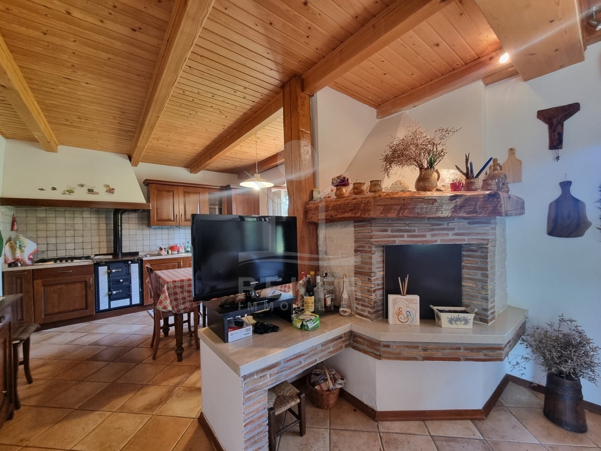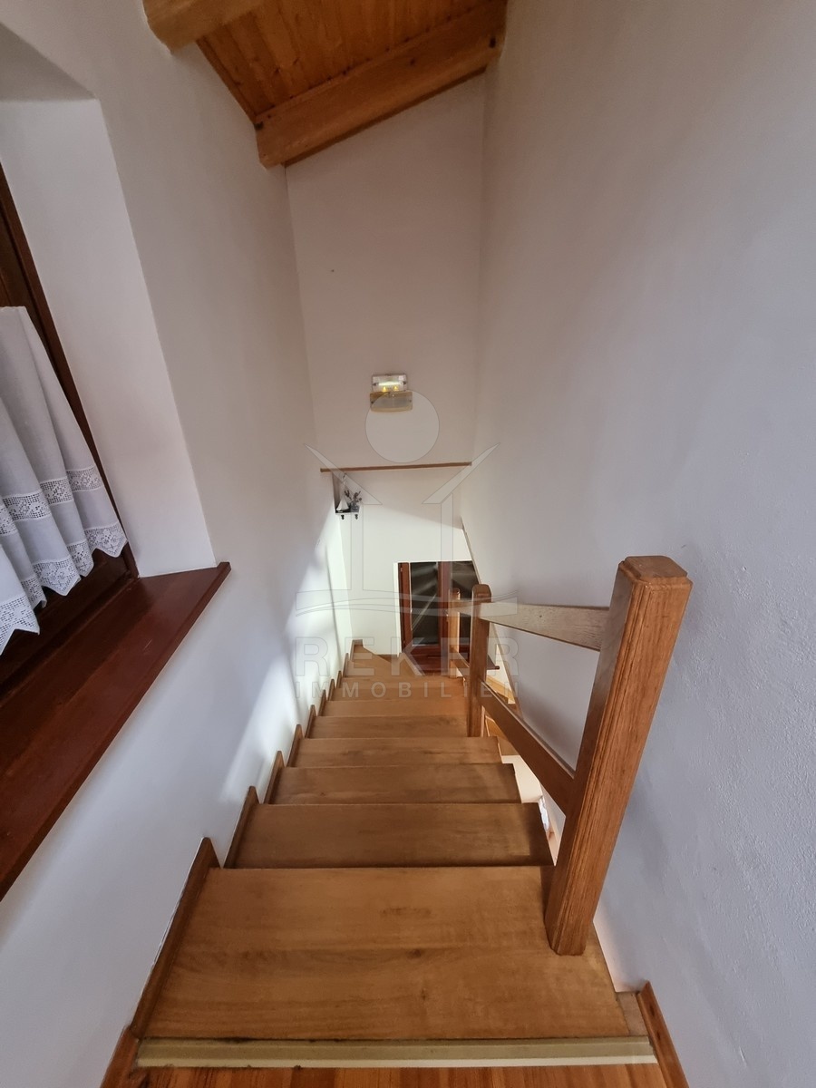 Innen wird es gemütlich. Sichtbare Holzdecken, Terrakottafliesen, offener Kamin und viel warmes Holz prägen das Bild. Im Erdgeschoss liegt der große Wohnraum mit offener Küche, Esstisch, Sofaecke und Kamin. Dazu ein Badezimmer, ein Schlafzimmer und praktische Abstellflächen. Über die Massivholztreppe geht es hinauf in den oberen Bereich: Zwei weitere Schlafzimmer, ein Balkon und das zweite Bad. Die Küche ist komplett ausgestattet, alles ist möbliert. Gaszentralheizung und Klimaanlage sorgen für Komfort – auch außerhalb der Sommermonate.