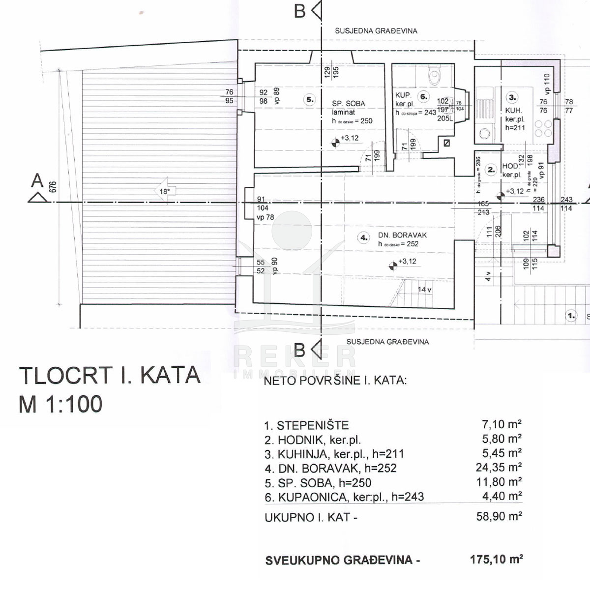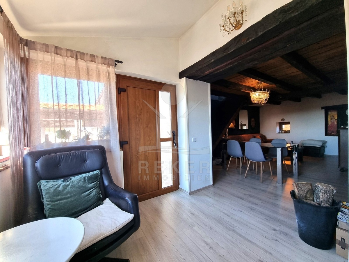 Die Außentreppe führt Sie in die zweite Wohnung, die über das erste Obergeschoss und den Dachboden verfügt. Das Obergeschoss bietet eine großzügige Nutz- und Wohnfläche von 60 m², eine Eingangshalle, eine Küche, ein Bad, ein Wohnzimmer, ein Esszimmer und ein Schlafzimmer.