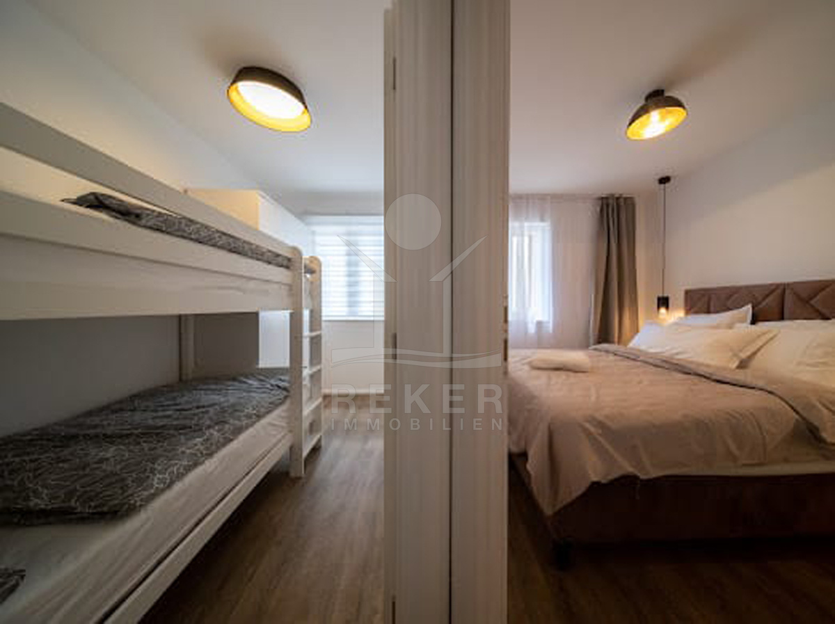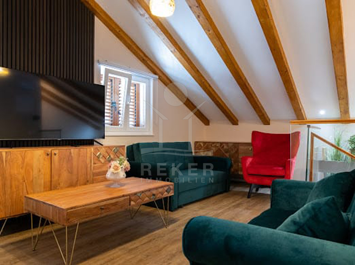 Das Raumkonzept passt. Unten ein Schlafzimmer und Bad – ideal für Gäste oder Ältere. Im ersten Stock: zwei weitere Schlafzimmer, Bad und eine kompakte Küche mit Essbereich. Oben im Dachgeschoss öffnet sich ein großzügiger Wohnraum mit viel Licht. Dazu ein großes Schlafzimmer mit eigenem Bad ... perfekt für Eltern oder als ruhiger Rückzugsort. Jeder Quadratmeter wirkt sinnvoll genutzt. Alles bereit für die nächste Urlaubssaison oder zum sofortigen Einziehen.