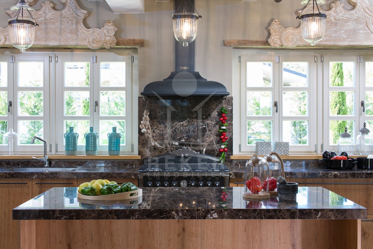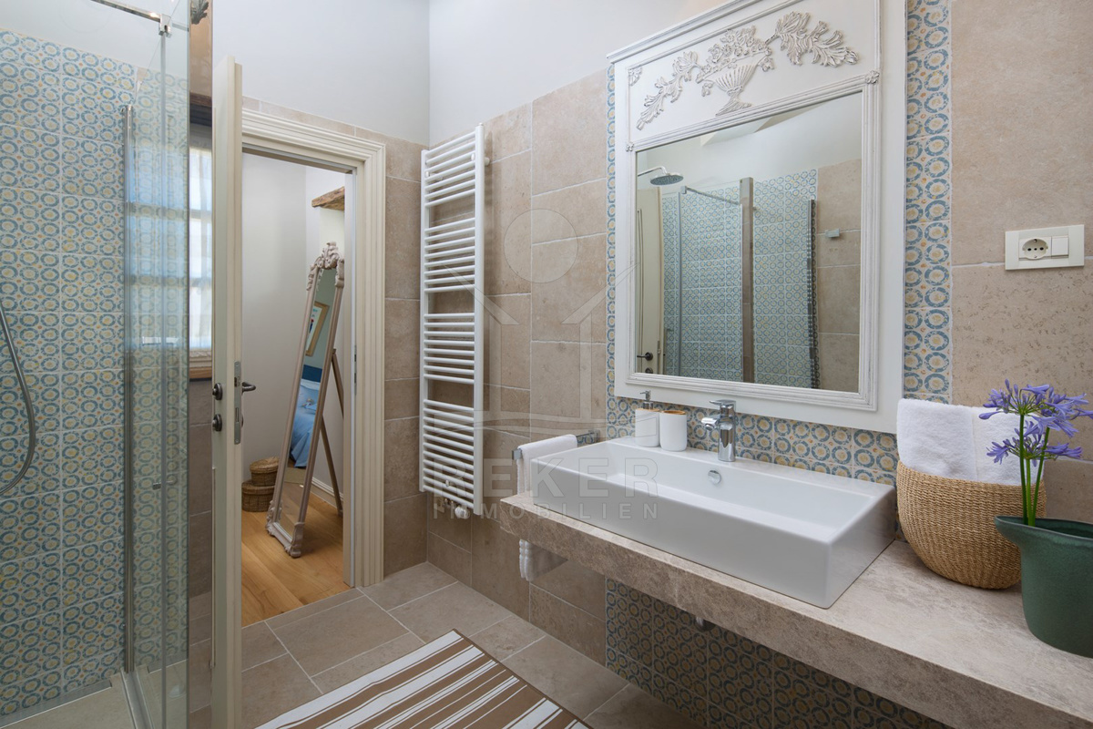 Die Villa besticht durch einen klassisch-eleganten Einrichtungsstil mit viel Holz, sichtbarem Mauerwerk und geschmackvoller Beleuchtung. Im Erdgeschoss laden ein offener Wohn-, Ess- und Kochbereich zum Verweilen ein. Ein Schlafzimmer mit Bad en suite sowie ein Gäste-WC im Außenbereich sorgen für Komfort. Zugang zur Terrasse und zum Pool bieten Möglichkeiten zur Entspannung im Freien.