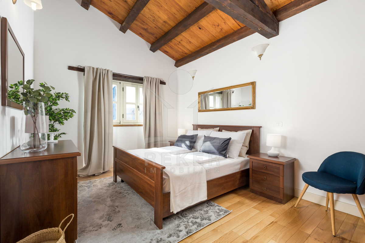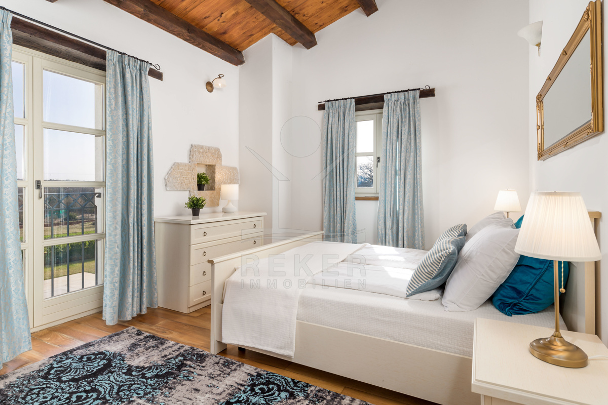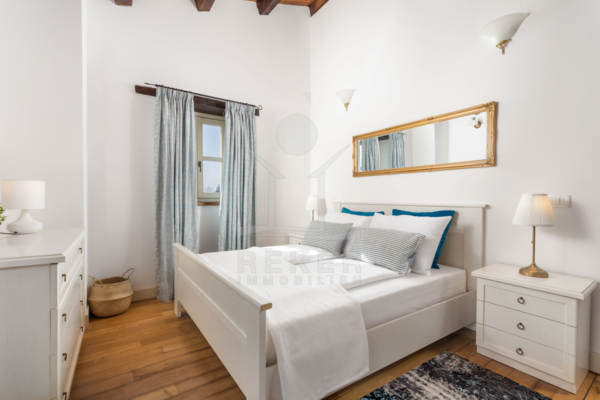 Drei helle und romantische Schlafzimmer biete die Steinvilla auf dieser Ebene, zudem verfügt jedes Zimmer über ein eigenes vollausgestattetes Bad und einem malerischen Ausblick in den Garten.