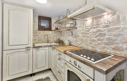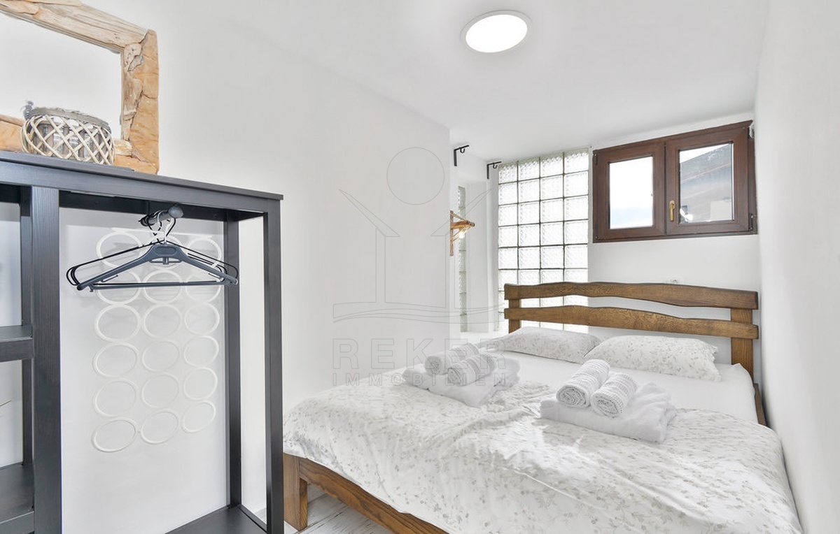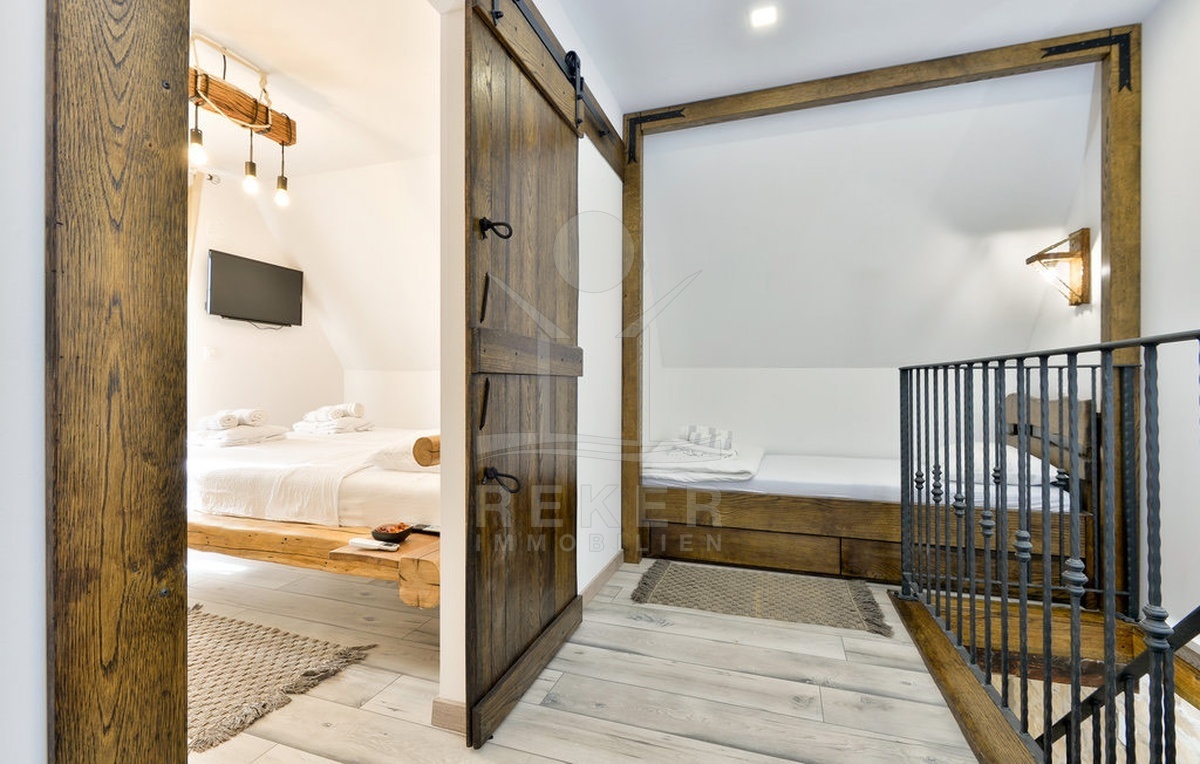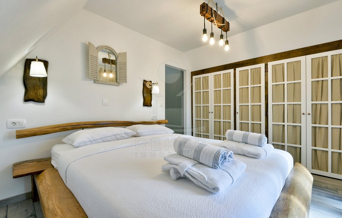 Im Inneren verbinden sich traditionelle Materialien und moderner Komfort. Das 2022 vollständig renovierte Haus erstreckt sich über drei Etagen mit insgesamt sechs Räumen: vier Schlafzimmer, ein geschmackvolles Badezimmer, ein großzügiges Wohnzimmer und eine offene Küche mit Essbereich. Eichenmöbel aus handwerklicher Fertigung setzen warme Akzente. Große Fenster öffnen den Blick auf die grüne Umgebung.
