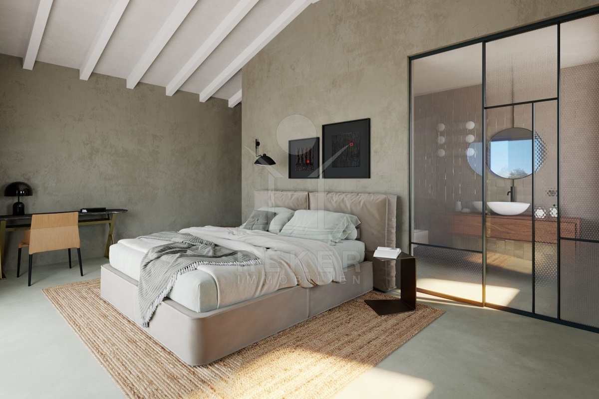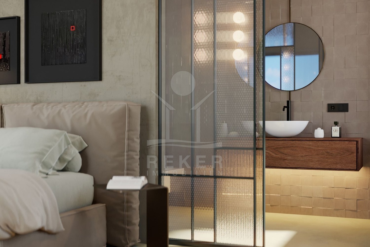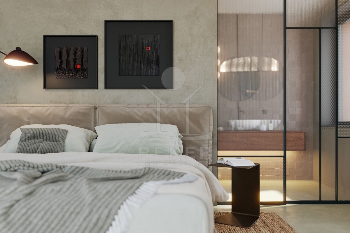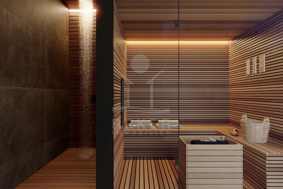 Im Erdgeschoss öffnet sich ein großer, heller Raum: Wohnen, Kochen, Essen – alles in einem. Große Glasflächen bringen Licht, die Küche ist modern, das Sofa gemütlich. Daneben: ein Gäste-WC, der Technikraum und – das Highlight – eine finnische Sauna. Im Obergeschoss: zwei Schlafzimmer, jedes mit eigenem Bad. Vom größeren Zimmer geht es direkt auf den Balkon. Alles ist hochwertig möbliert – von Holz bis Leuchte. Und: Alles bleibt im Haus. Einfach einziehen.