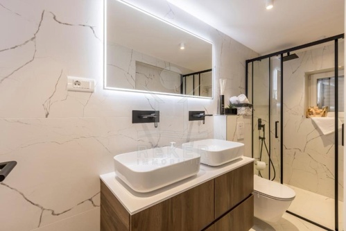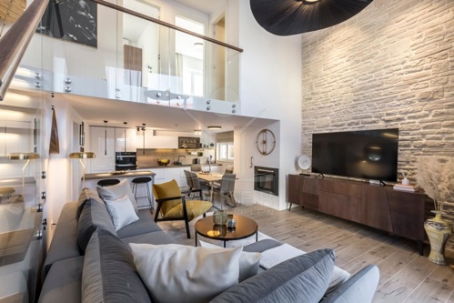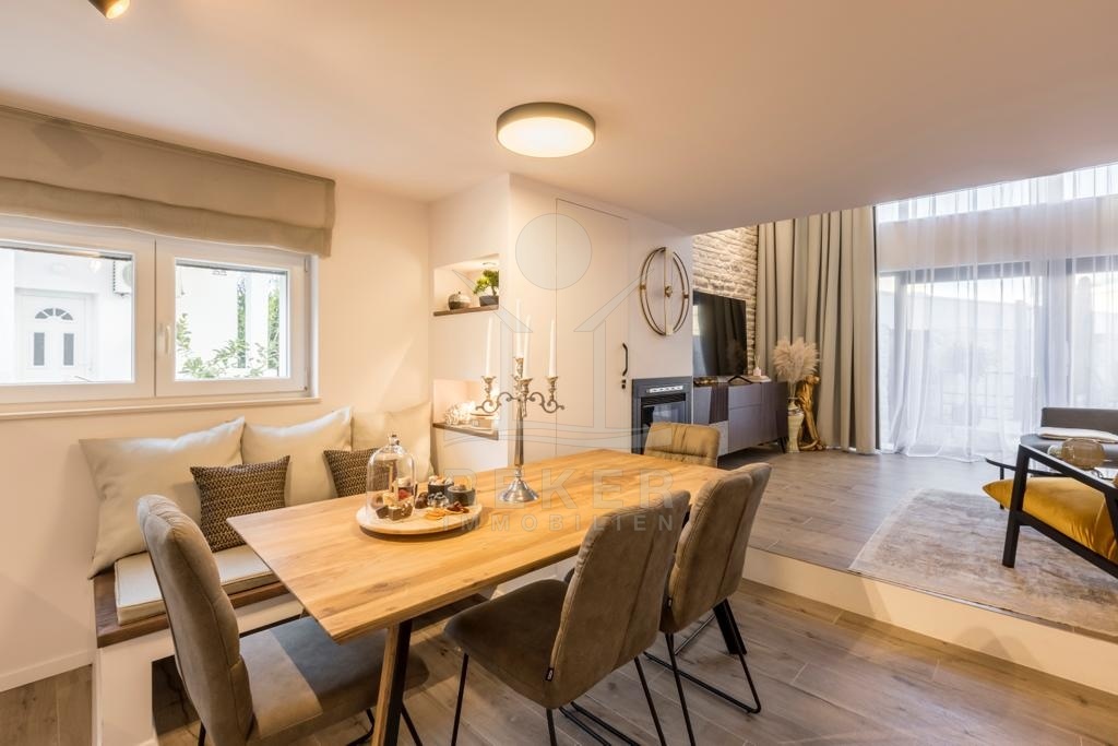Im Erdgeschoss finden Sie ein Badezimmer, das Wohnzimmer mit offener Küche und Essbereich. Ein Kamin und die Klimaanlage schaffen eine zu jederzeit perfekt temperierte Wohlfühl-Oase.
