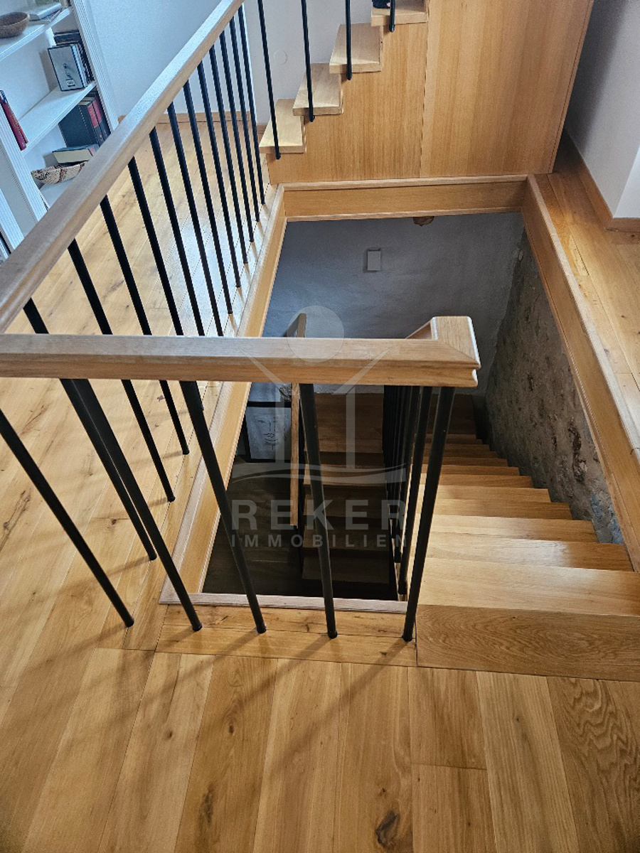 Das charmante Haus erstreckt sich über drei Etagen, die durch einladende Holztreppen miteinander verbunden sind. Die Holztreppen und die sichtbaren Holzbalken schaffen eine warme und gemütliche Atmosphäre, die das gesamte Haus durchzieht.