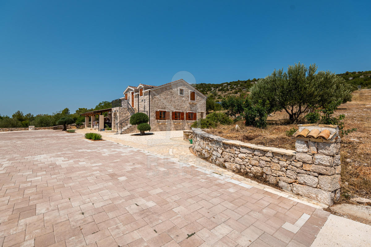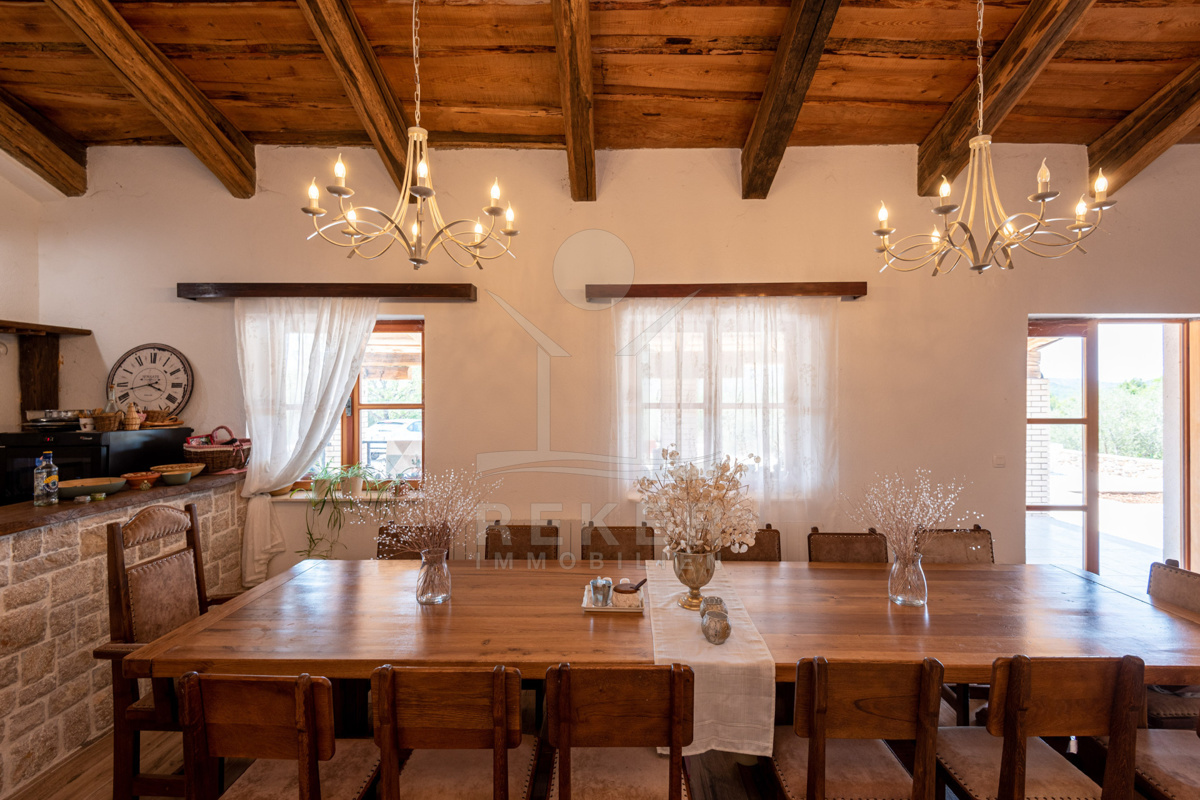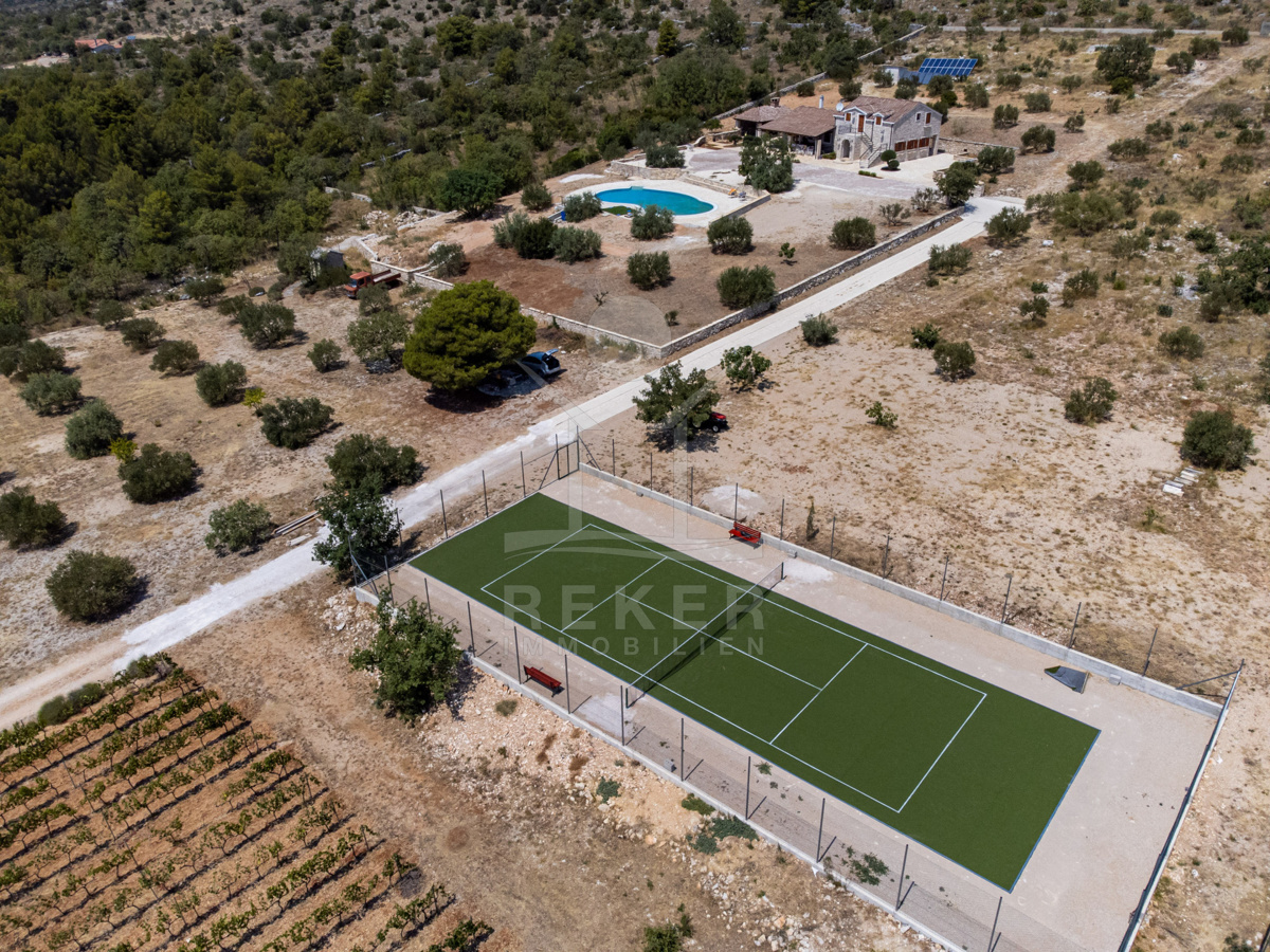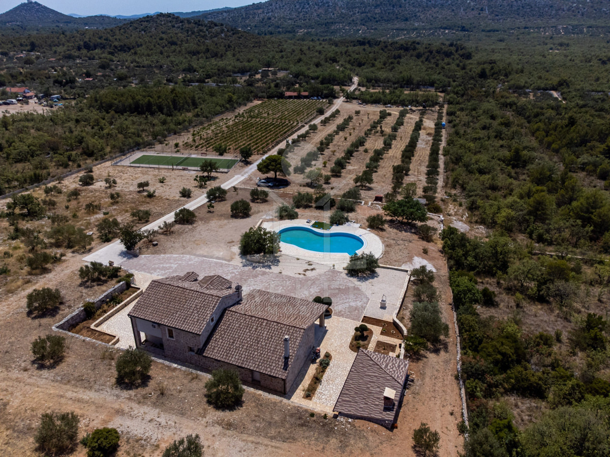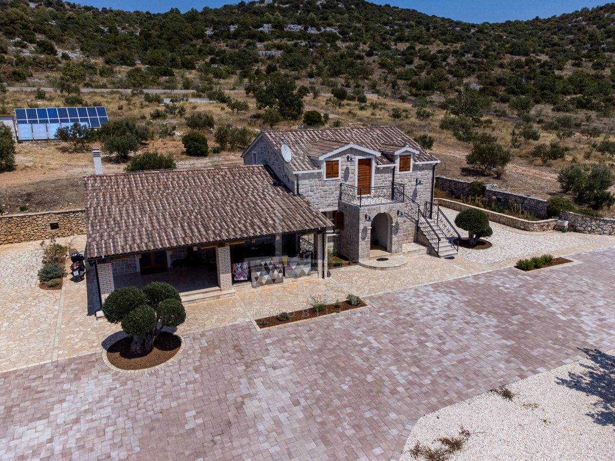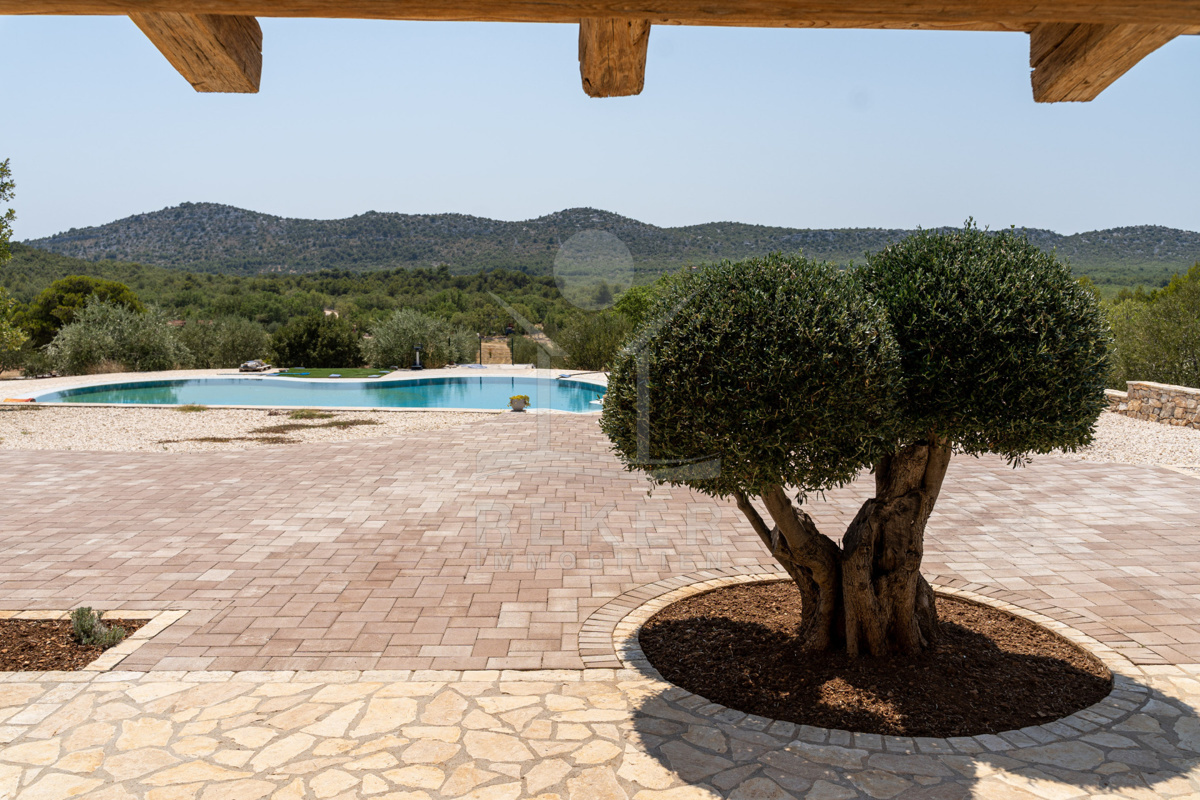 Die Steinhausvilla liegt eingebettet in eine malerische und natürliche Umgebung, umgeben von sanften, bergigen Landschaften. Ruhe und Erholung finden Sie hier inmitten der unberührten Natur. Das Anwesen liegt etwa 7 km vom Meer und den Stränden von Vodice entfernt, während das lebendige Zentrum der Stadt in 6 km erreichbar ist. In unmittelbarer Nähe befinden sich ein Lebensmittelgeschäft sowie Restaurants und Cafés für Ihren täglichen Bedarf. Die Küstenstadt Vodice selbst besticht durch ihre fast 4 km lange Uferpromenade und die malerische Altstadt, in der Sie das mediterrane Flair genießen können. Die flach abfallenden Kieselstrände wie die Plava Plaza bieten ideale Bedingungen für Familien und Wassersportliebhaber. Entlang der Riviera von Vodice erwarten Sie weitere schöne Strände und Buchten, die zum Erkunden einladen. Abends können Sie in den Restaurants entlang der Uferpromenade die köstliche dalmatinische Küche probieren und den Blick auf den großen Yachthafen von Vodice genießen. Die luxuriöse Steinhausvilla vereint exklusiven Wohnkomfort mit der Naturverbundenheit Dalmatiens und bietet somit ein einzigartiges Wohnerlebnis.