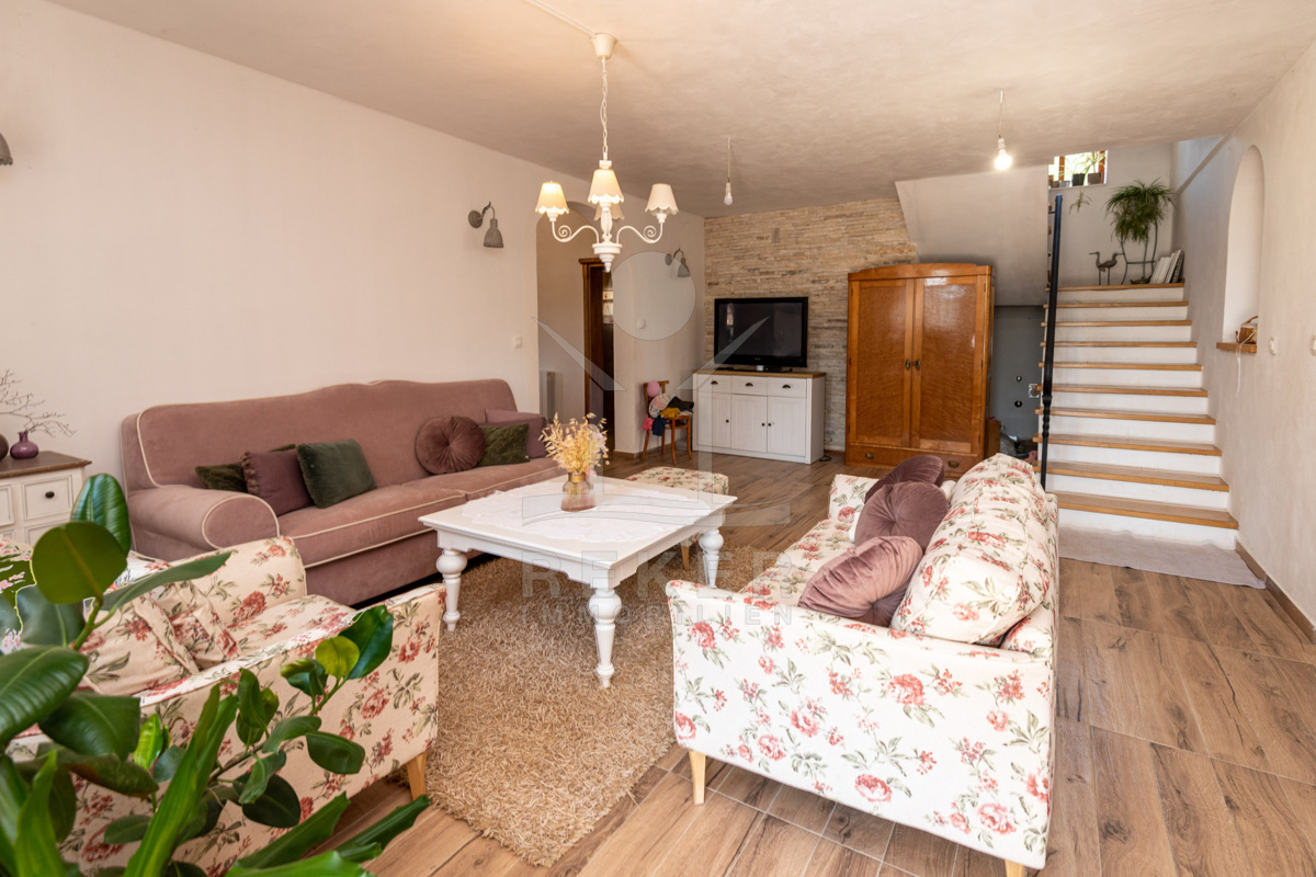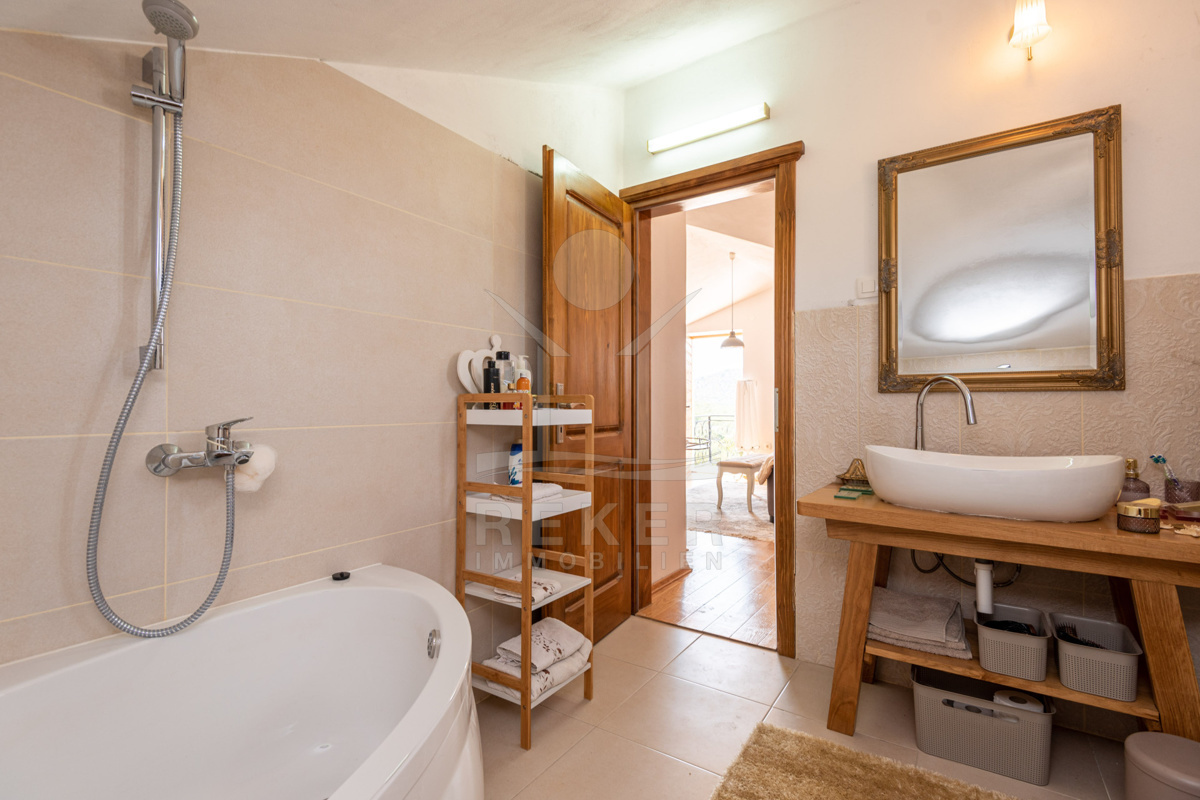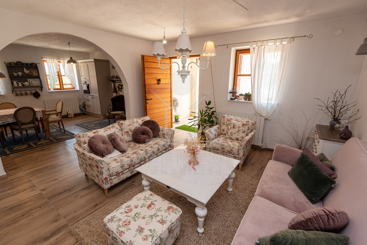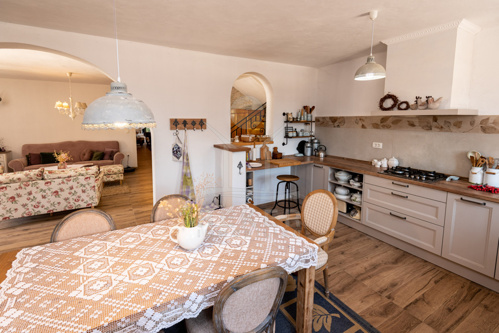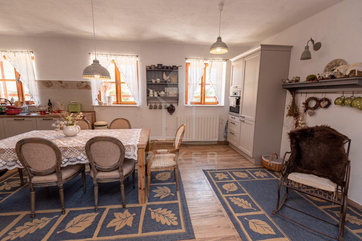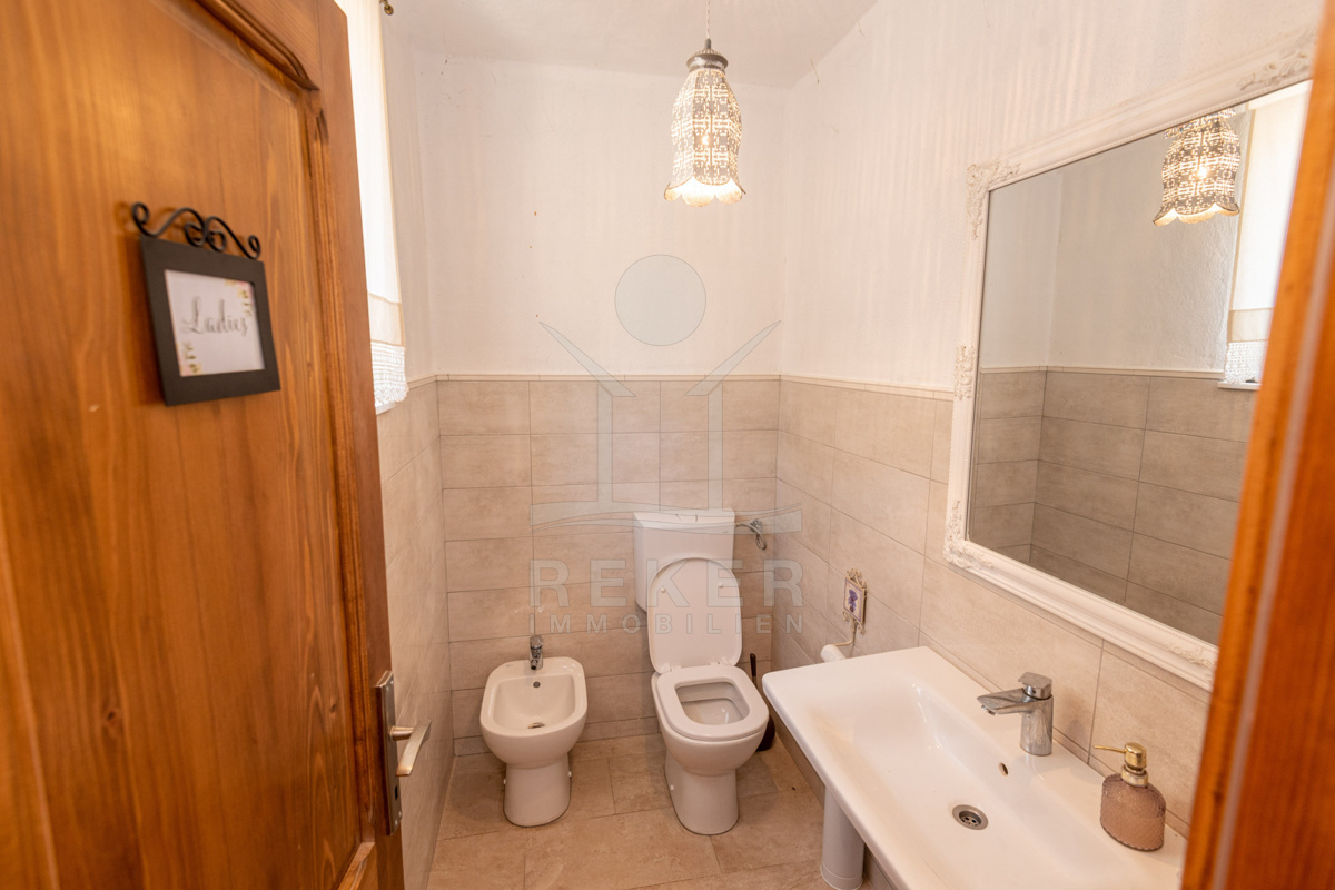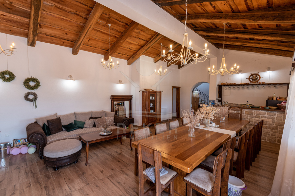 Die Villa wird vollständig möbliert verkauft und bezaubert im Erdgeschoss mit einer einladenden rustikalen Taverne für gesellige Zusammenkünfte, zwei WC-Bereichen sowie einem Wohn-Ess- und Küchenzimmer mit einem wunderbaren Ambiente.