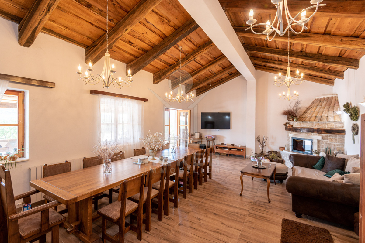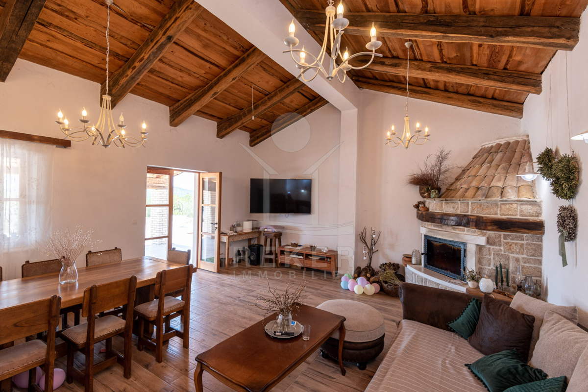 Die großzügige Außenanlage der Villa lädt zum Entspannen ein und umfasst einen Pool (20 m²), eine überdachte Terrasse, einen rustikalen Steingrill, eine Outdoorküche und gemütliche Sitzbereiche im Freien. Dieser Rückzugsort bietet pure Erholung und Genuss. Mit einem Parkplatz für mindestens 7 Fahrzeuge ist auch für die nötige Mobilität und Komfort inmitten der malerischen Landschaft gesorgt.